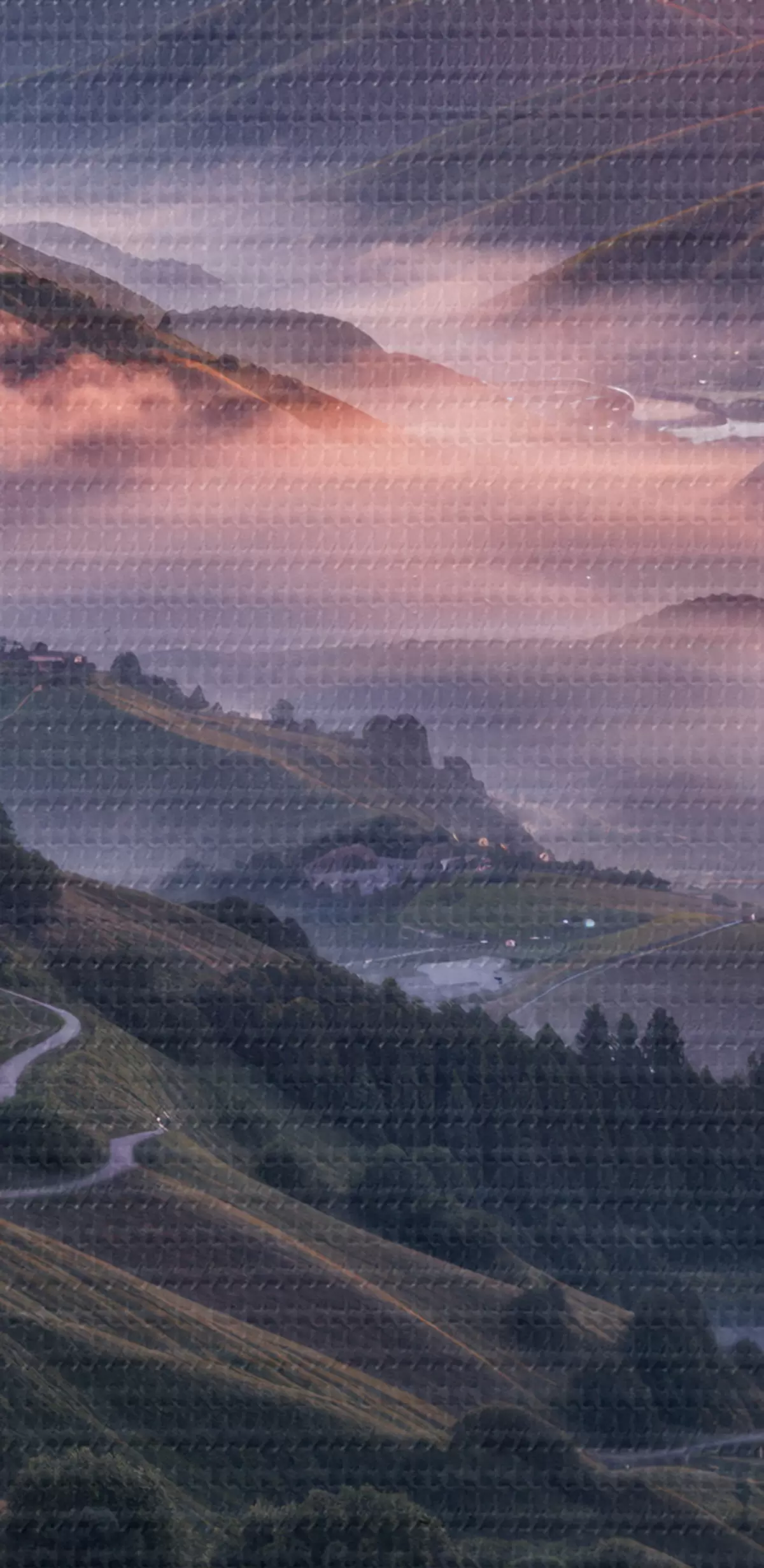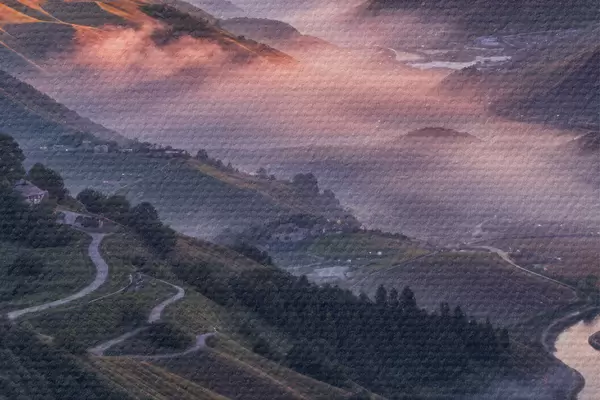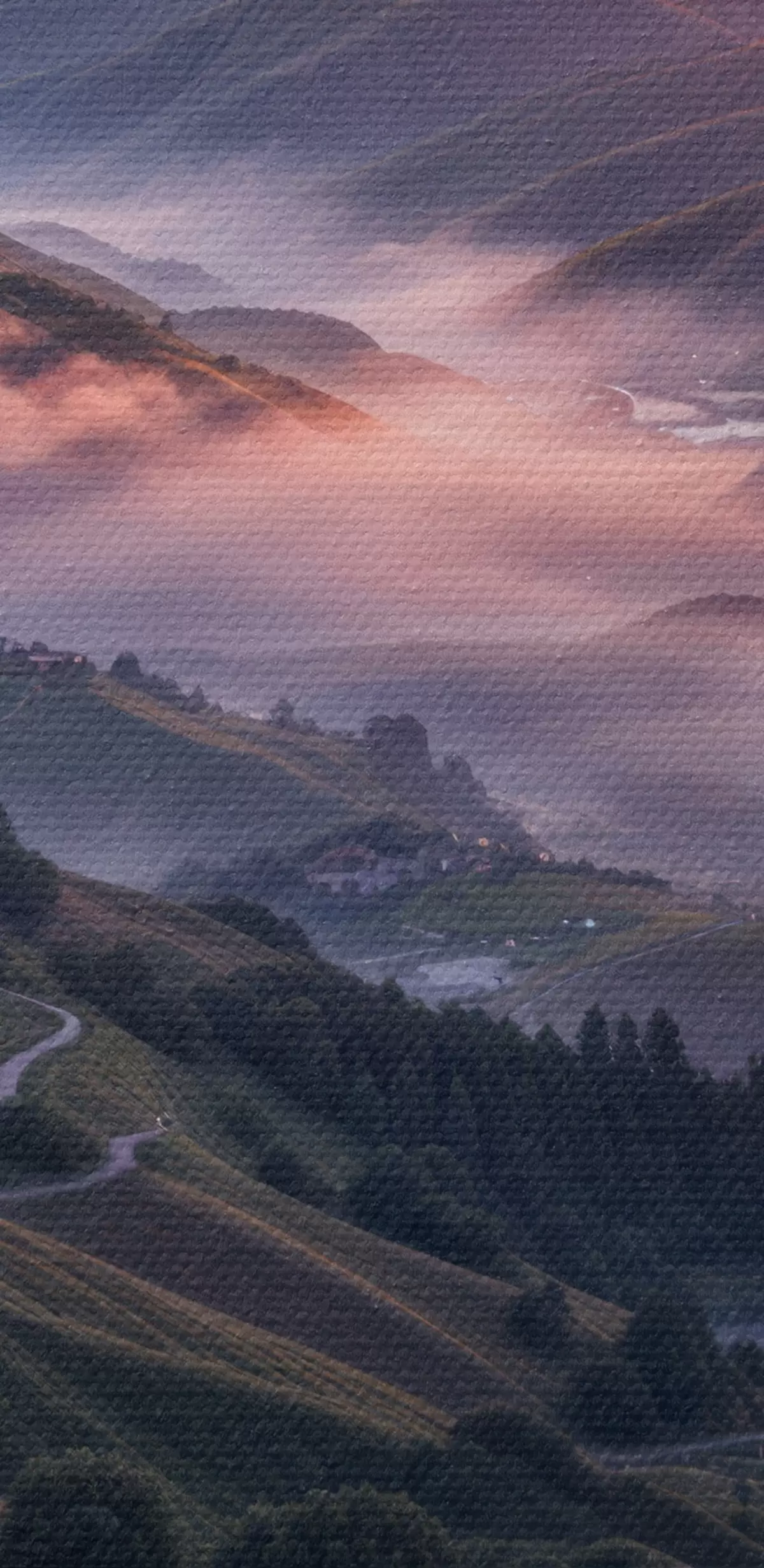 Foto Impresionante paisaje con una vívida puesta de sol sobre una región montañosa con racimos de flores rosas Nr r41263