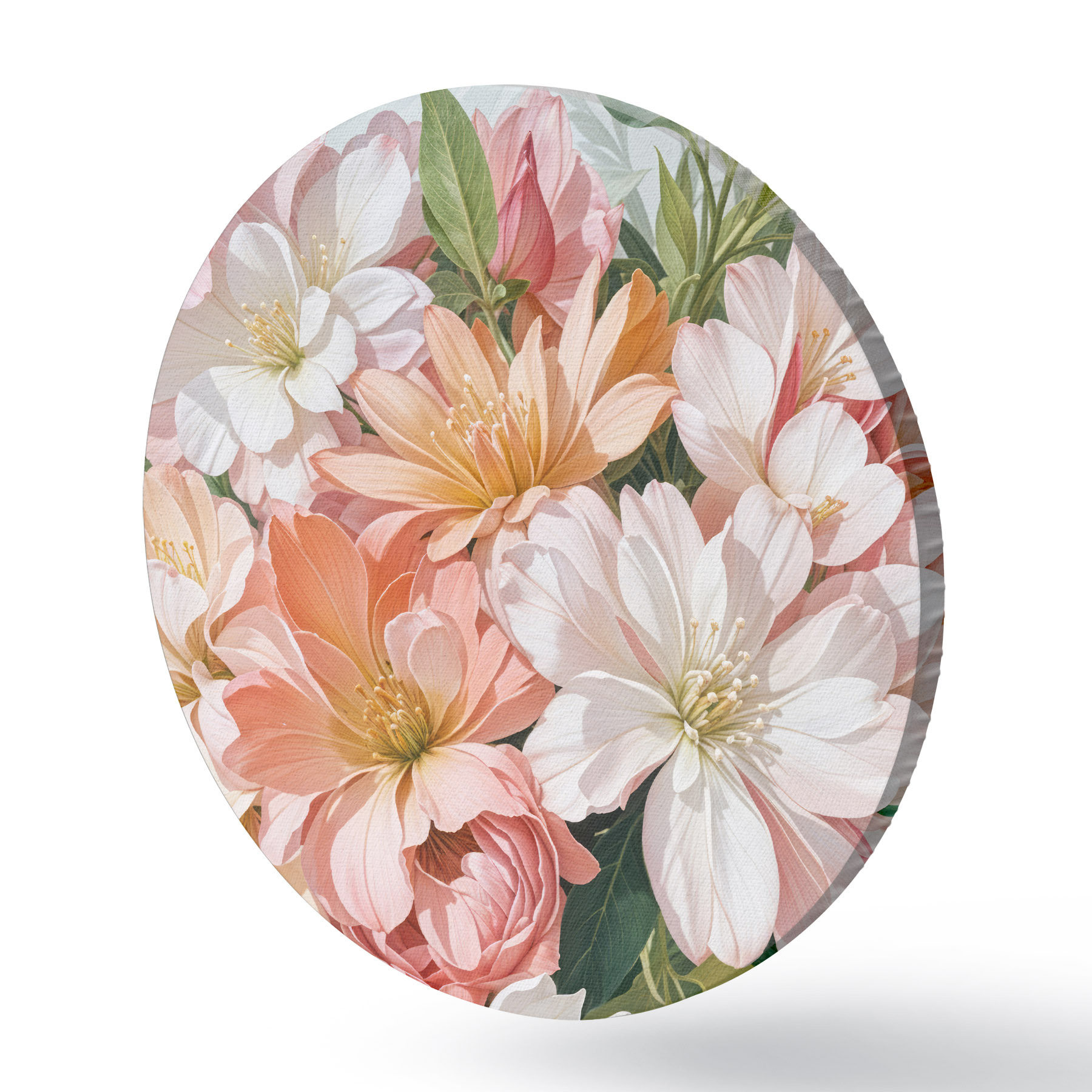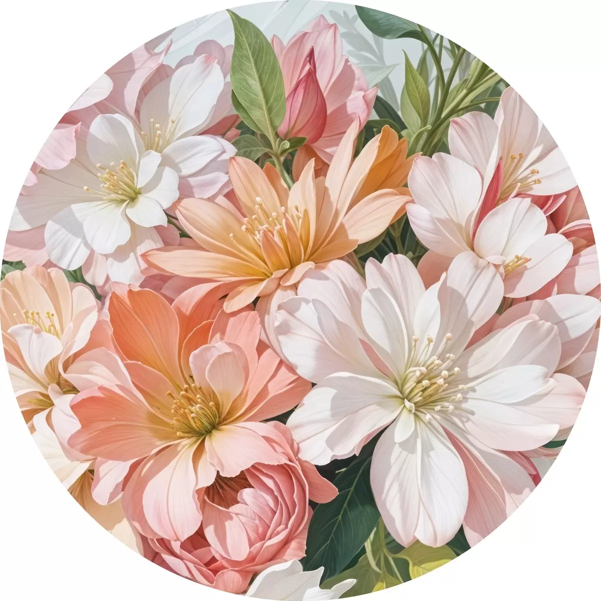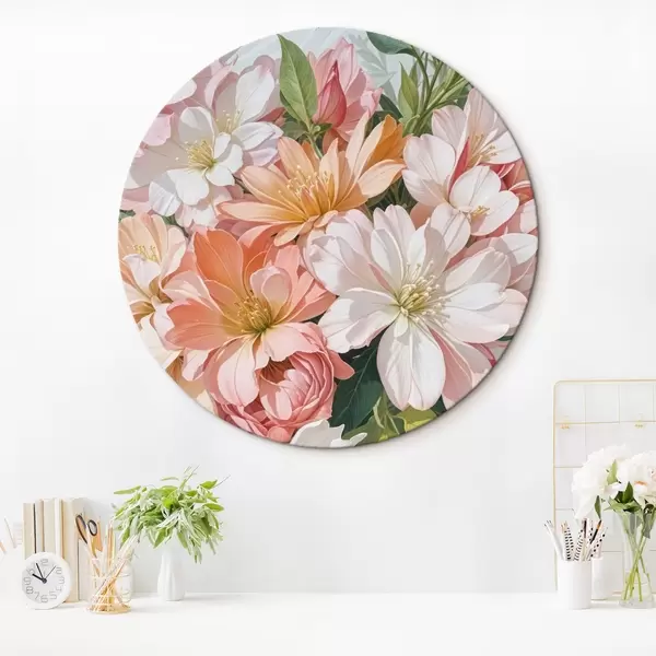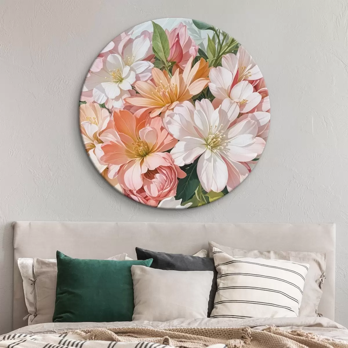 Cuadros redondos Vivo ramo de grandes flores de dalia rosa, blanca y naranja con hojas verdes sobre un delicado fondo rosa r41267