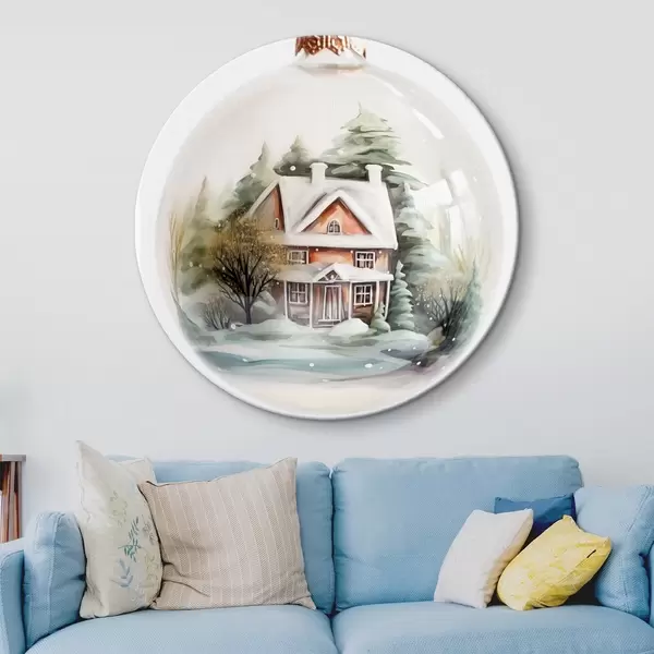 Cuadros redondos Bola de cristal con casa de acuarela y árboles en la nieve r41365