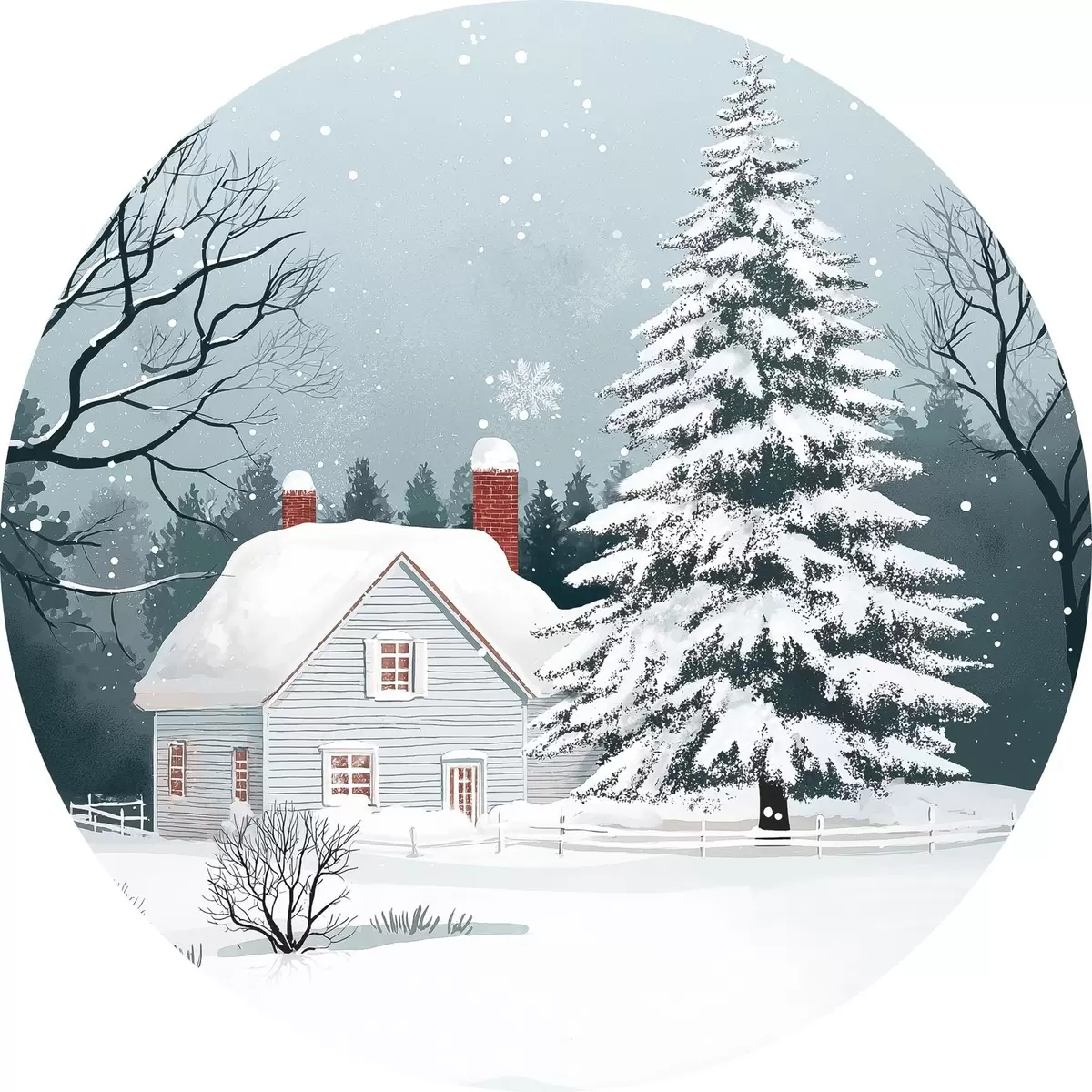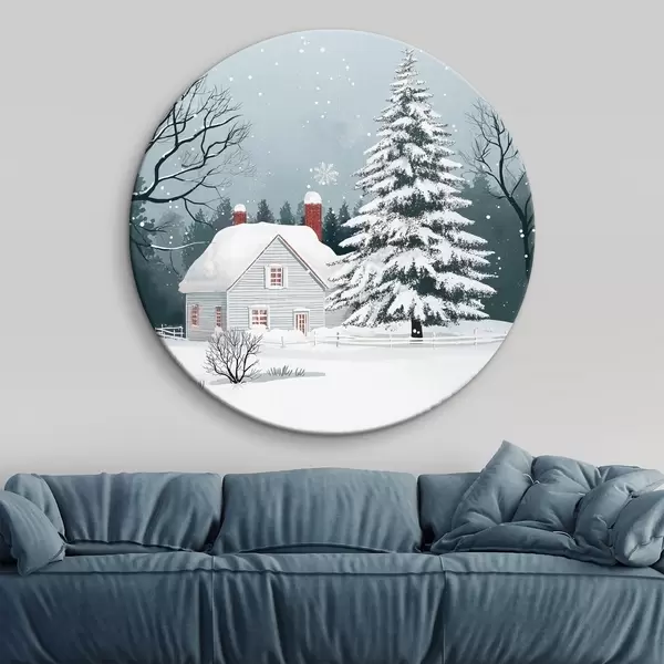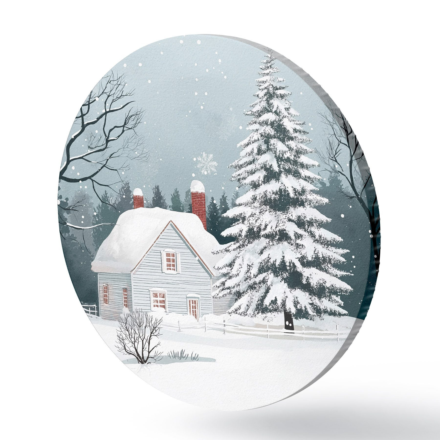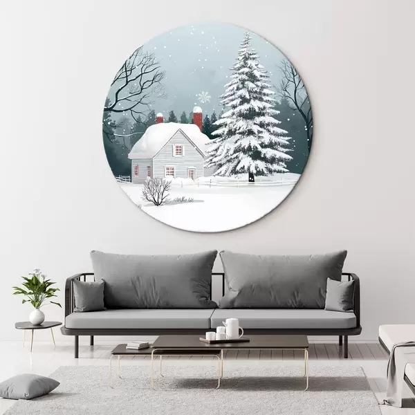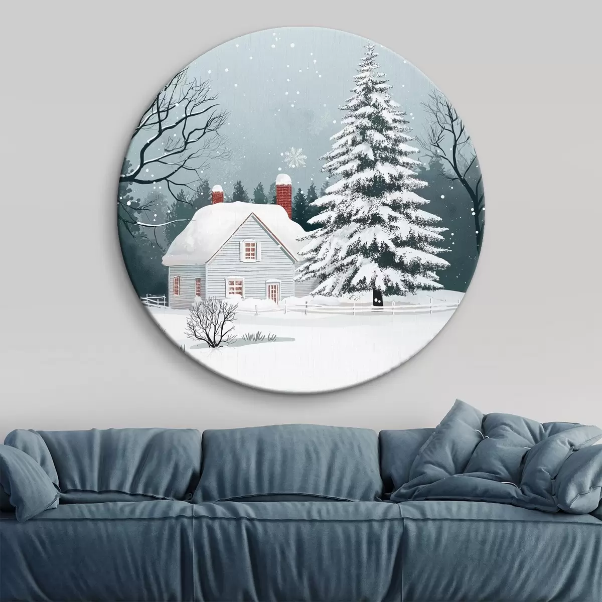 Cuadros redondos Escena invernal con casa cubierta de nieve, bosque, pinos r41369