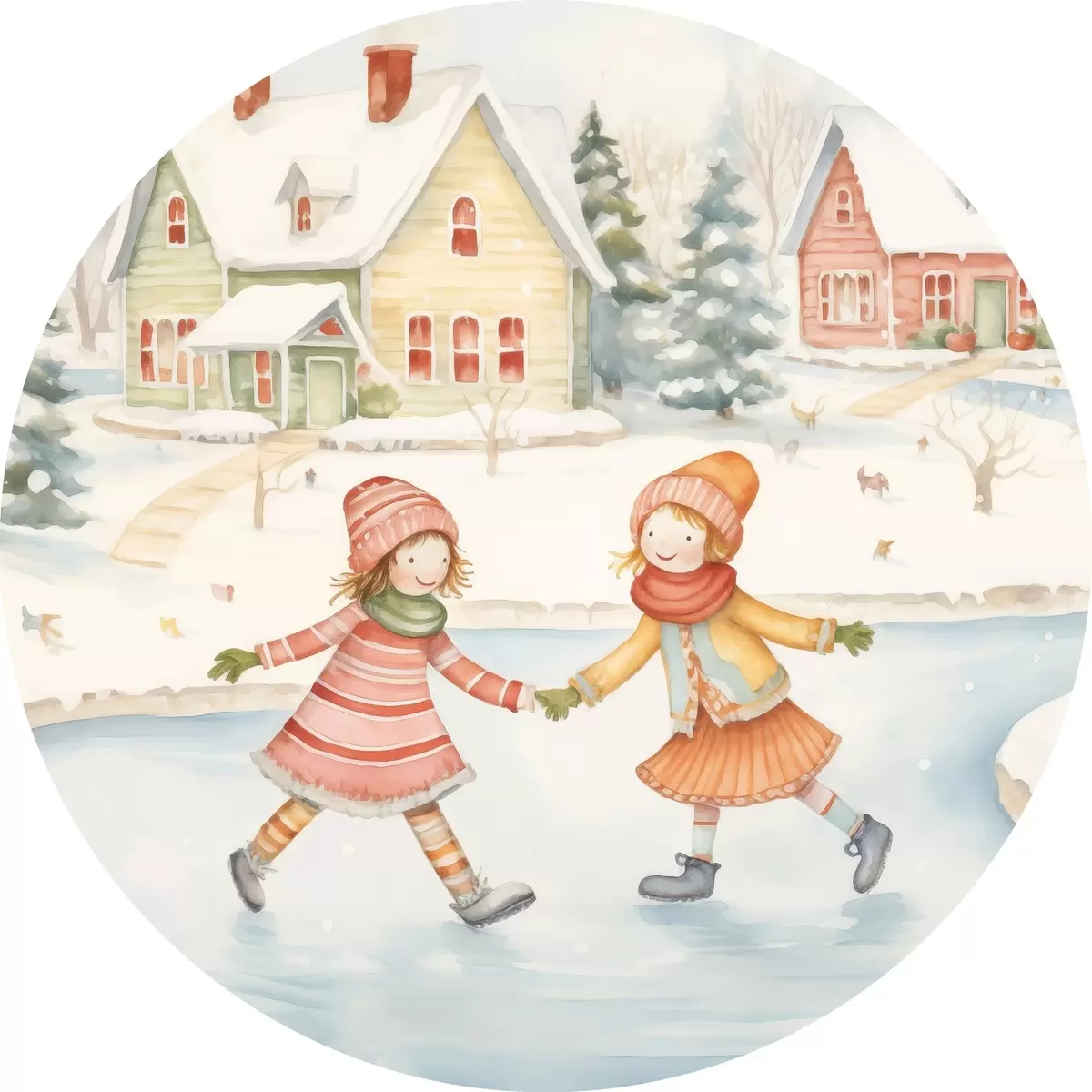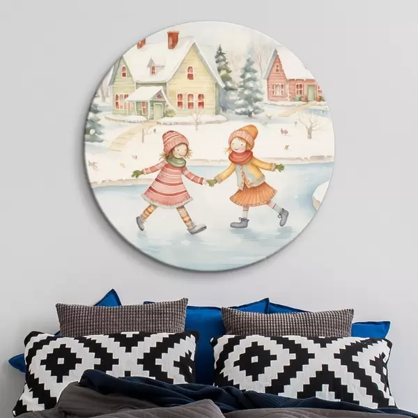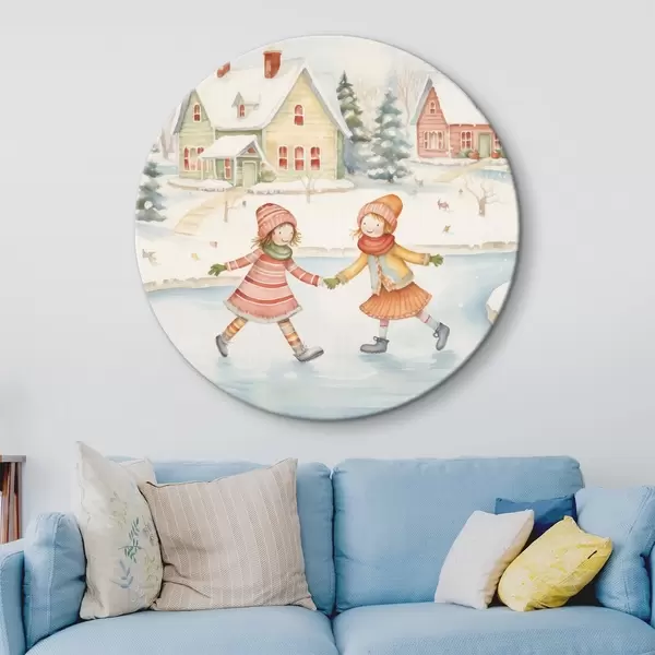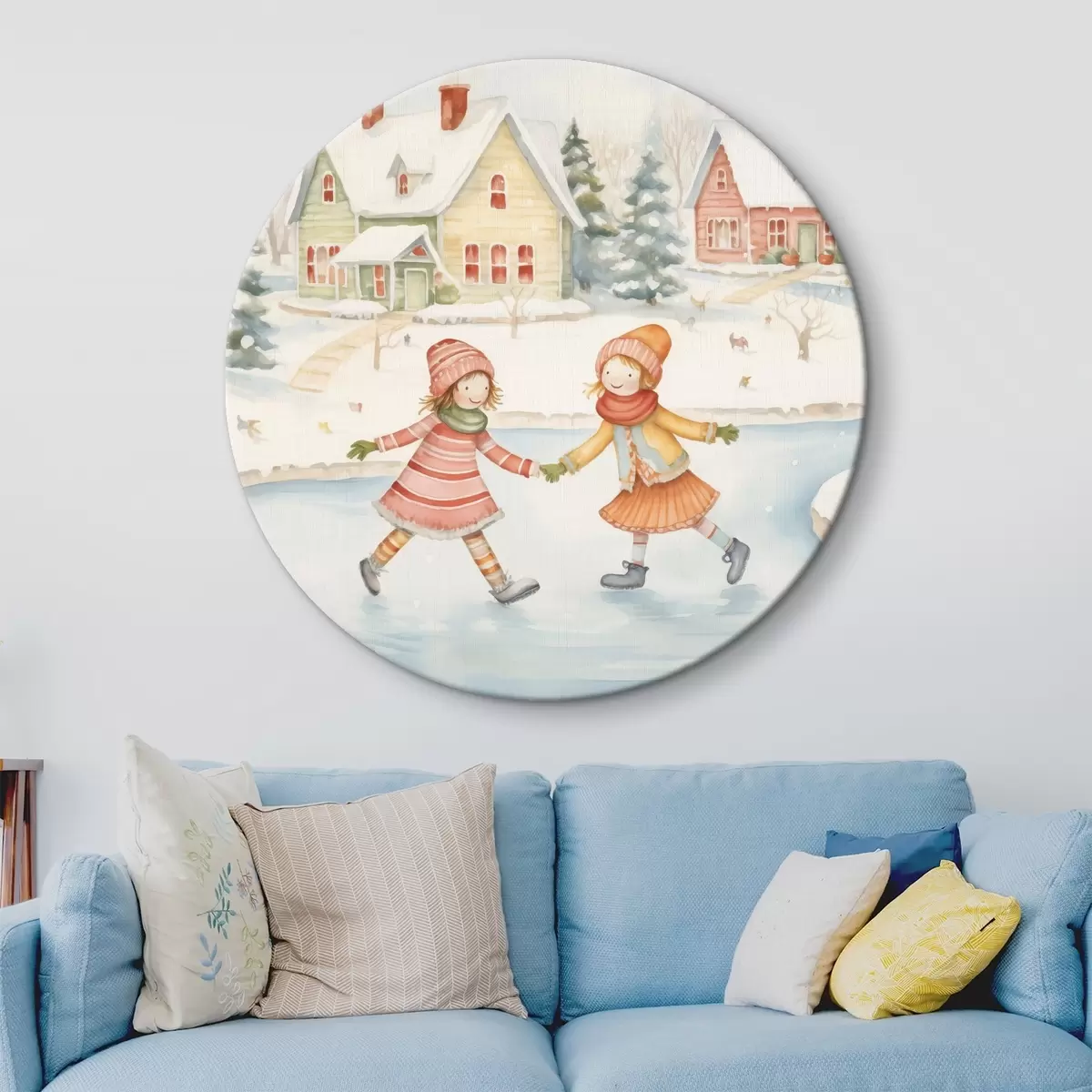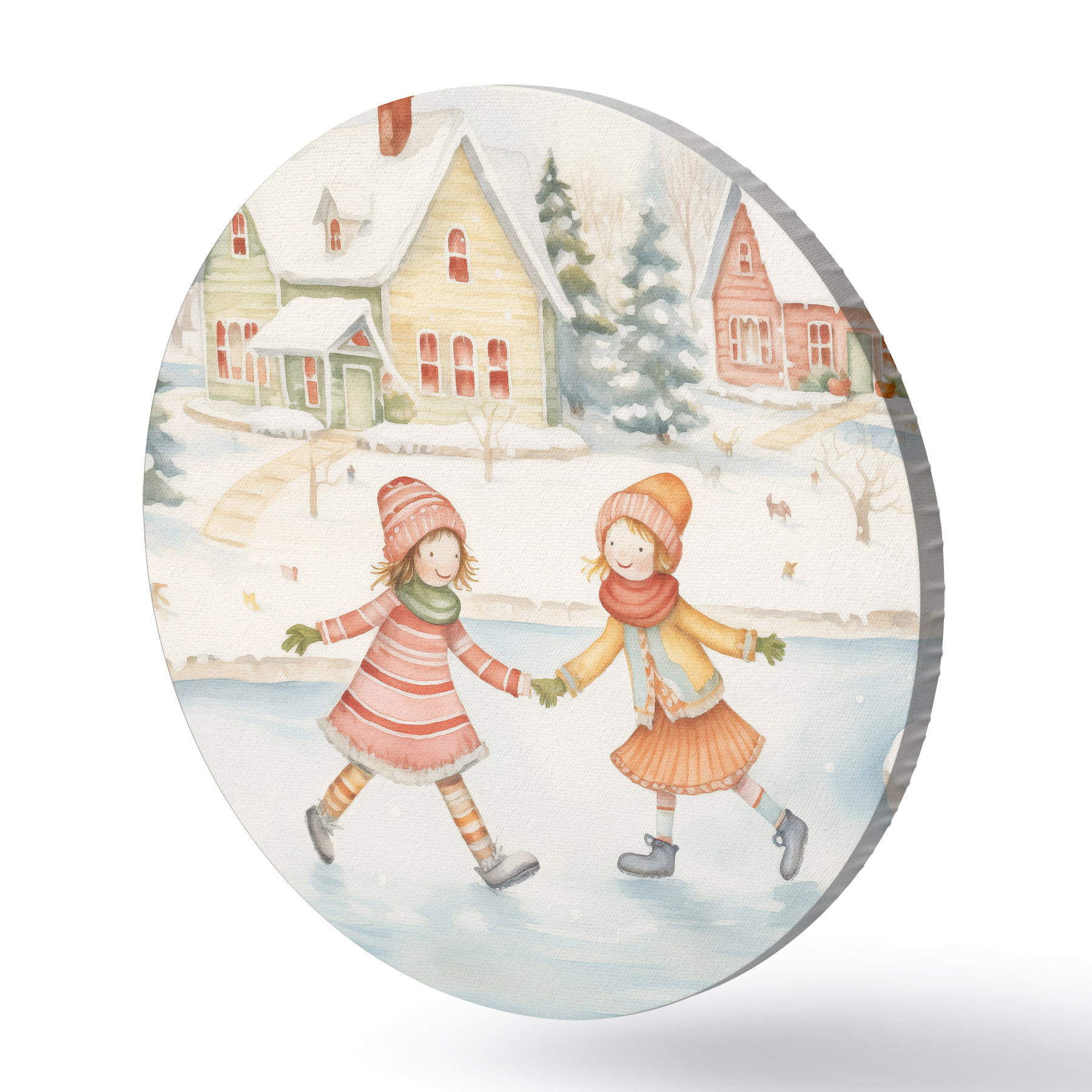 Cuadros redondos Escena invernal con dos chicas patinando, ciudad invernal, casas, bosque r41377