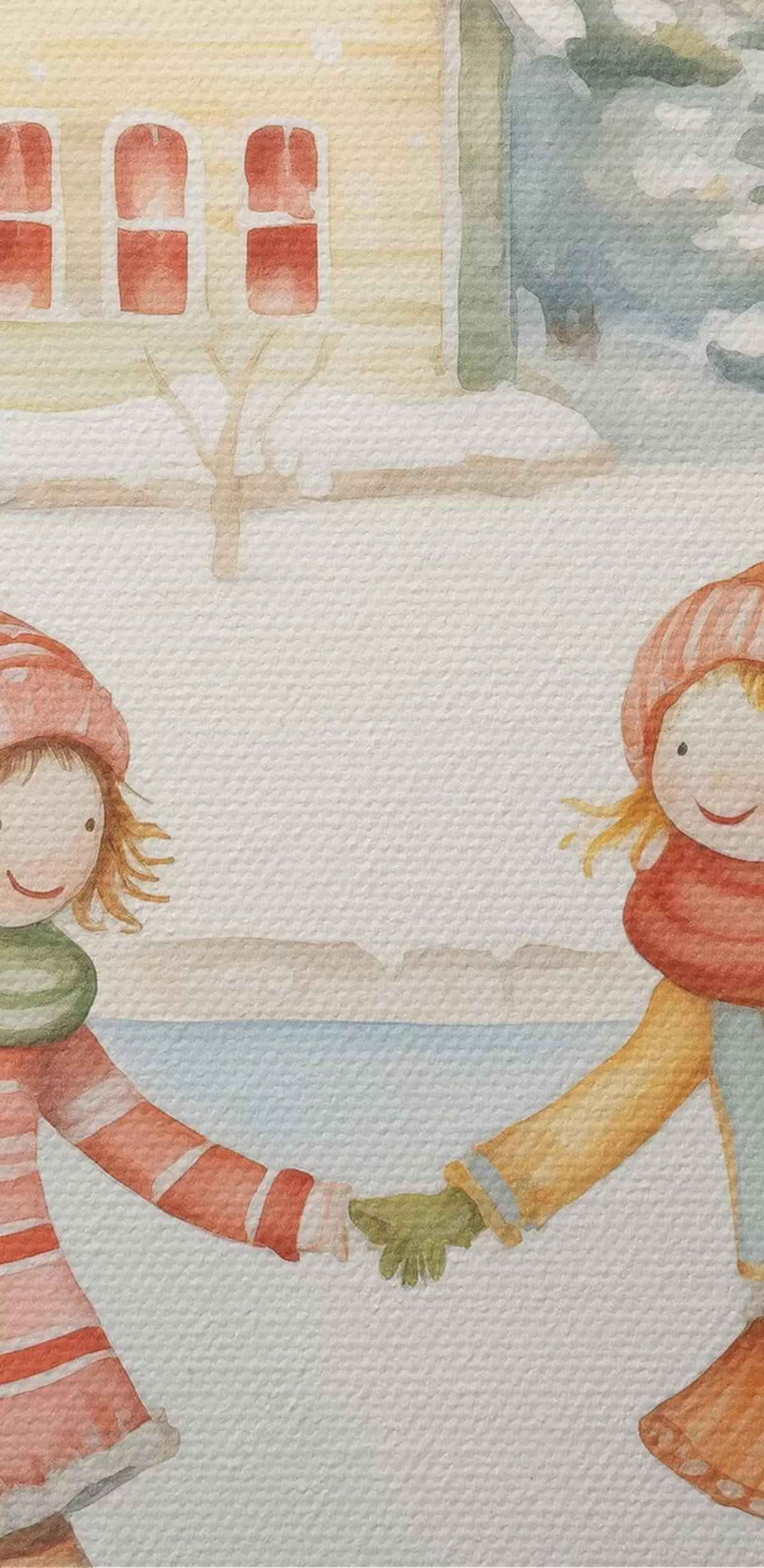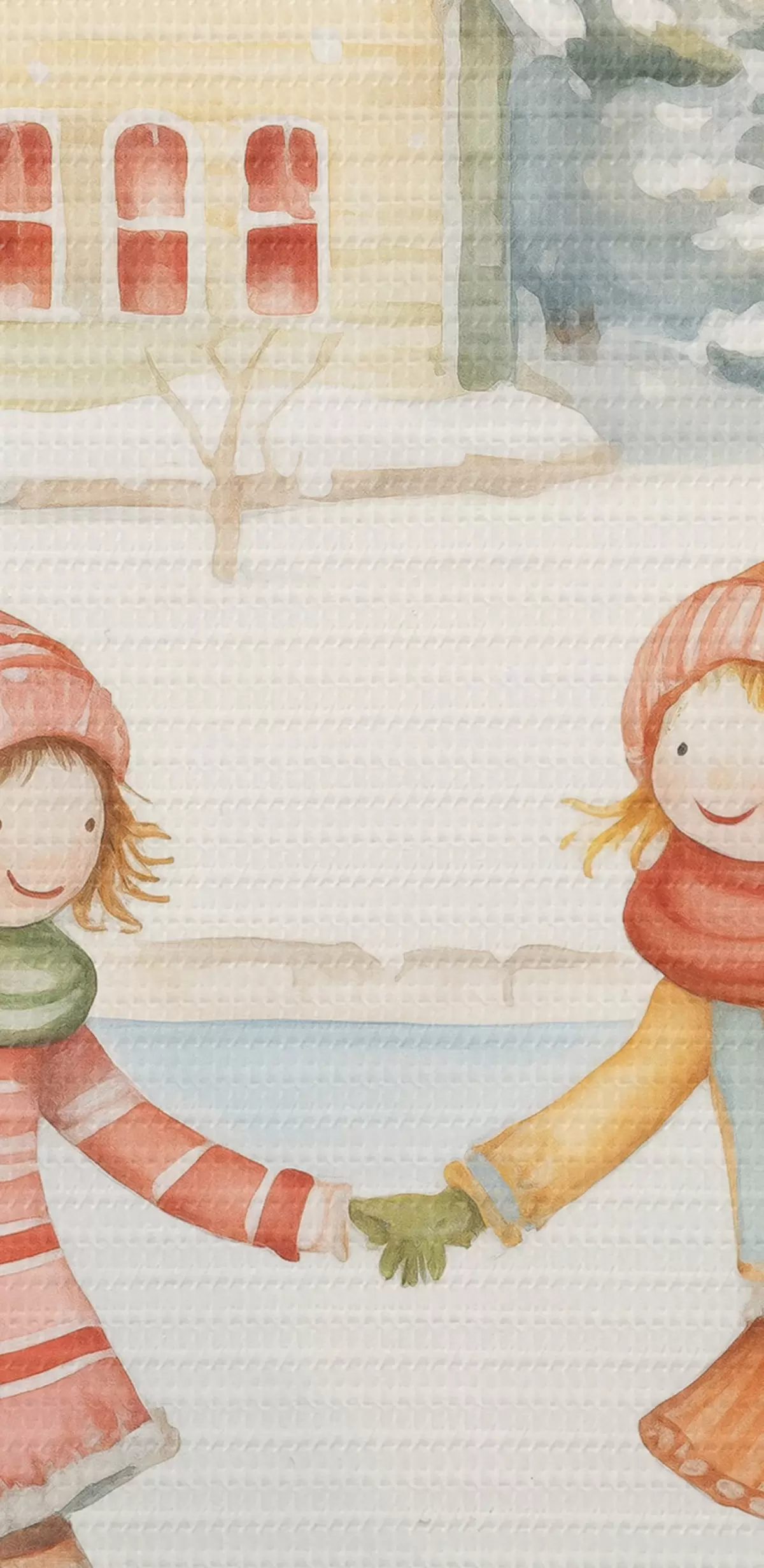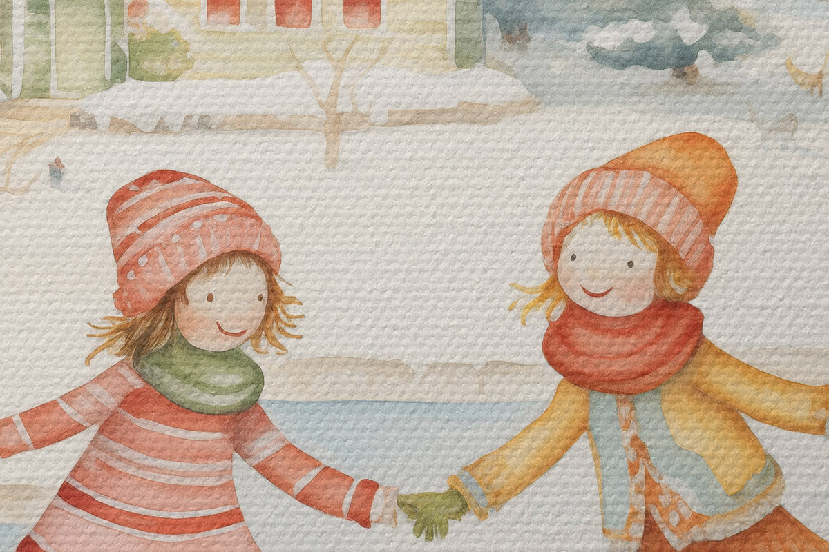 Foto Escena invernal con dos chicas patinando, ciudad invernal, casas, bosque Nr r41377