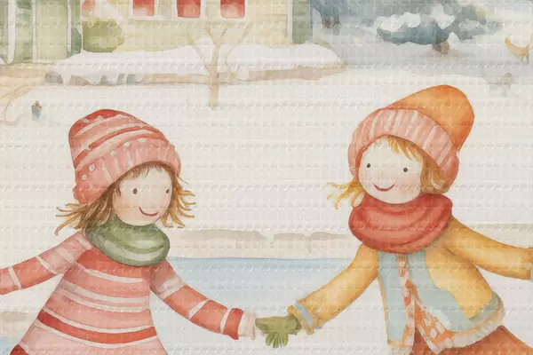 Foto Escena invernal con dos chicas patinando, ciudad invernal, casas, bosque Nr r41377