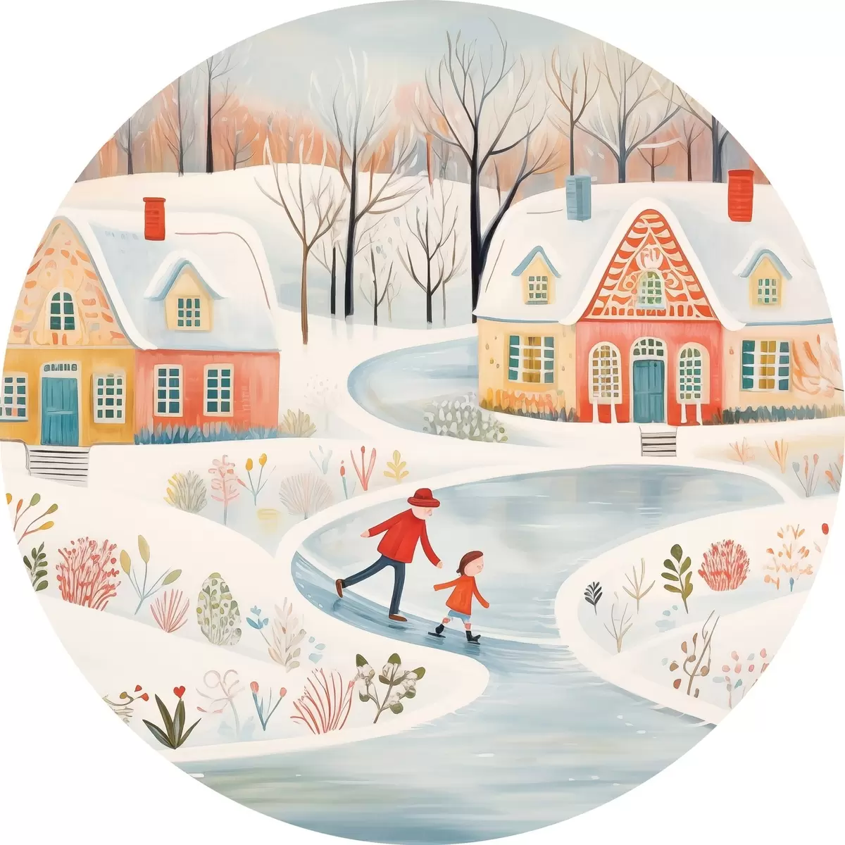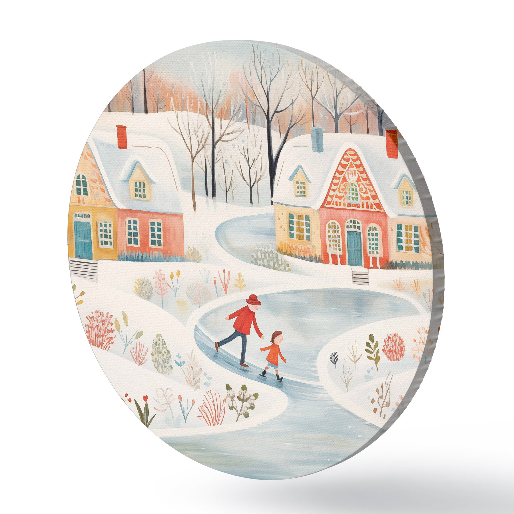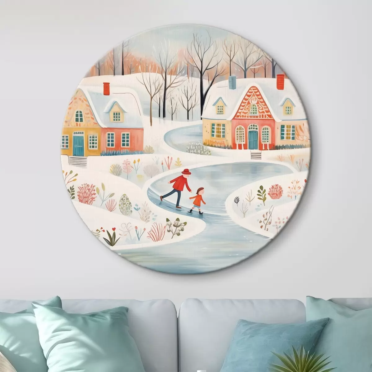 Cuadros redondos Pueblo de invierno, bosque, flores, patines de hielo, casas de colores r41378