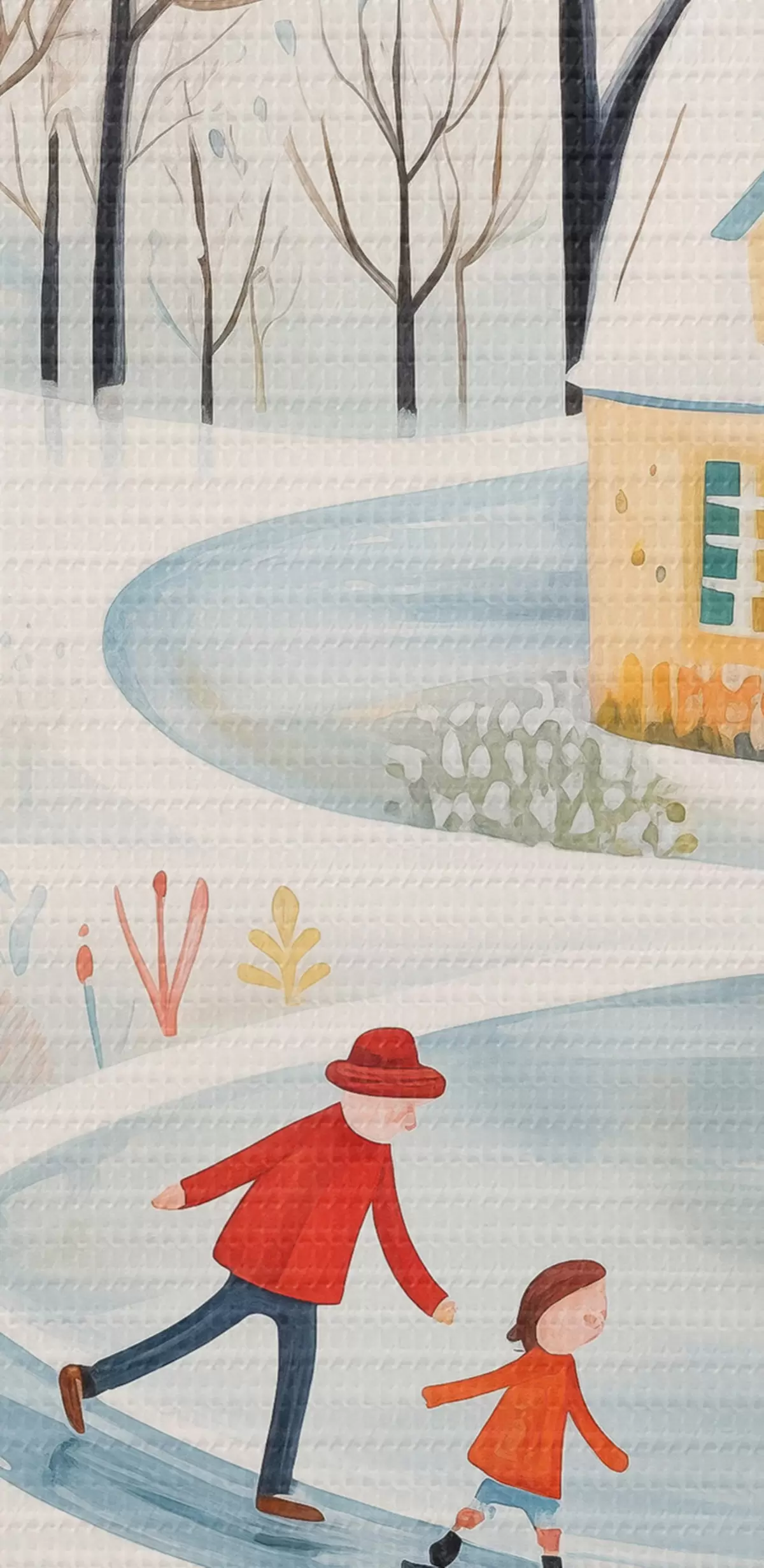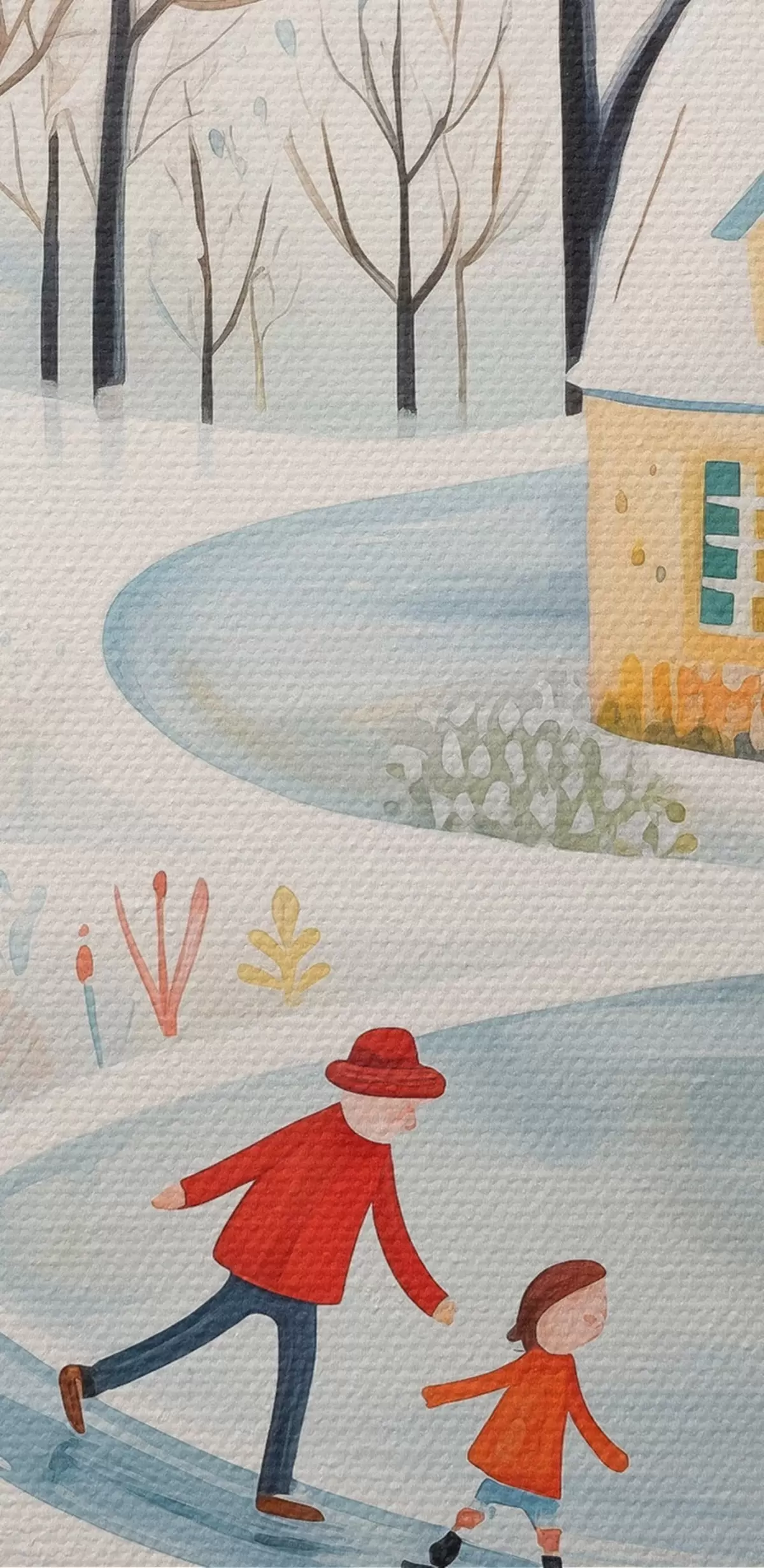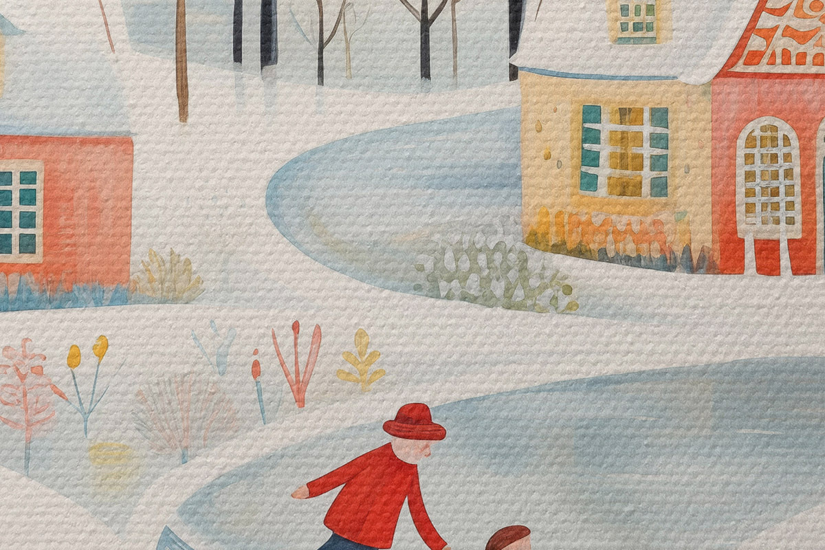 Foto Pueblo de invierno, bosque, flores, patines de hielo, casas de colores Nr r41378