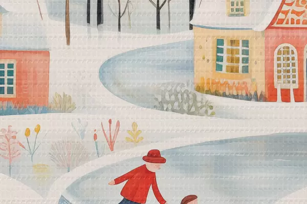 Foto Pueblo de invierno, bosque, flores, patines de hielo, casas de colores Nr r41378