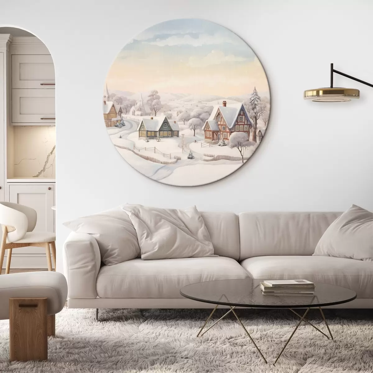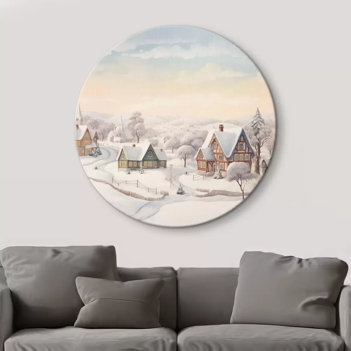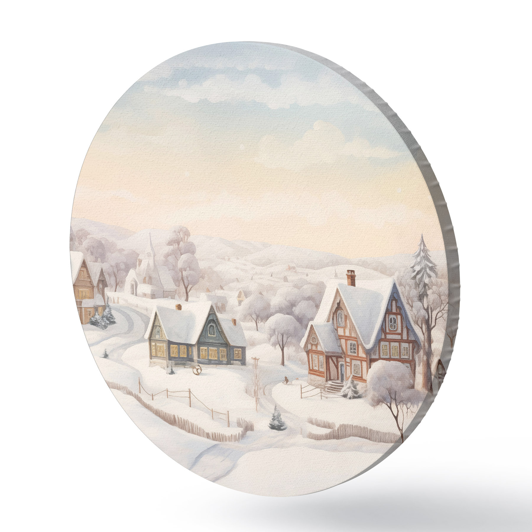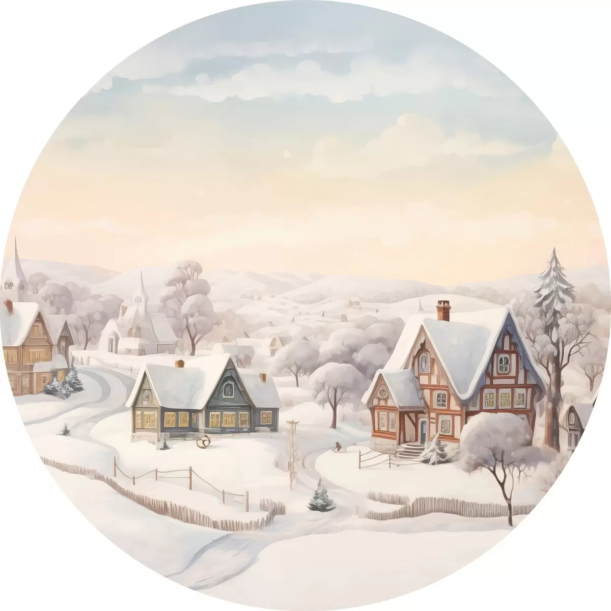 Cuadros redondos Hermoso paisaje de invierno con pueblo, árboles, casas, acuarela r41379