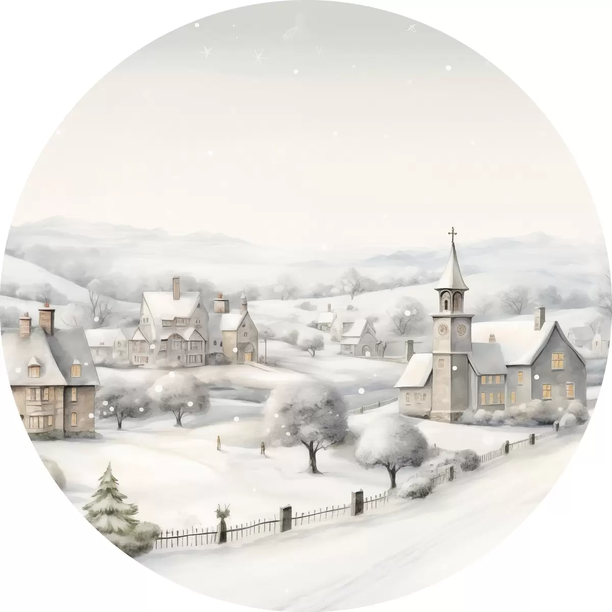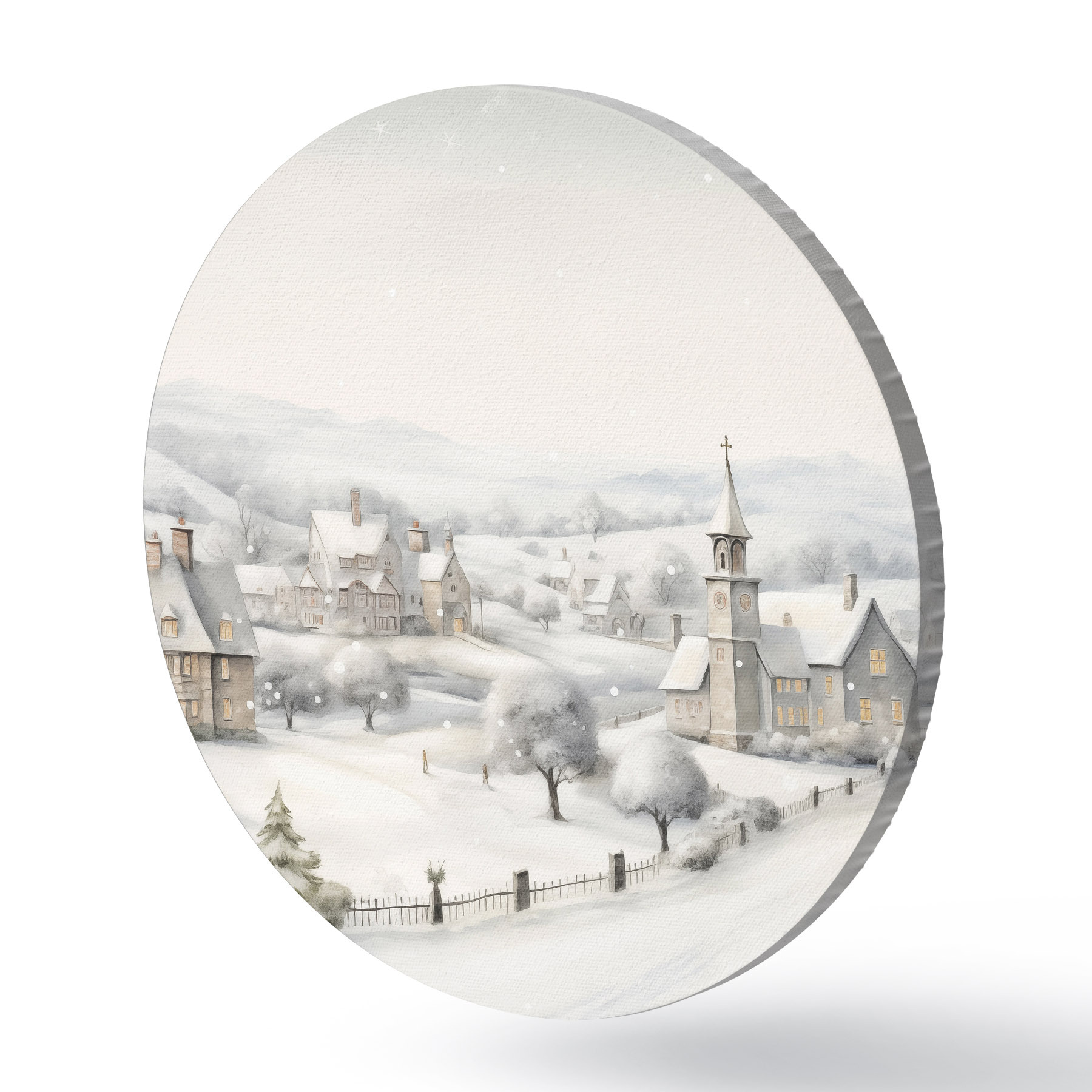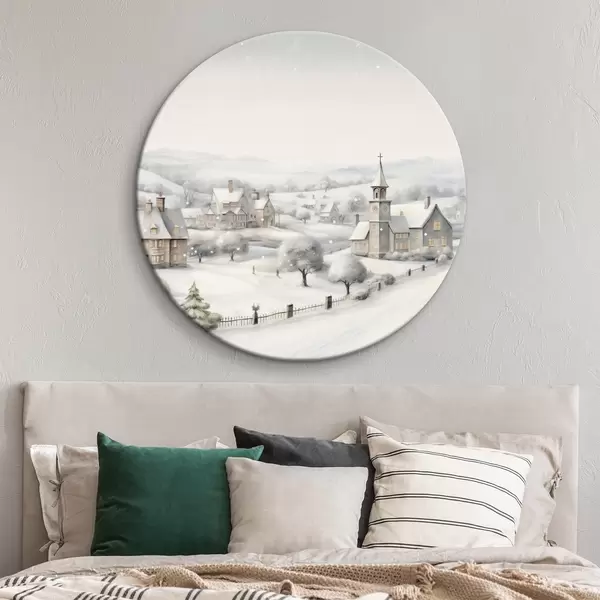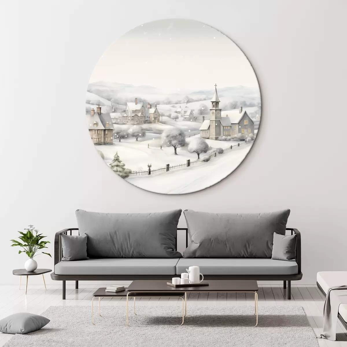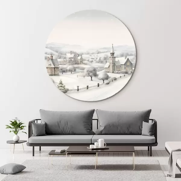 Cuadros redondos Hermoso pueblo de invierno, árboles, casas, acuarela, montañas r41382