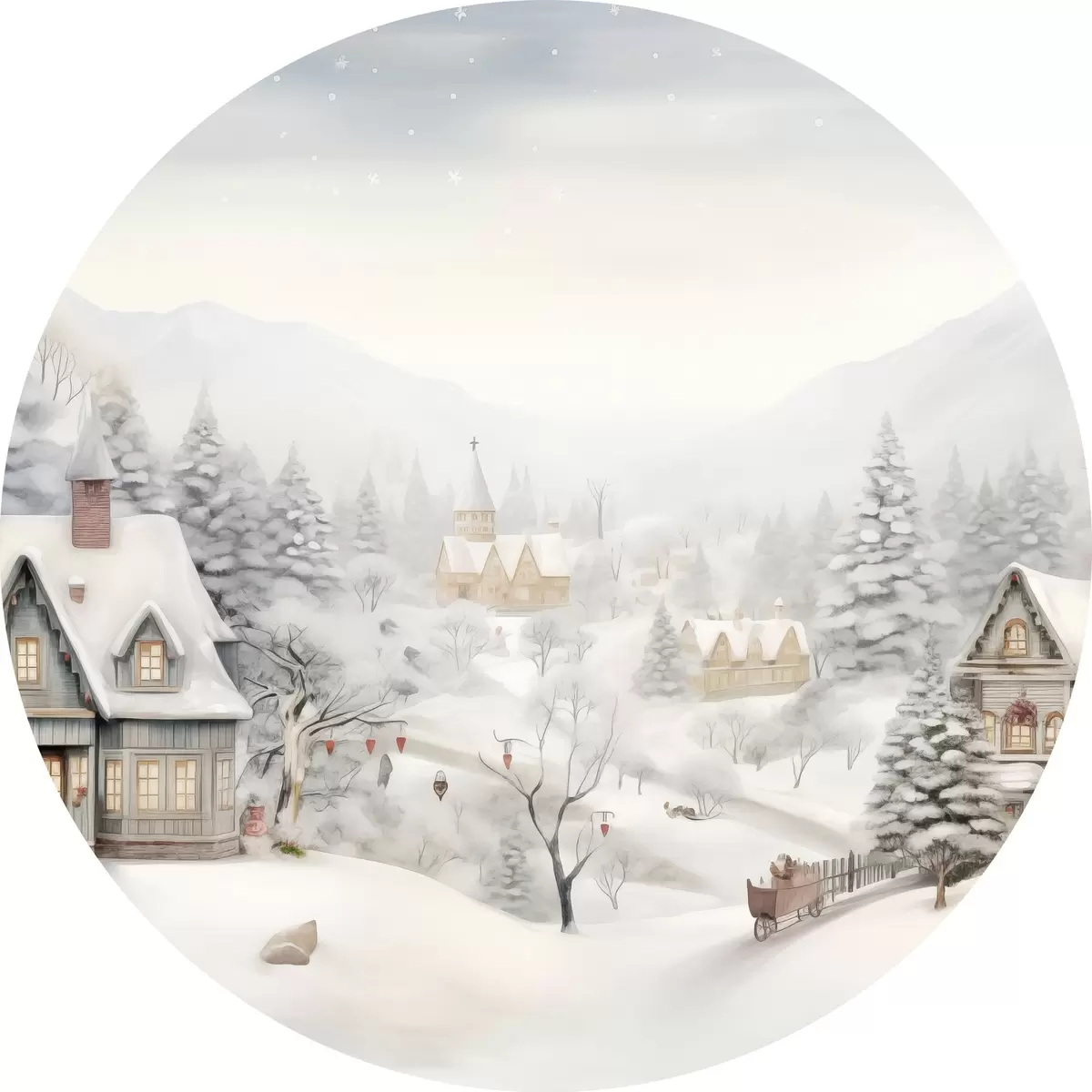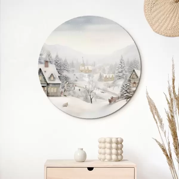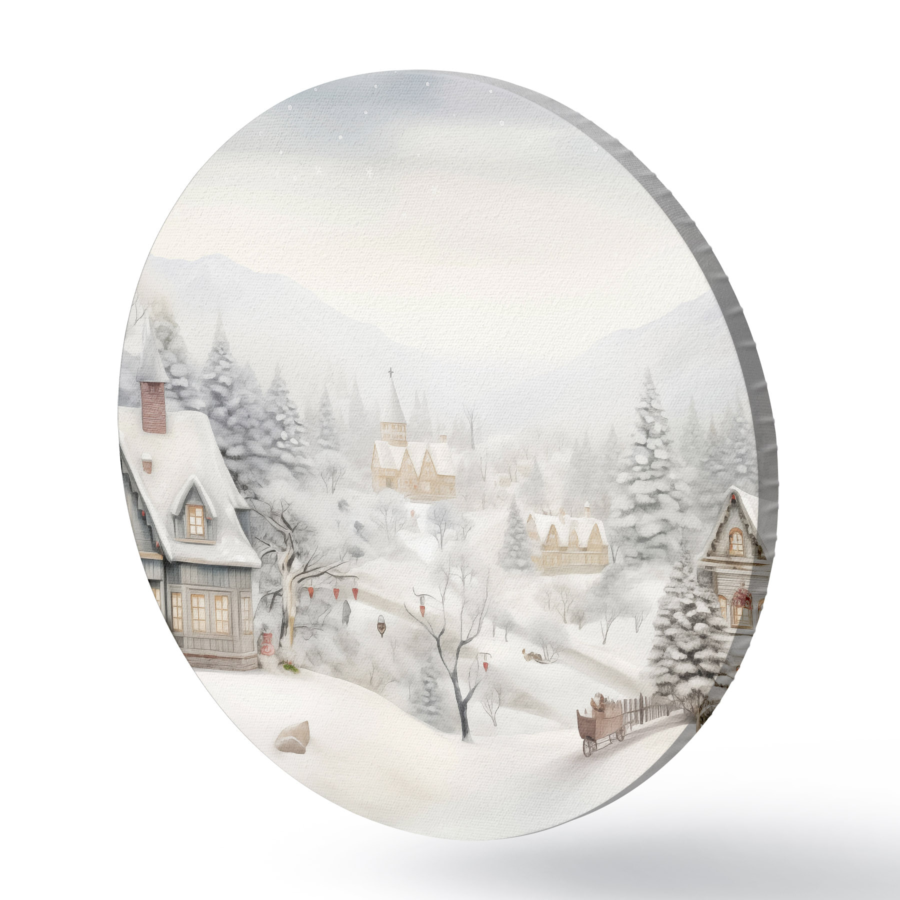 Cuadros redondos Hermoso paisaje de invierno con pueblo, pinos, casas, montañas r41384