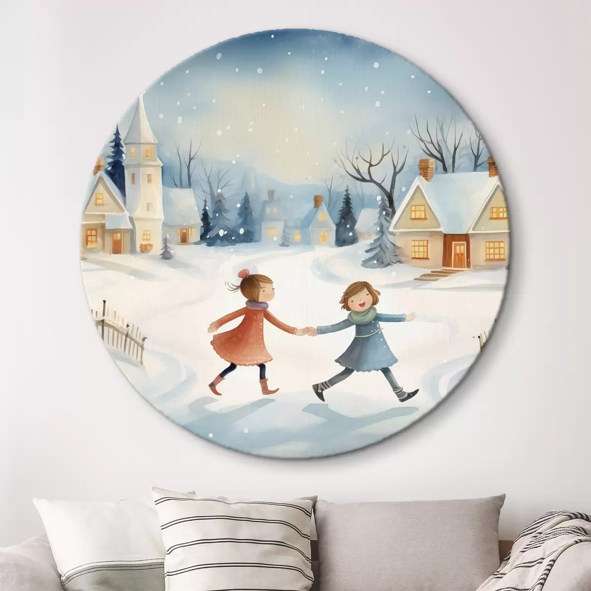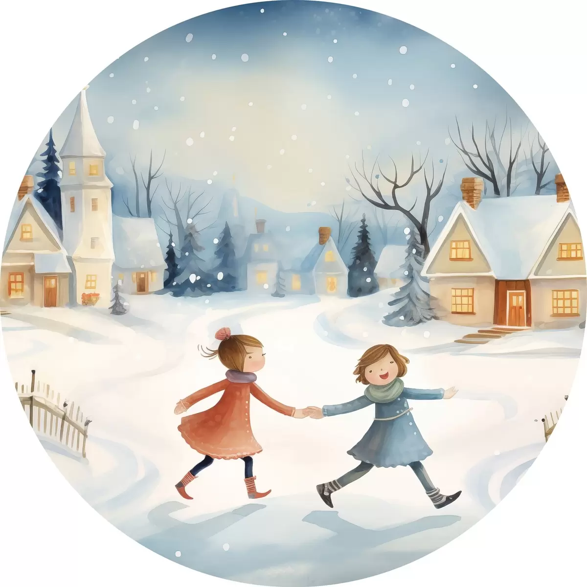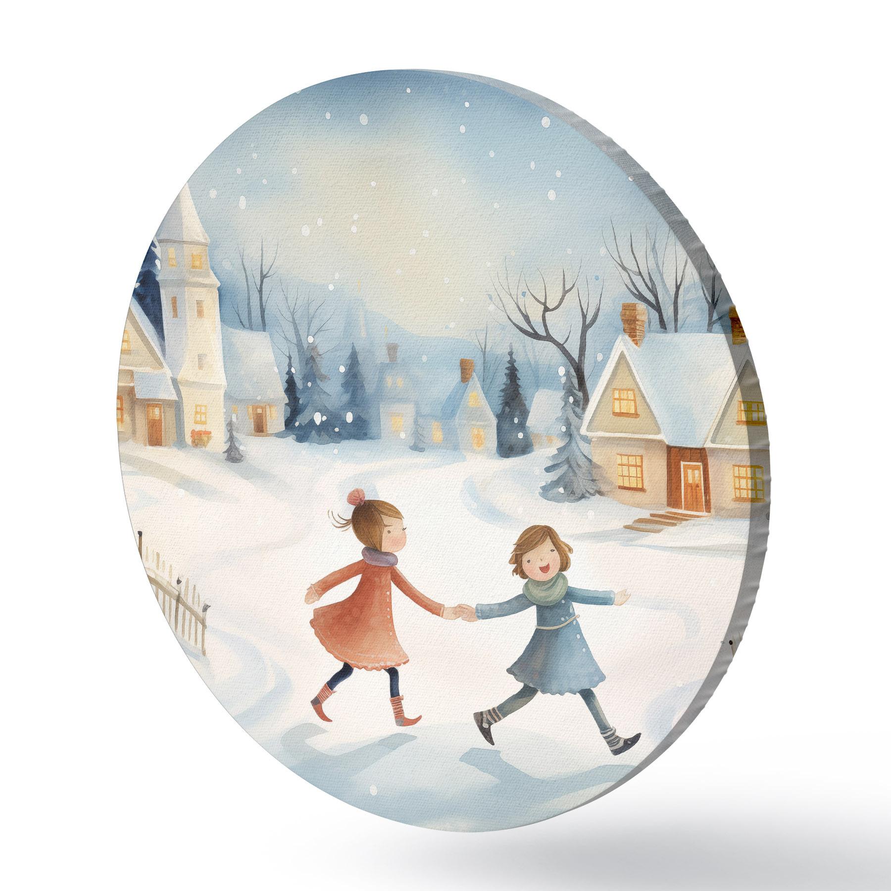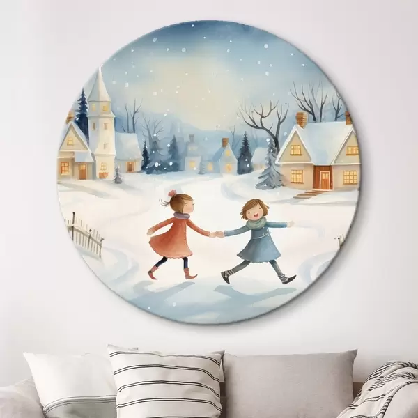 Cuadros redondos Niñas en el pueblo de invierno, copos de nieve, acuarela, casas, bosque r41385