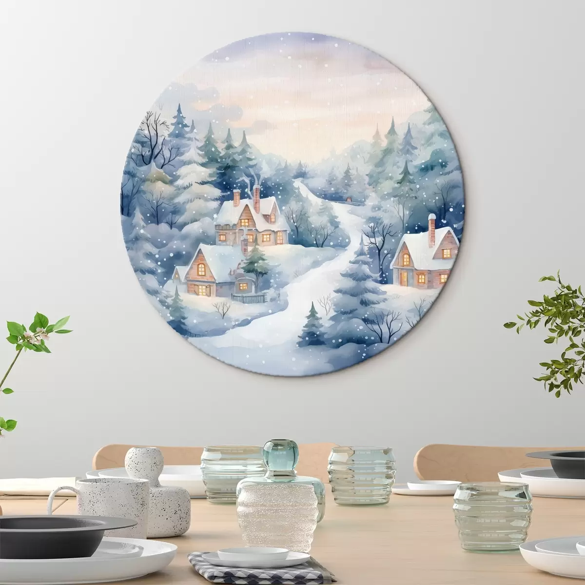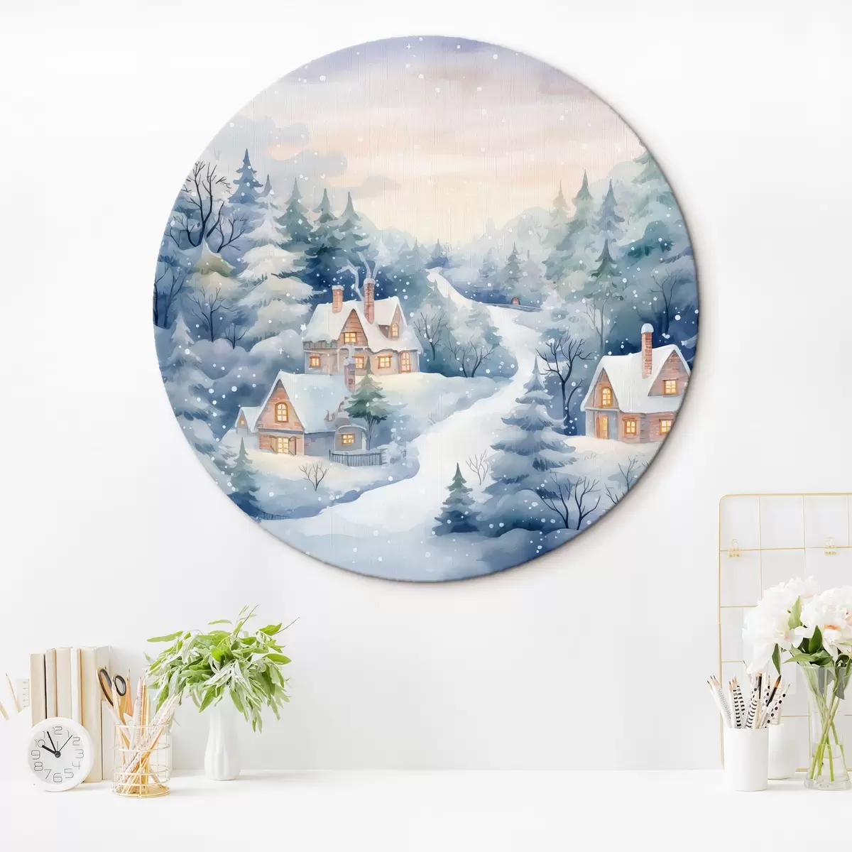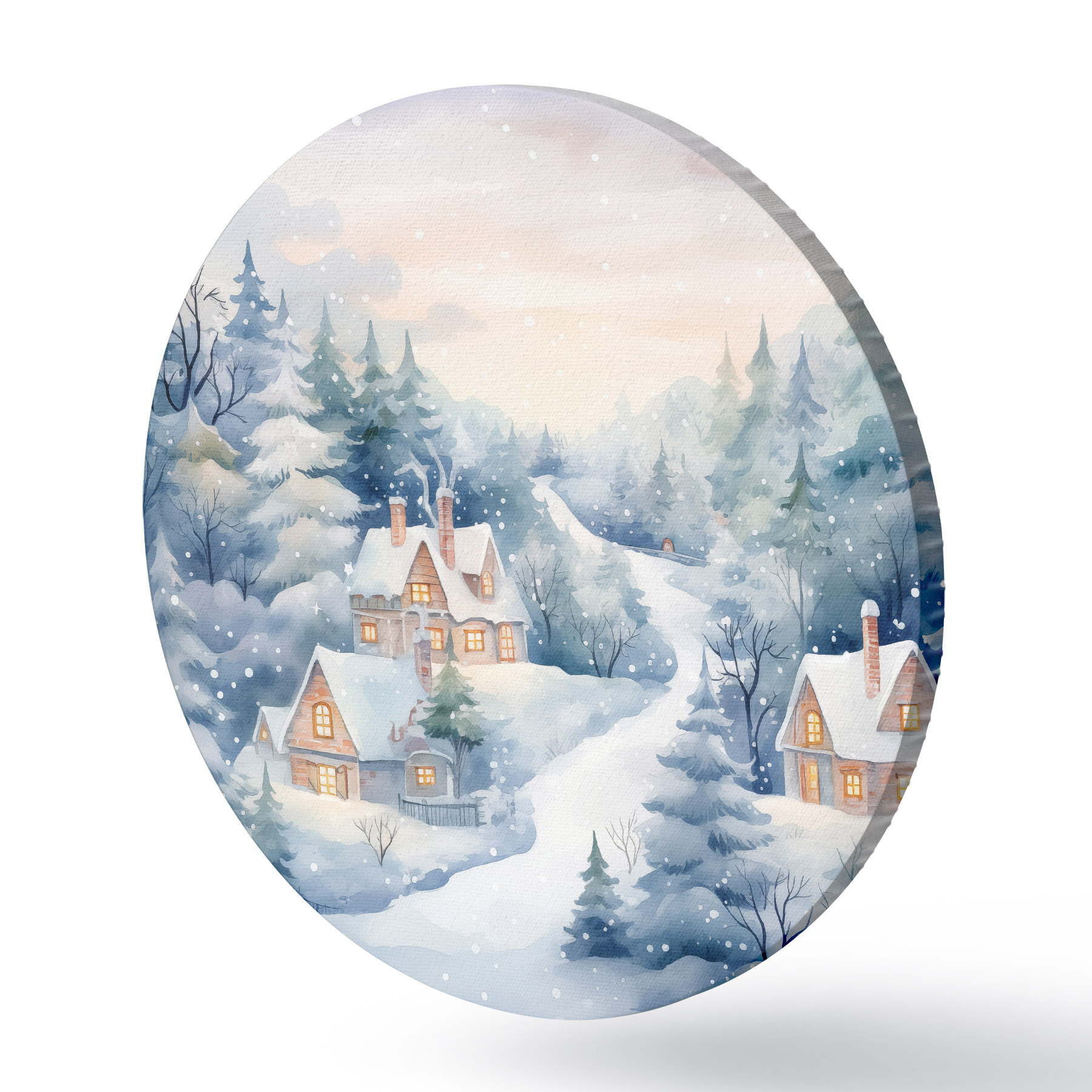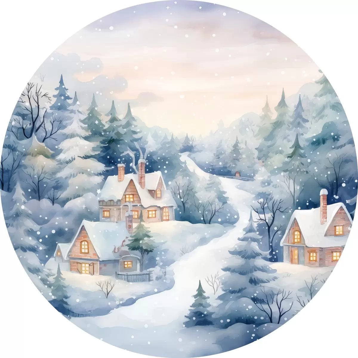 Cuadros redondos Acuarela paisaje invernal, bosque de pinos, casas r41387