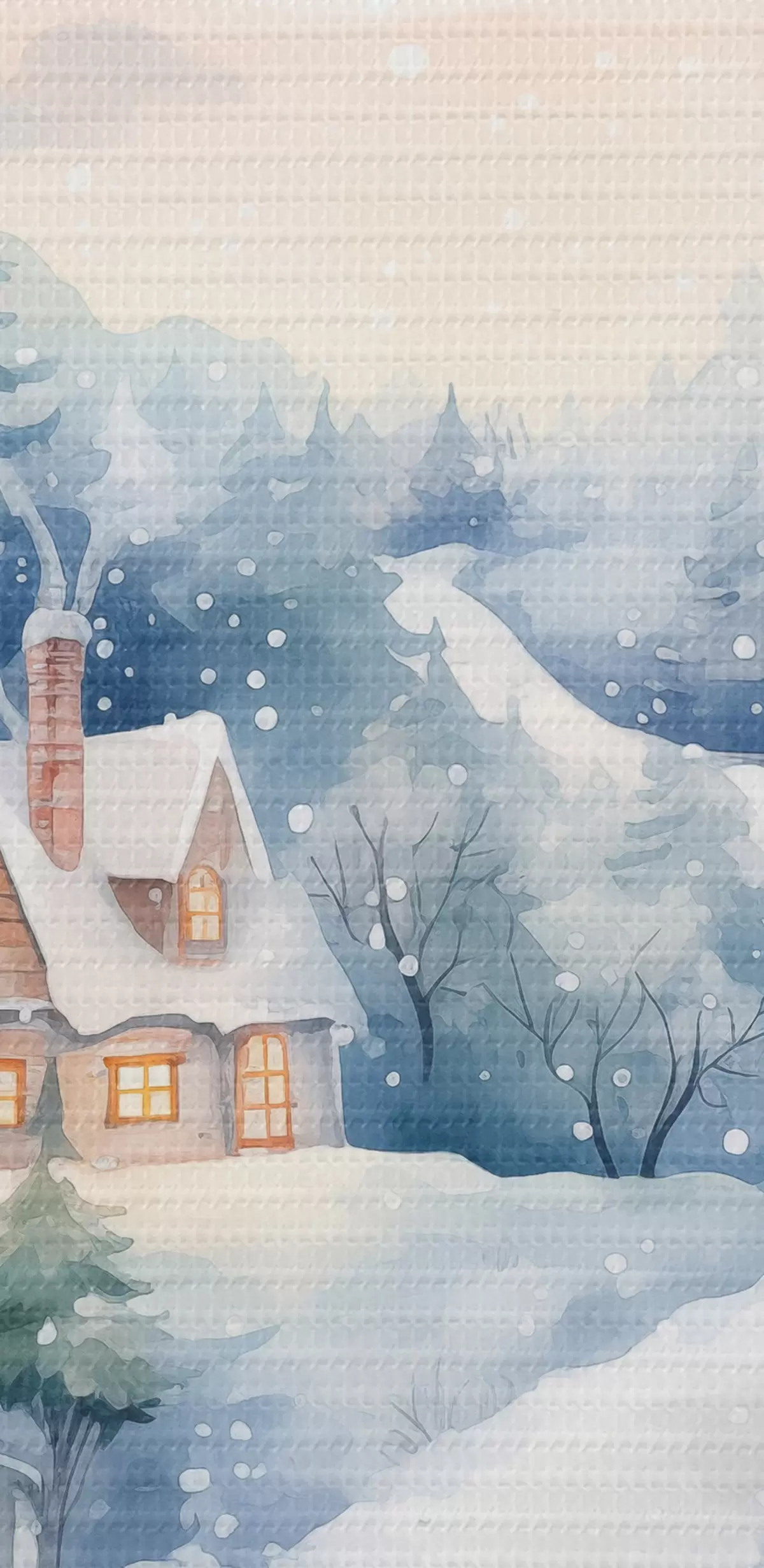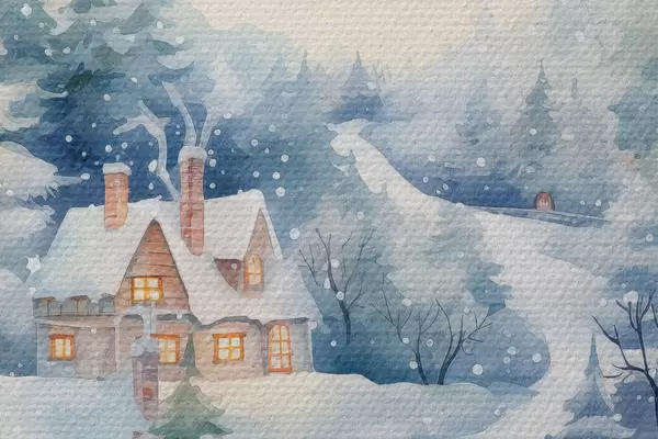 Foto Acuarela paisaje invernal, bosque de pinos, casas Nr r41387