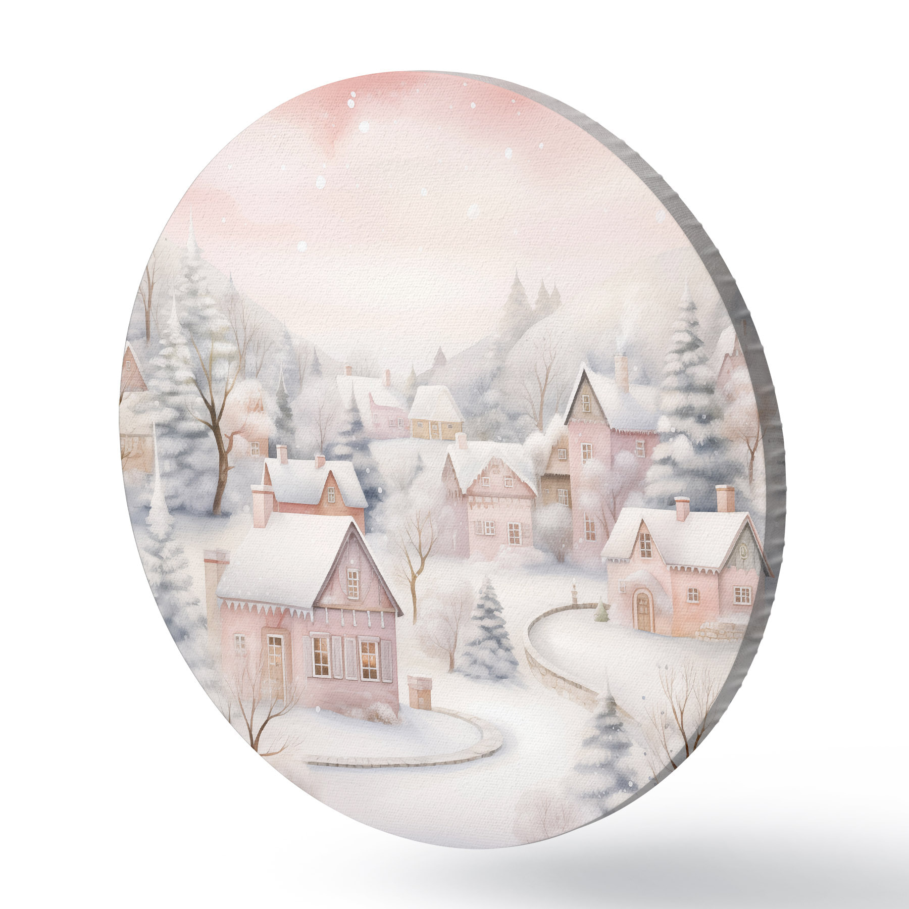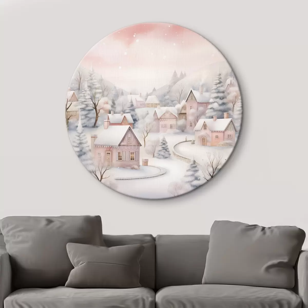 Cuadros redondos Acuarela pueblo de invierno, bosque de pinos, casas, montañas, colores pastel suaves r41388