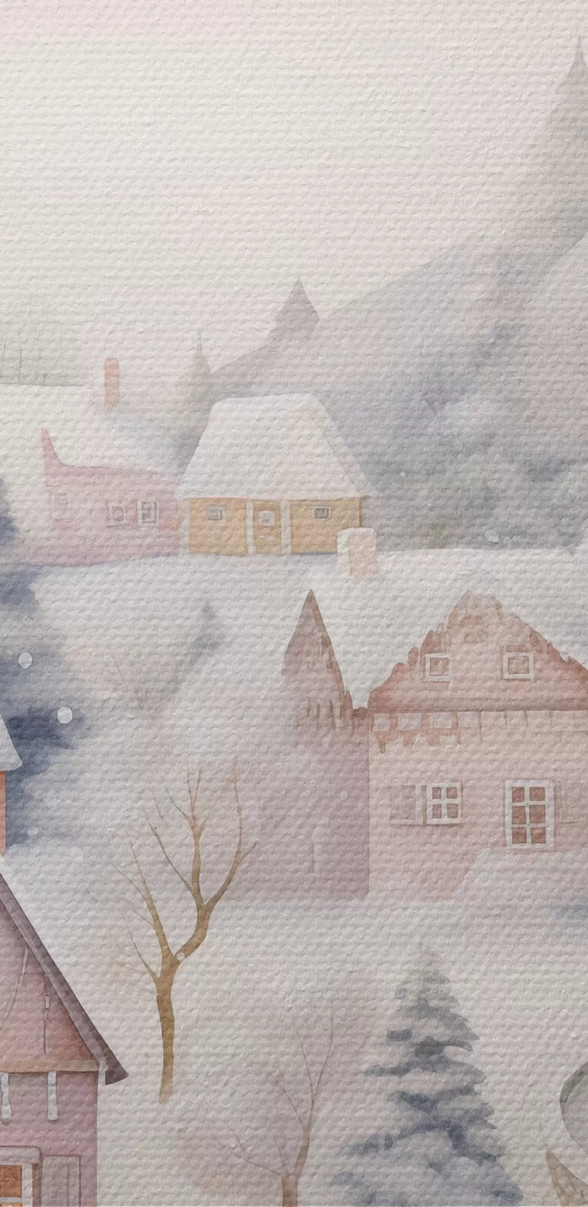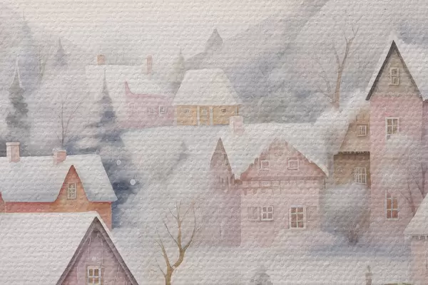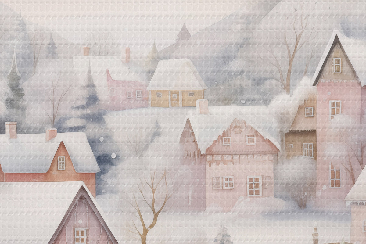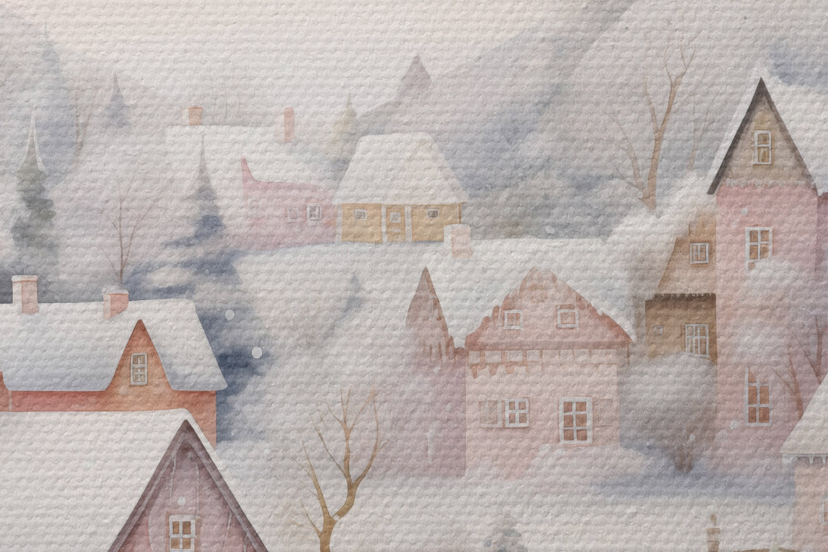 Foto Acuarela pueblo de invierno, bosque de pinos, casas, montañas, colores pastel suaves Nr r41388