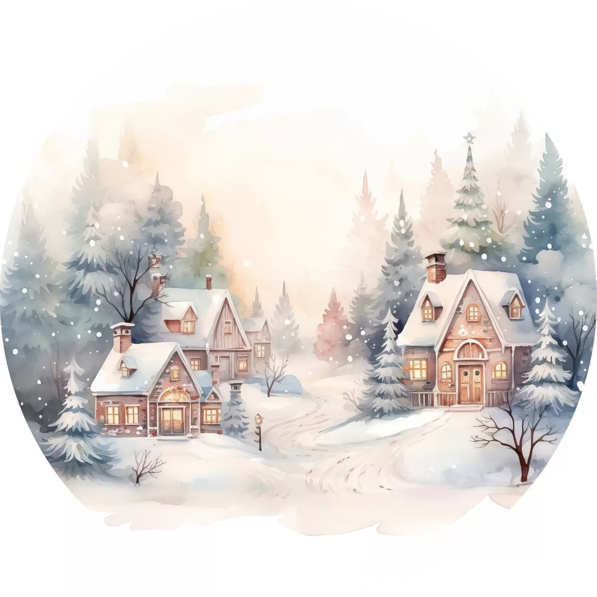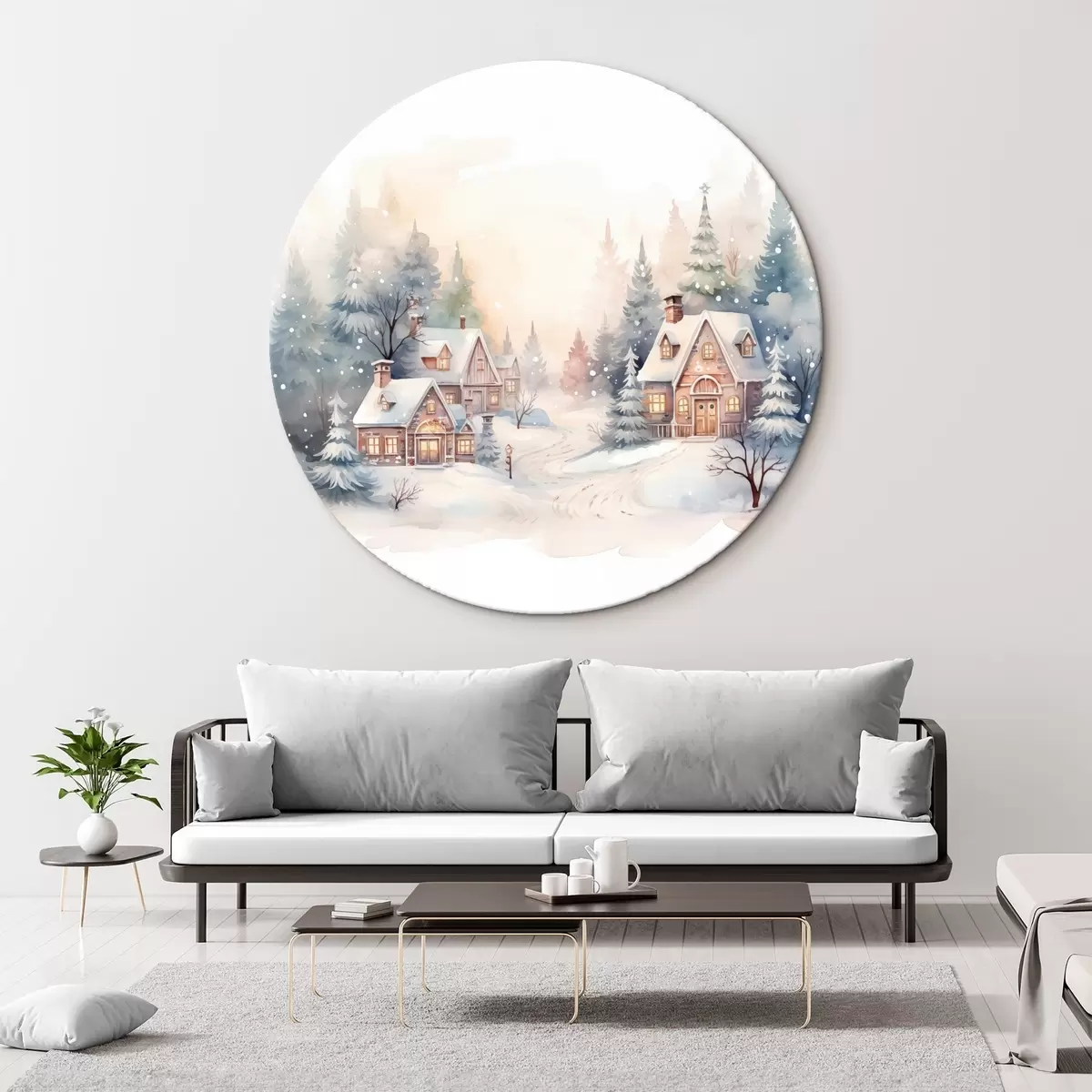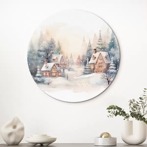 Cuadros redondos Paisaje de invierno, bosque de pinos, hermosas casas, acuarela, susnet r41390