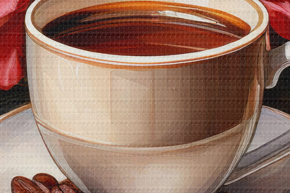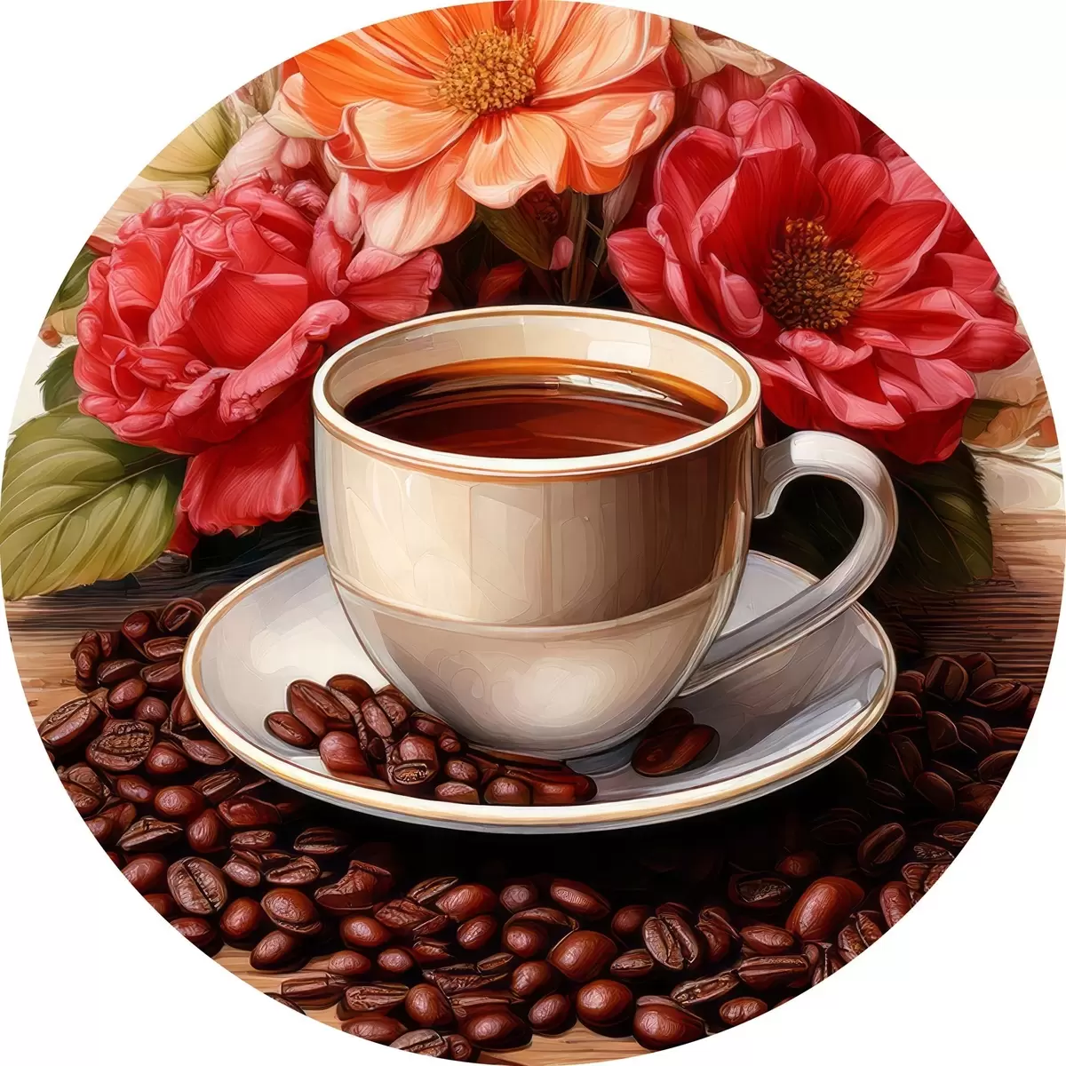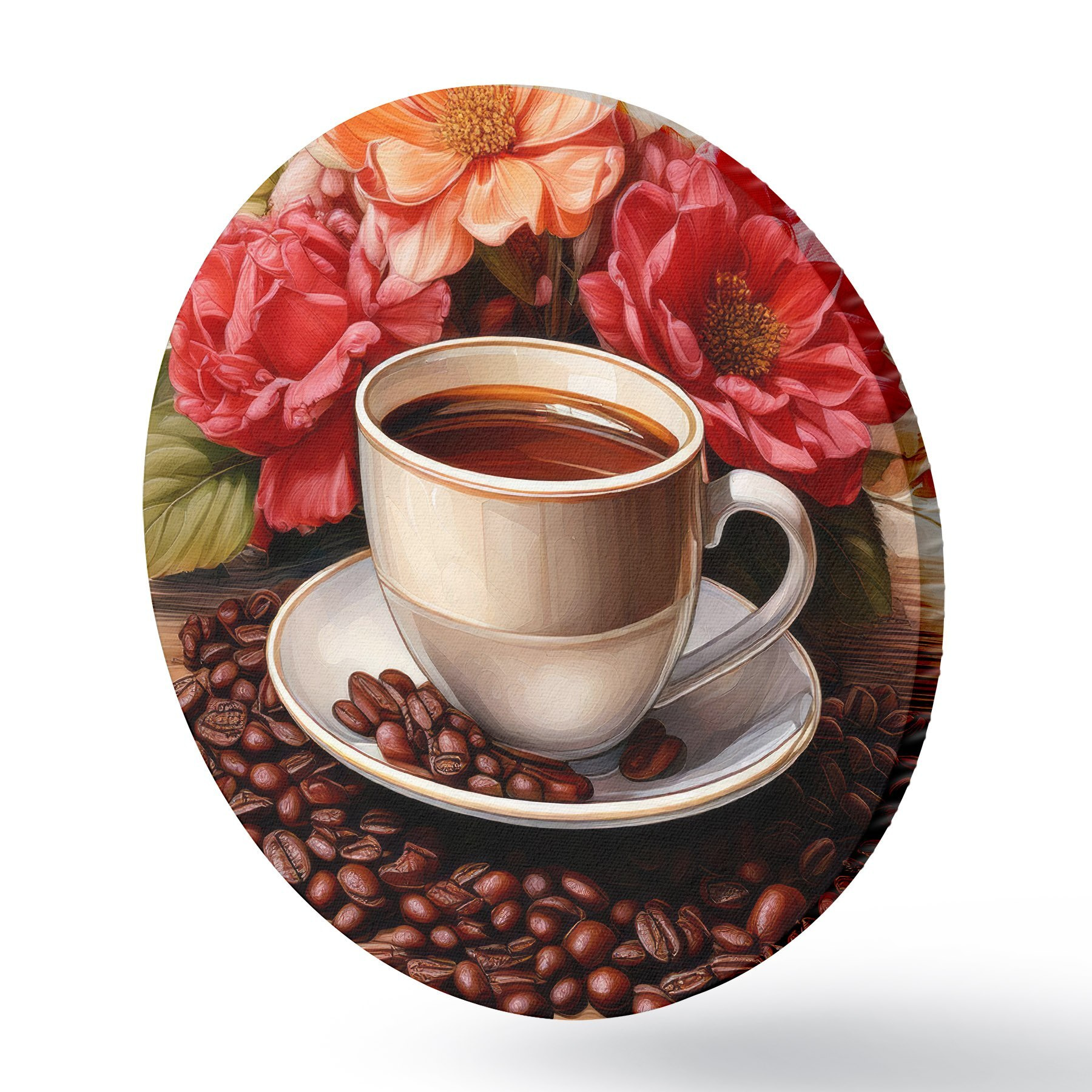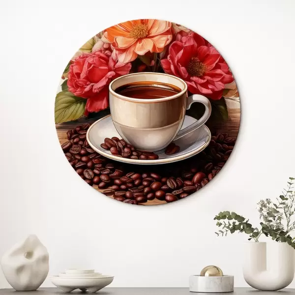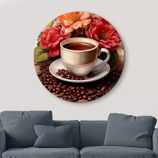 Cuadros redondos una taza de café y un ramo de flores r41411