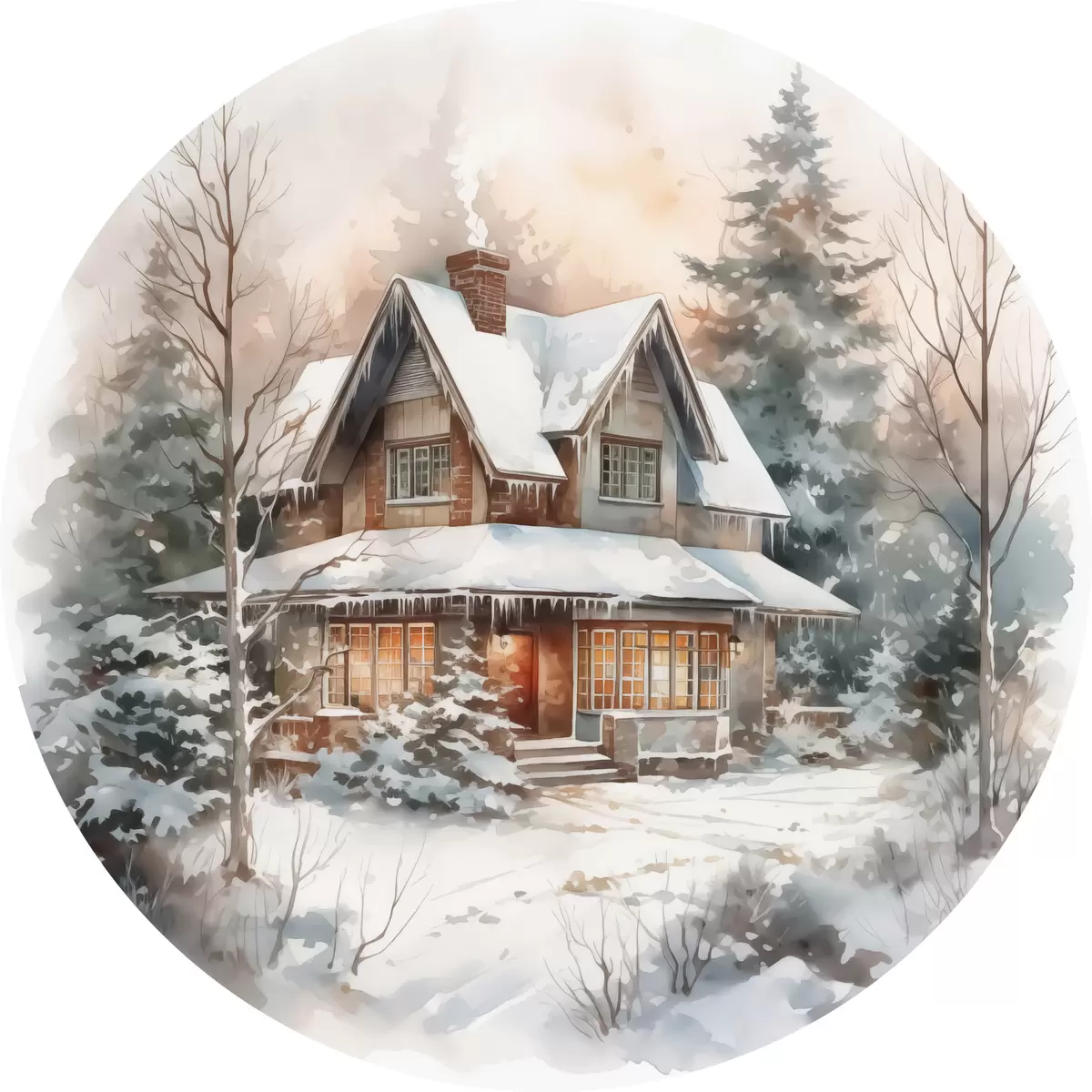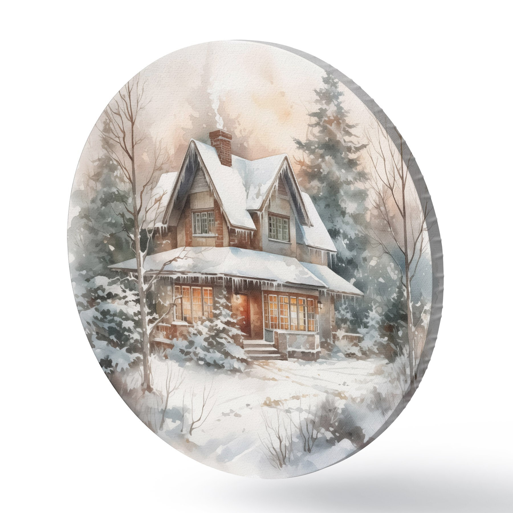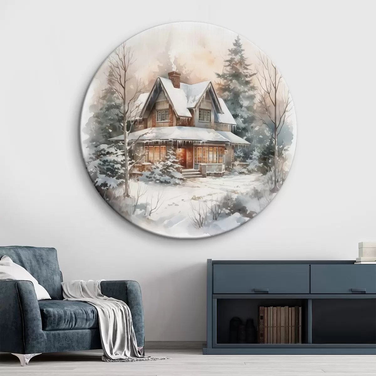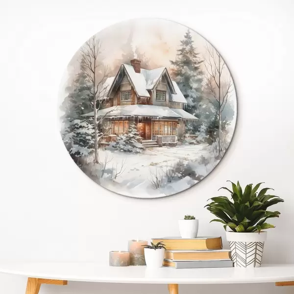 Cuadros redondos Casa en un bosque nevado imitación acuarela r42137