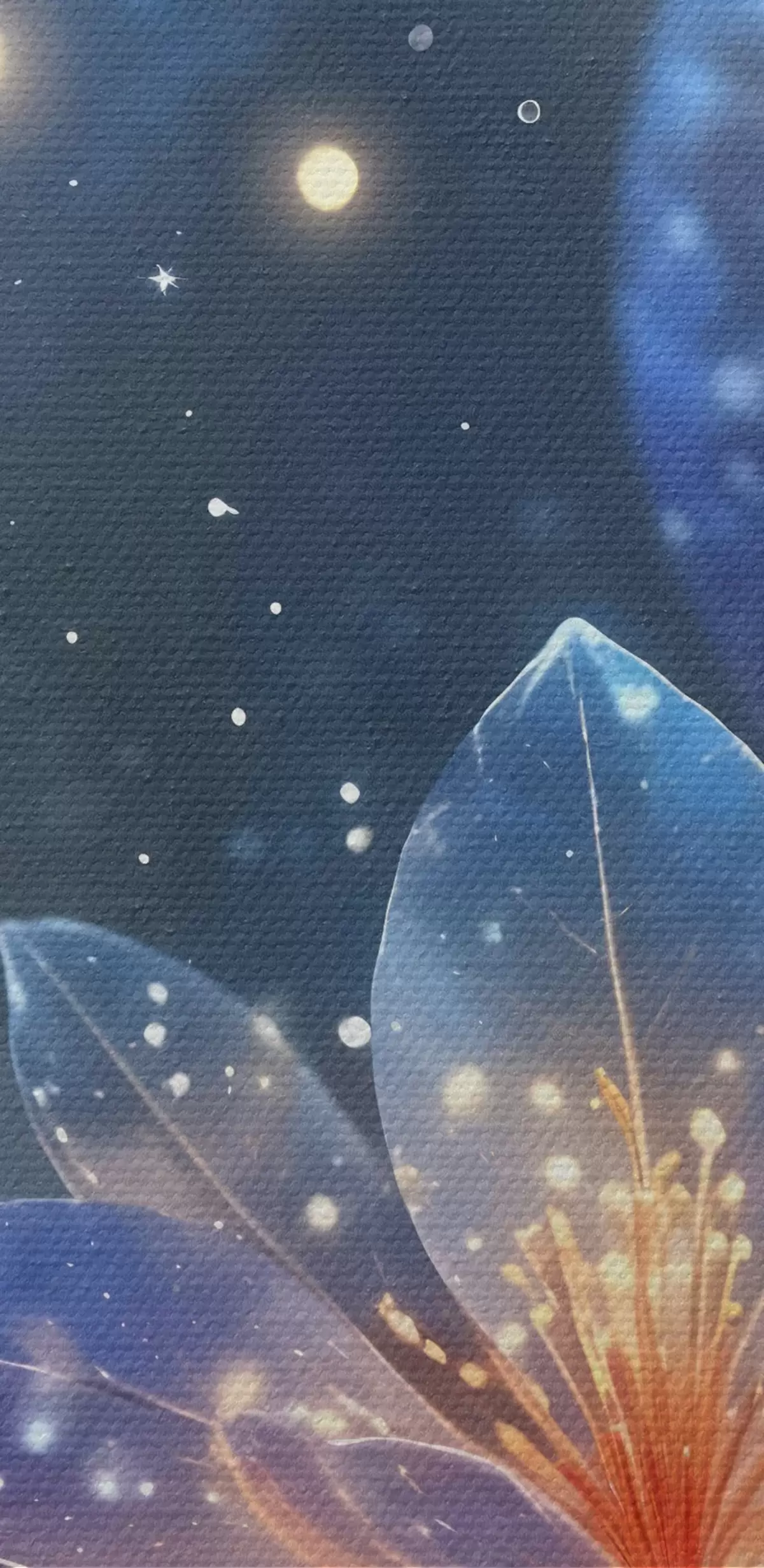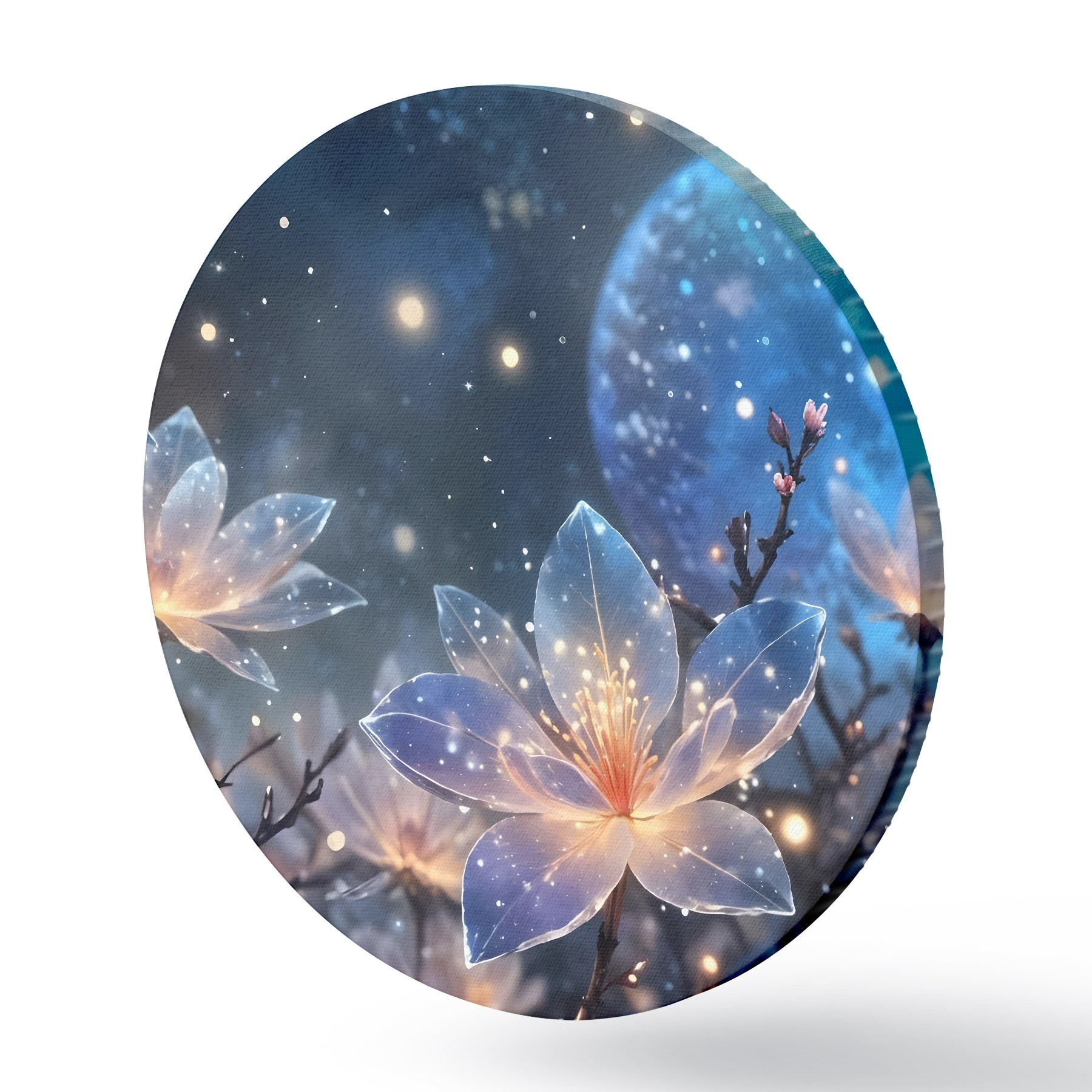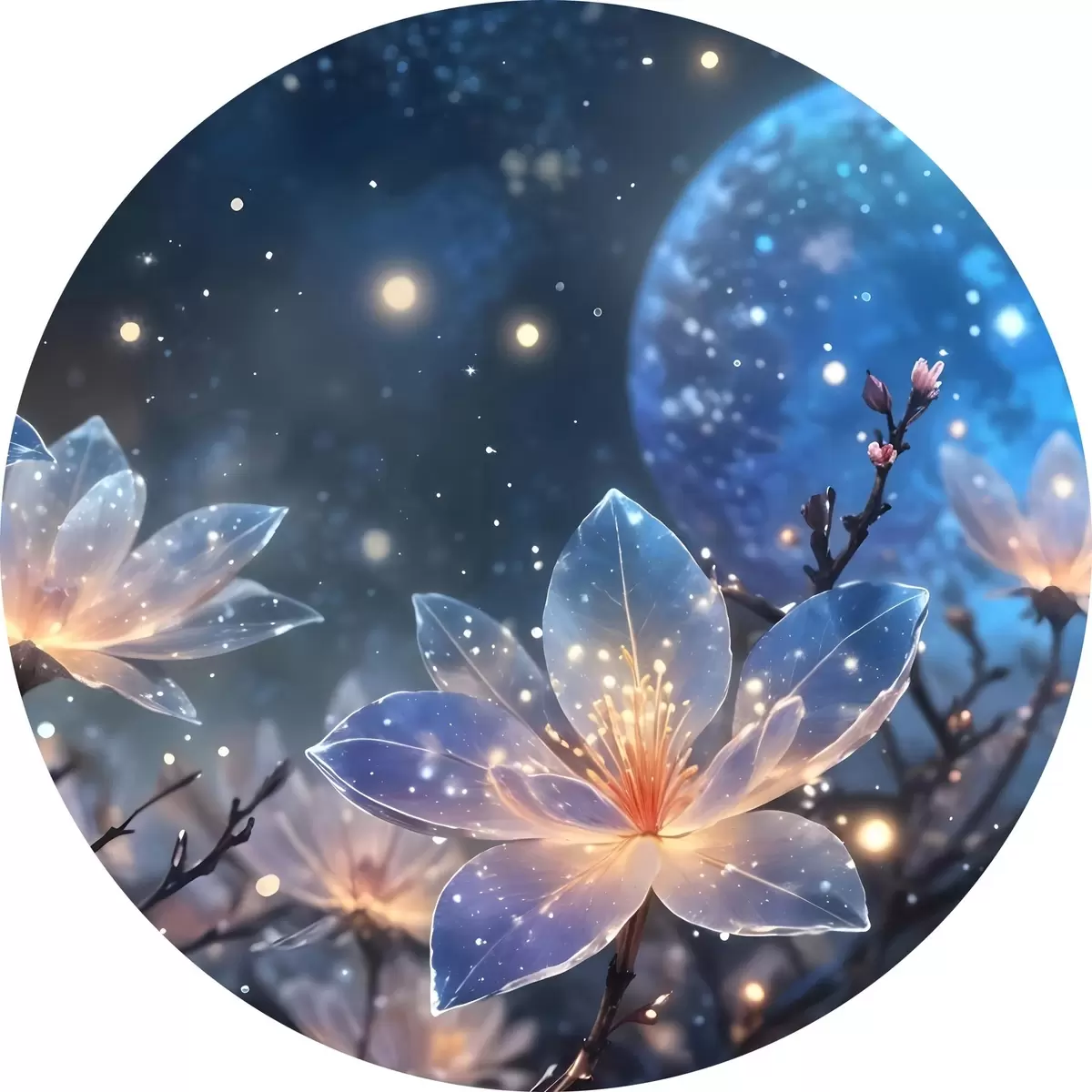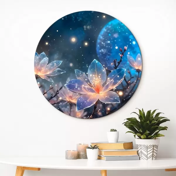 Cuadros redondos Abstracto flores de fantasía en las ramas con pétalos de textura con las estrellas y una luna en un cielo nocturno de fondo r42211