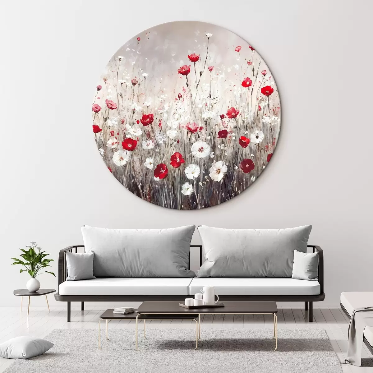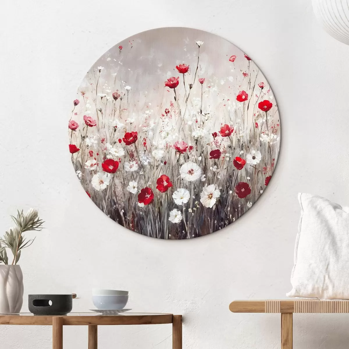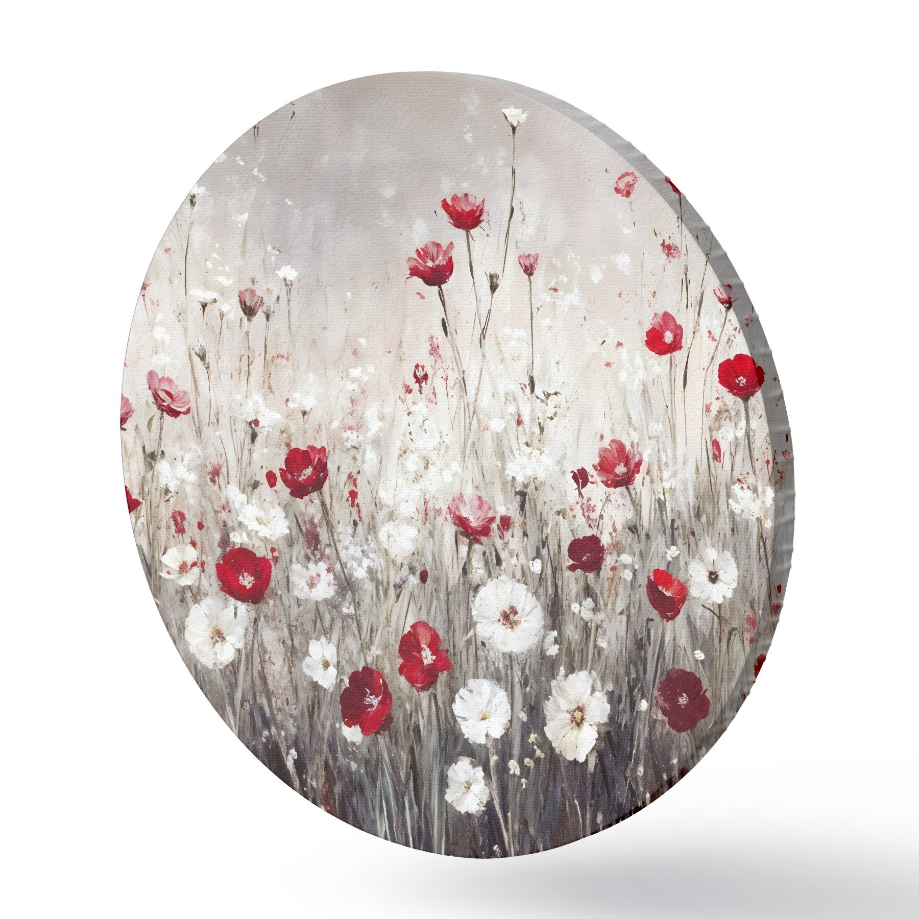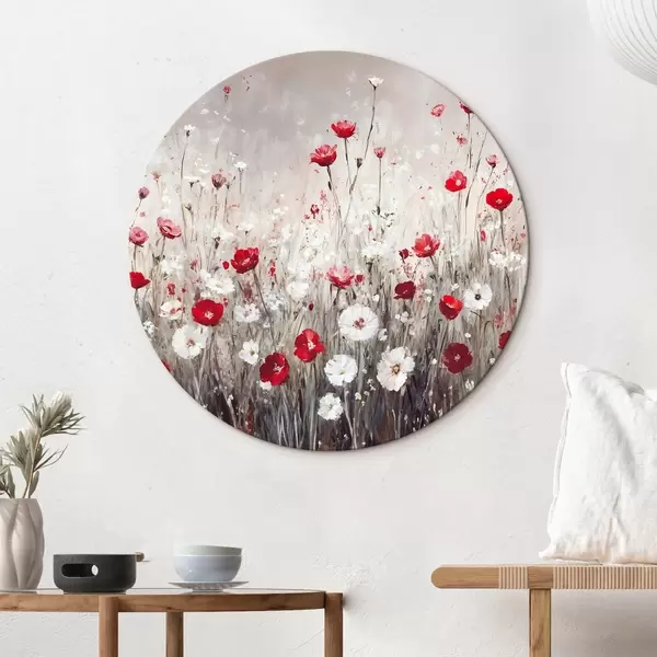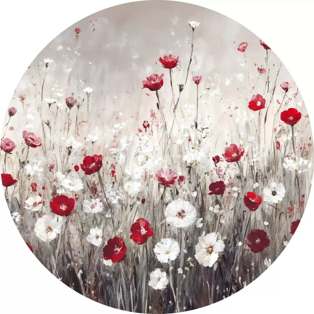 Cuadros redondos Imitación abstracta al óleo de un campo de flores rojas y blancas de amapolas y margaritas sobre un fondo gris texturado r42213