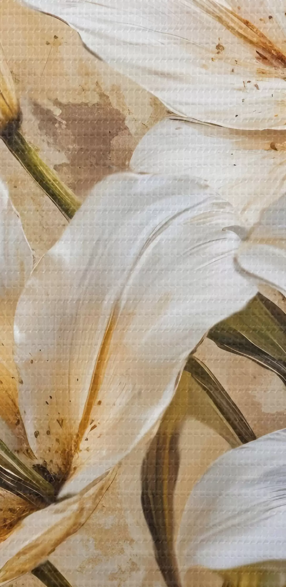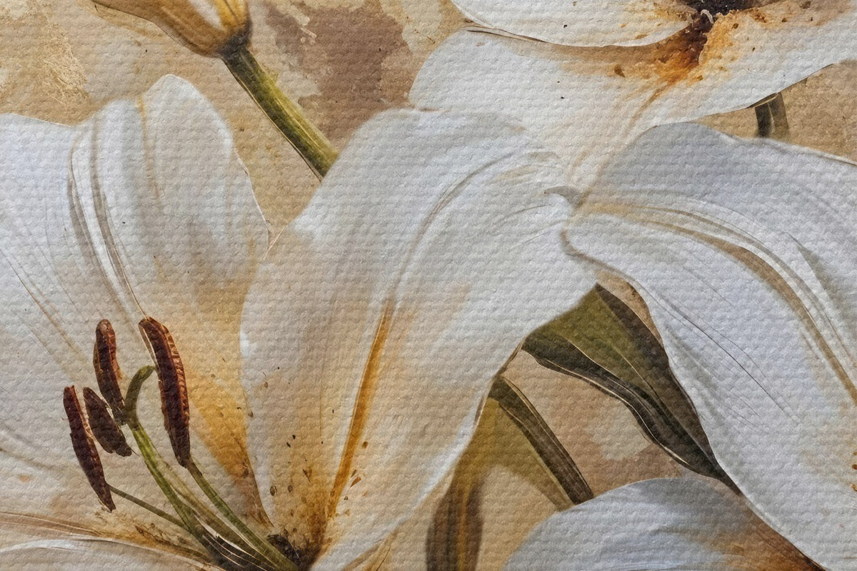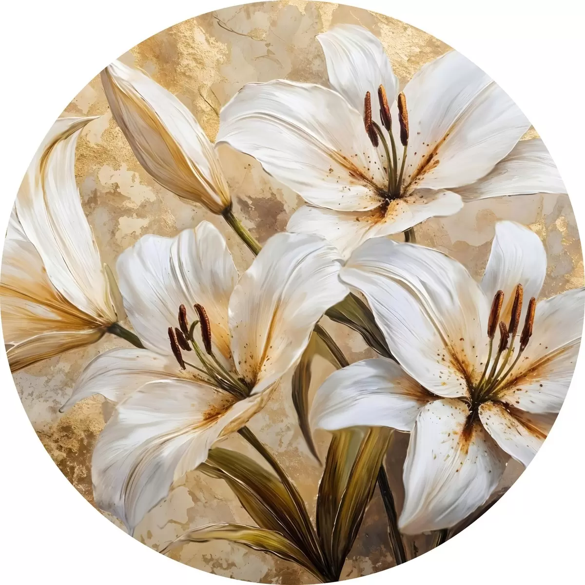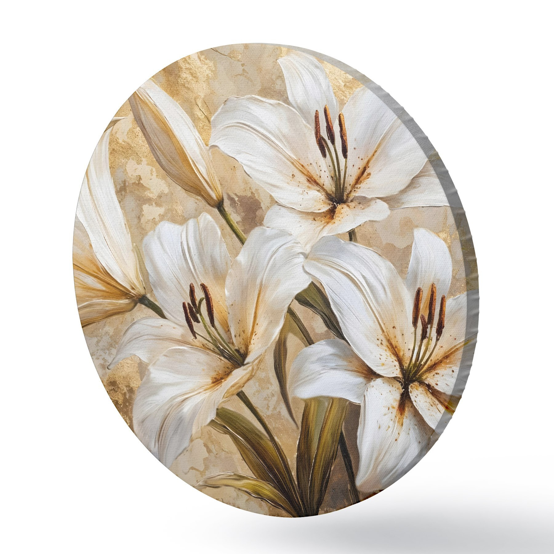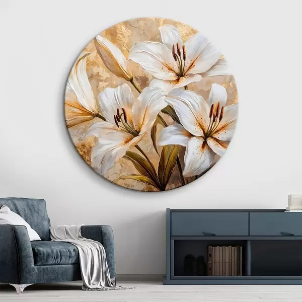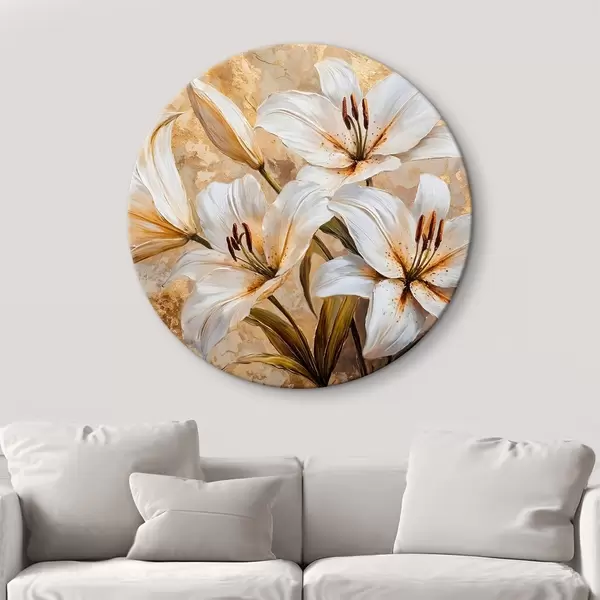 Cuadros redondos Lirios blancos con centros amarillos sobre un fondo beige texturado r42216