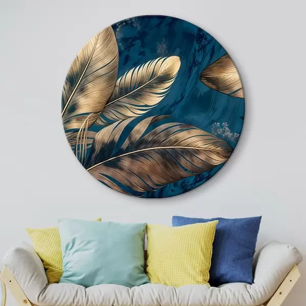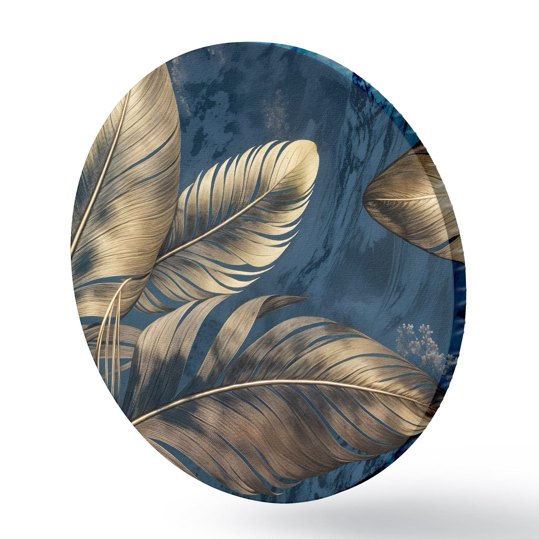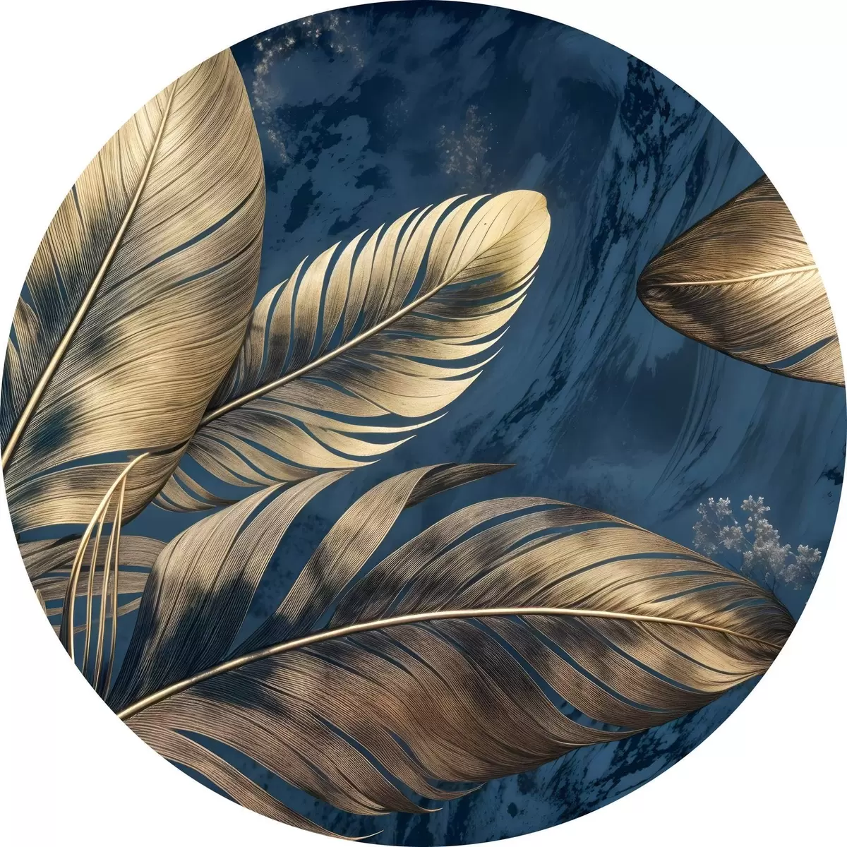 Cuadros redondos Plumas decorativas abstractas de color amarillo y beige flotando sobre un fondo de textura azul oscuro r42218
