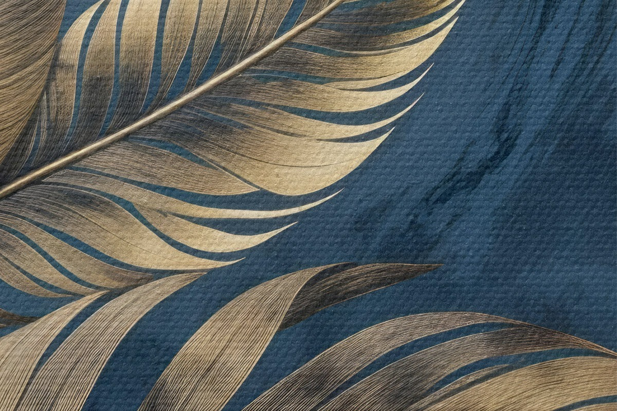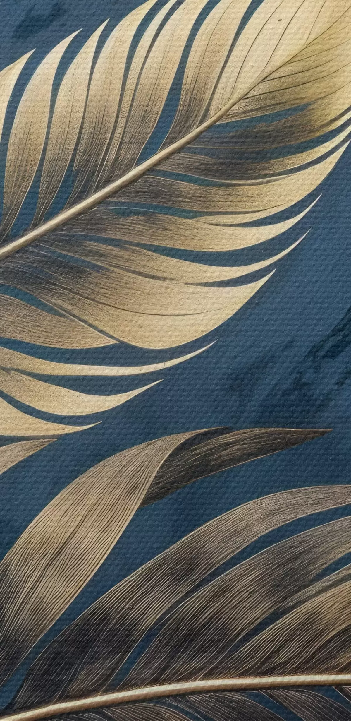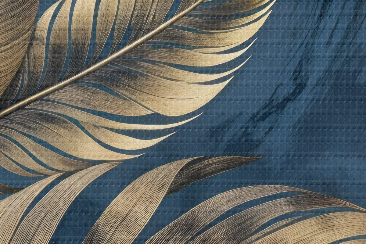 Foto Plumas decorativas abstractas de color amarillo y beige flotando sobre un fondo de textura azul oscuro Nr r42218