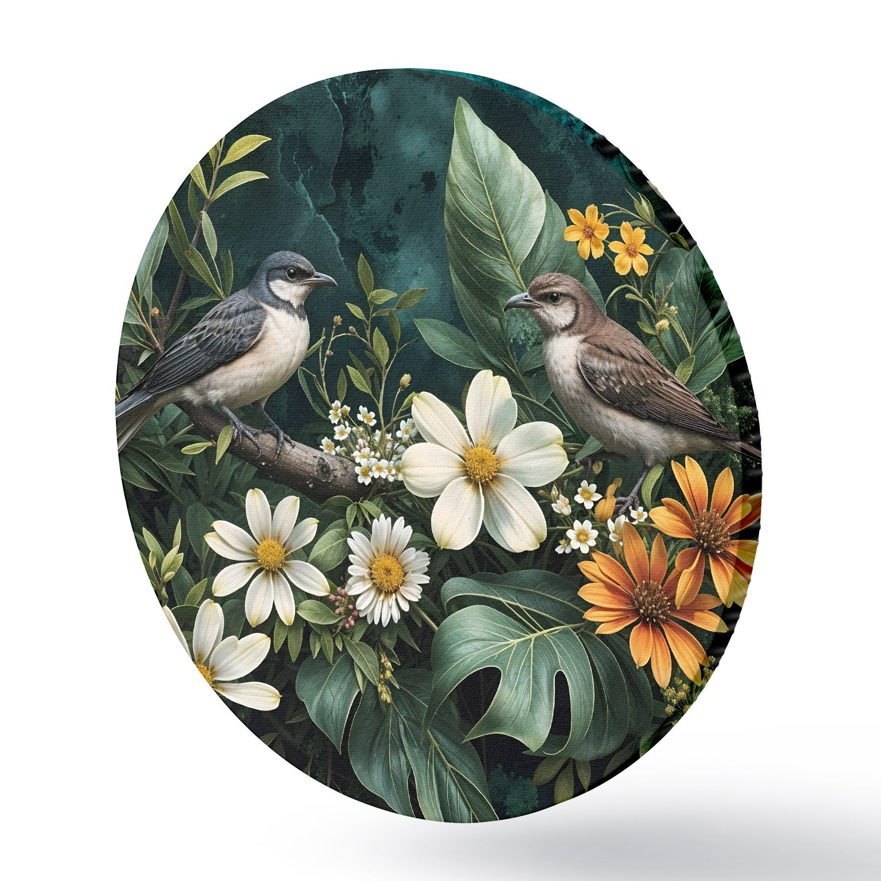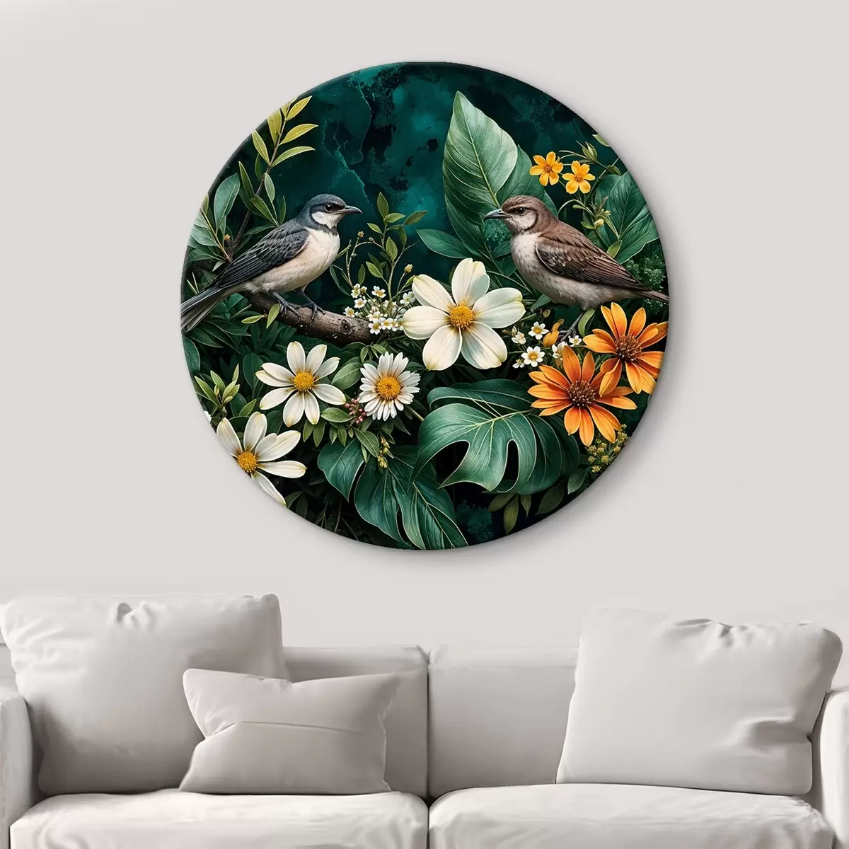 Cuadros redondos Pequeños pájaros posados en ramas rodeadas de exuberante follaje tropical , incluyendo grandes hojas verdes y flores de colores r42220