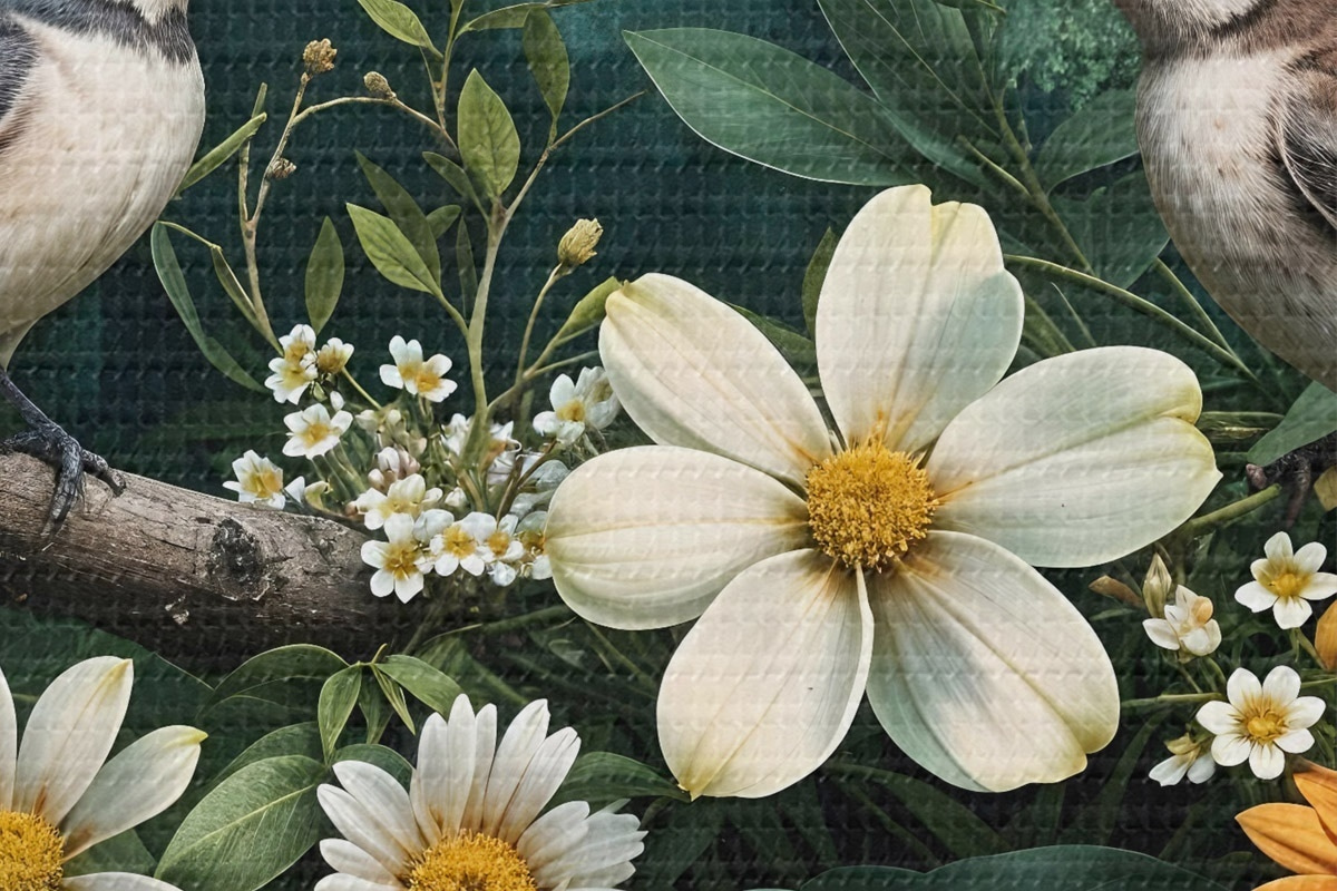 Foto Pequeños pájaros posados en ramas rodeadas de exuberante follaje tropical , incluyendo grandes hojas verdes y flores de colores Nr r42220