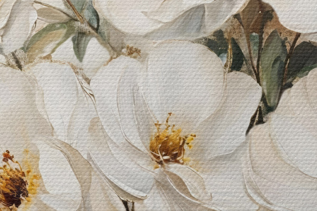 Foto Ramo de grandes flores blancas al óleo con centros amarillos sobre fondo claro Nr r42222