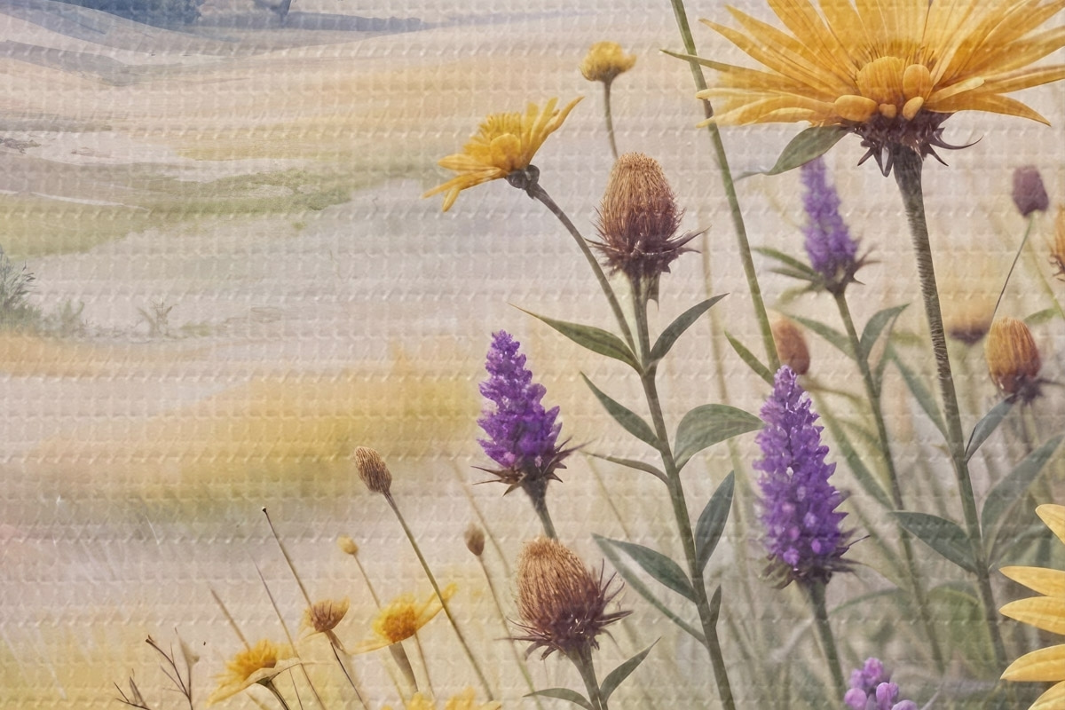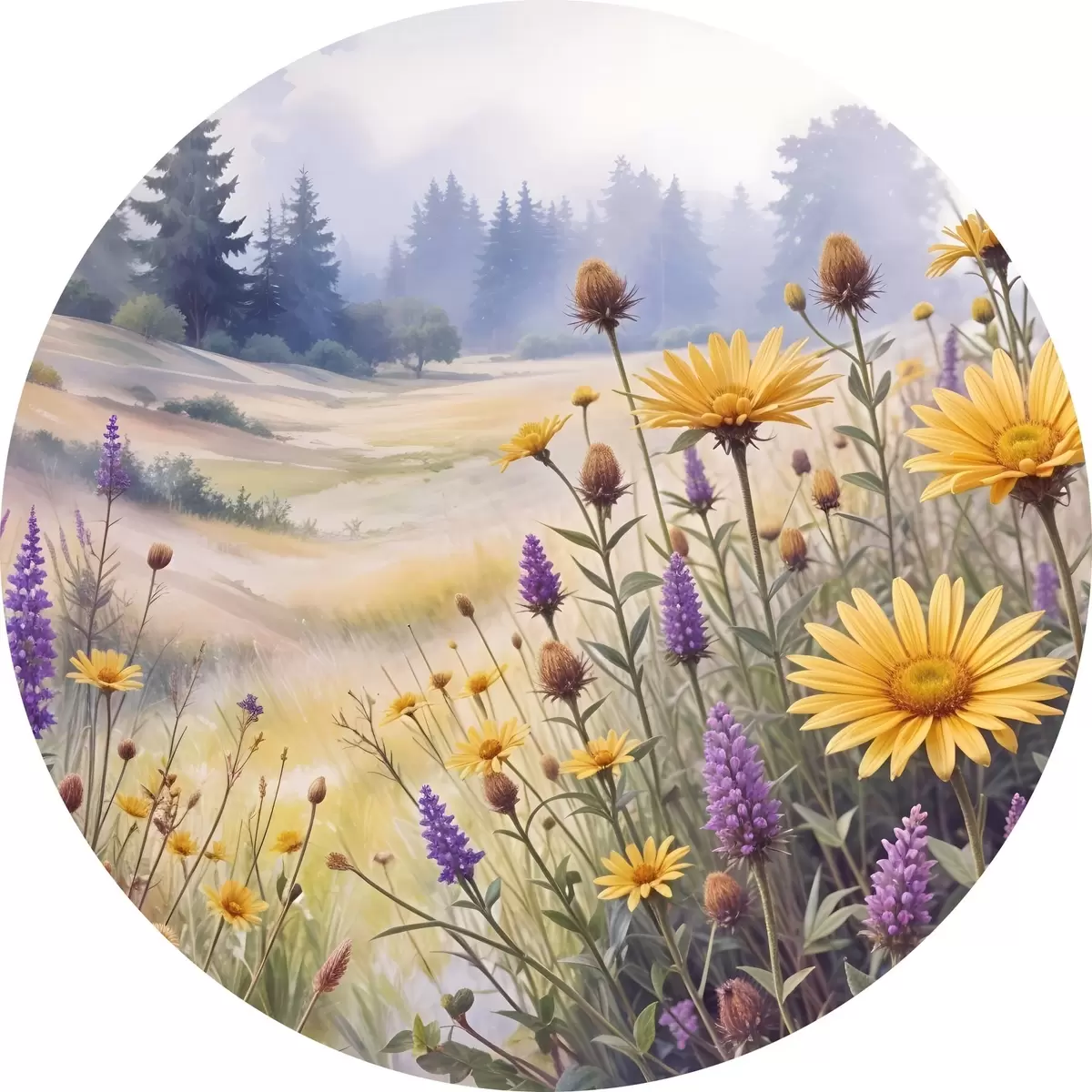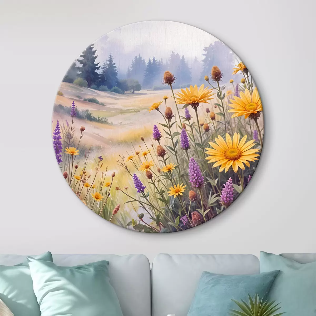 Cuadros redondos Un campo de girasoles amarillos y flores silvestres púrpuras en un paisaje forestal brumoso con pinos al fondo r42223