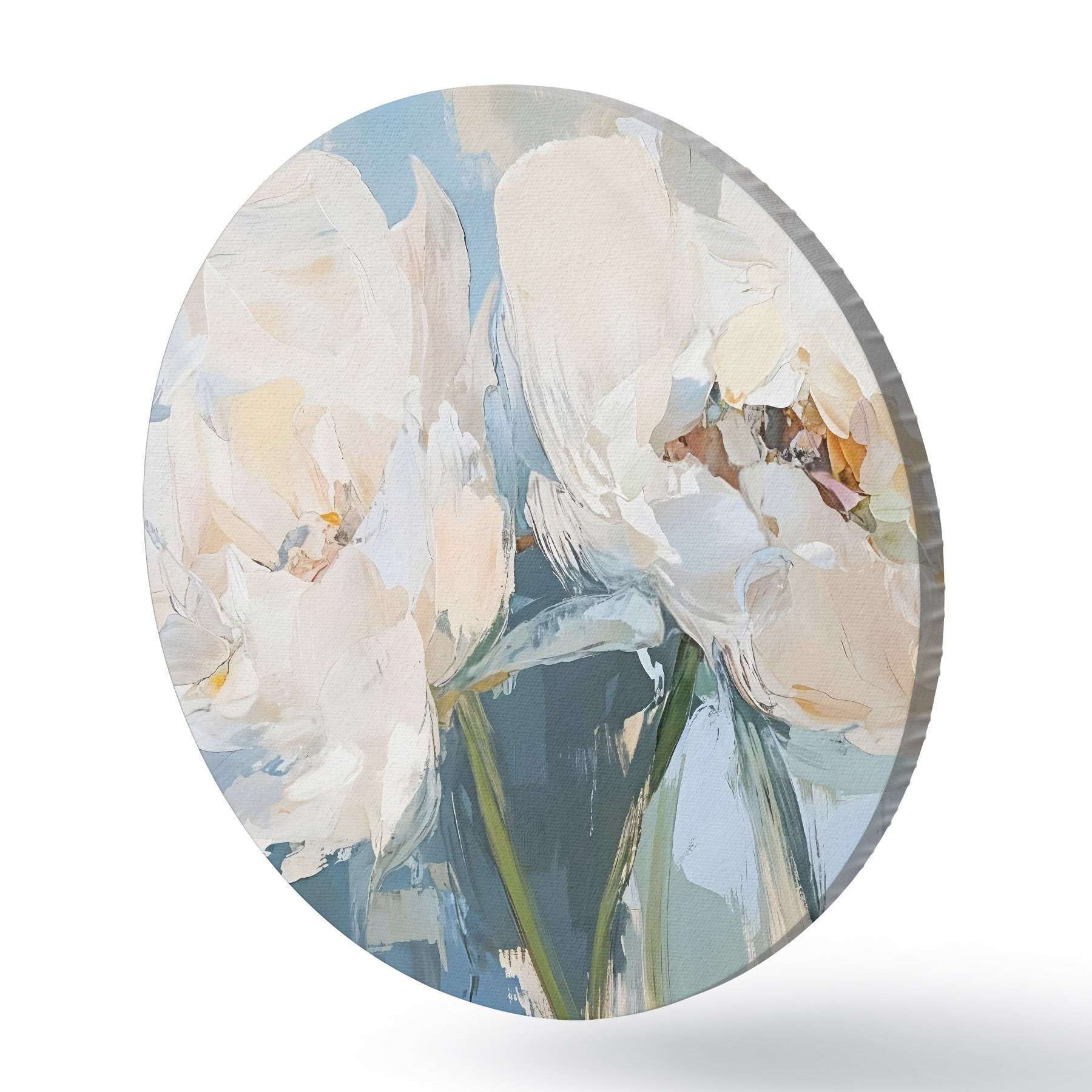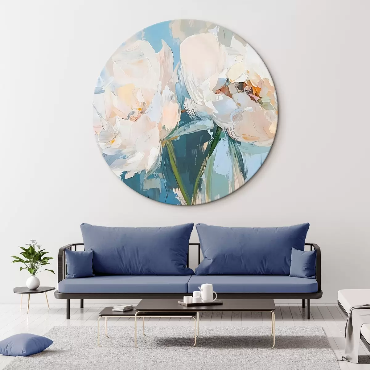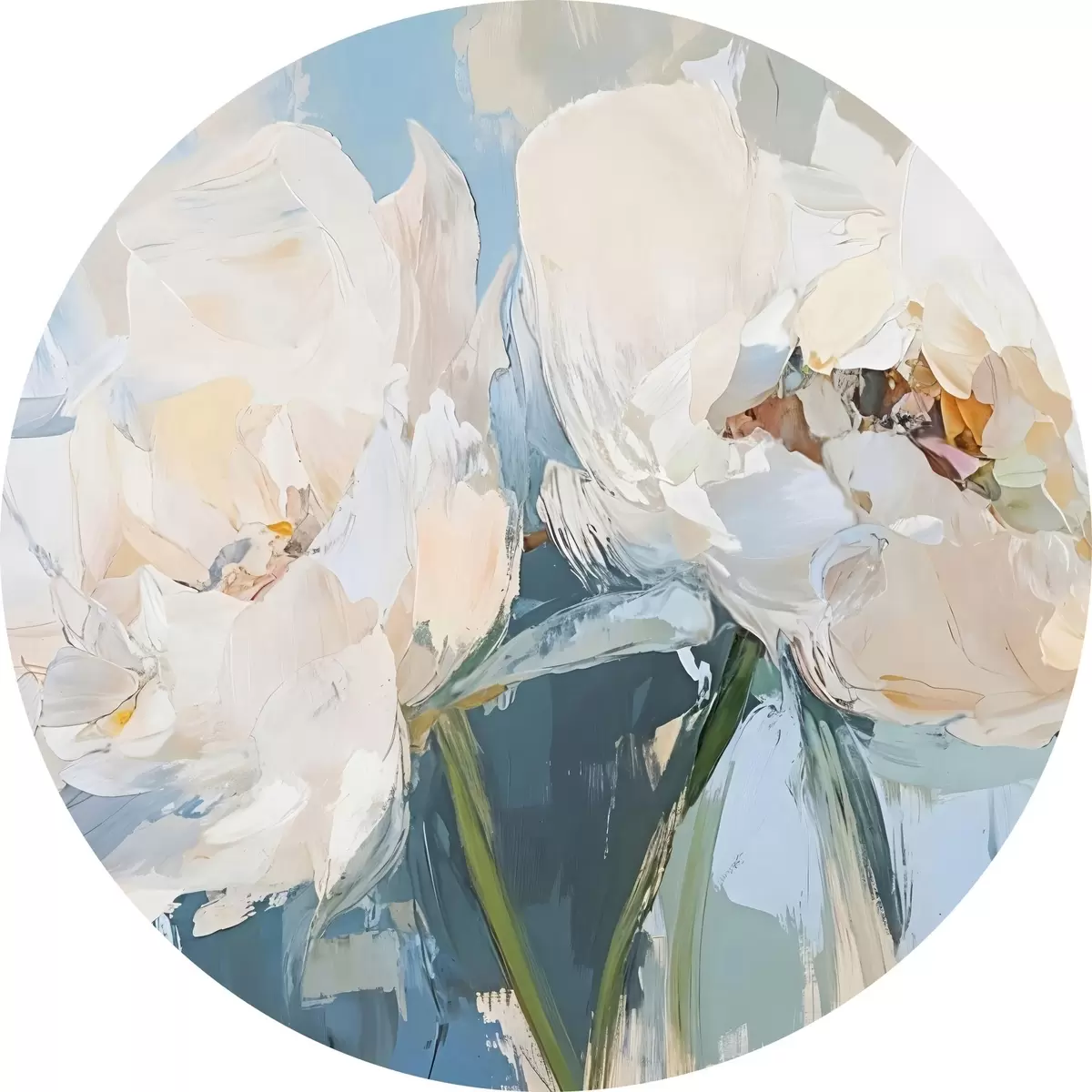 Cuadros redondos Blanco minimalista abstracto peonías pintura al óleo de imitación sobre un fondo azul suave r42226