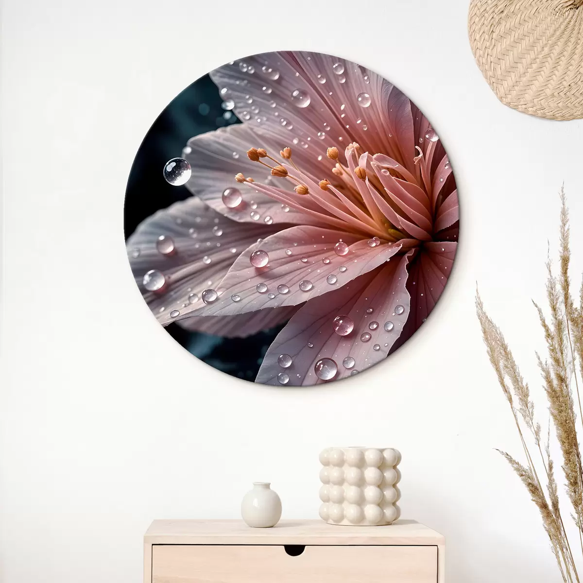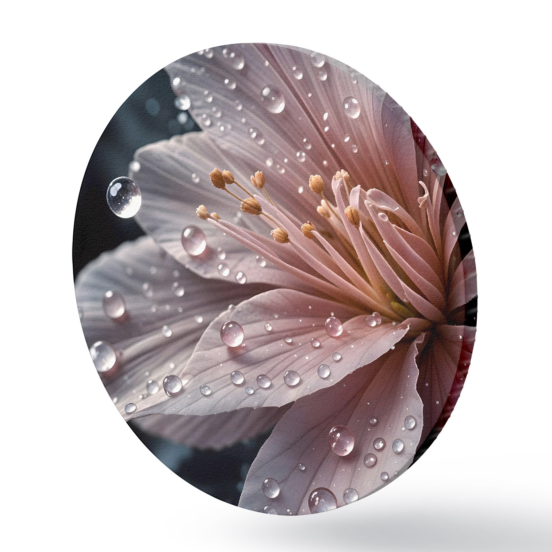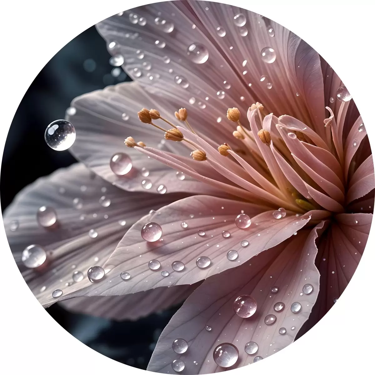 Cuadros redondos Primer plano de una flor rosa con delicados pétalos cubiertos de gotas de agua, sobre un fondo oscuro r42237