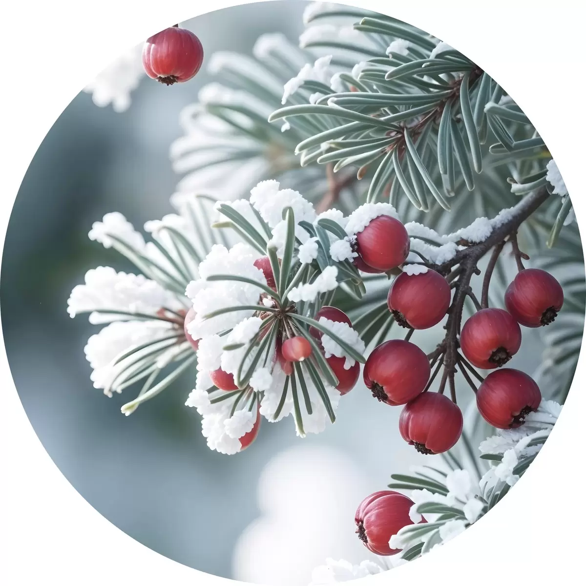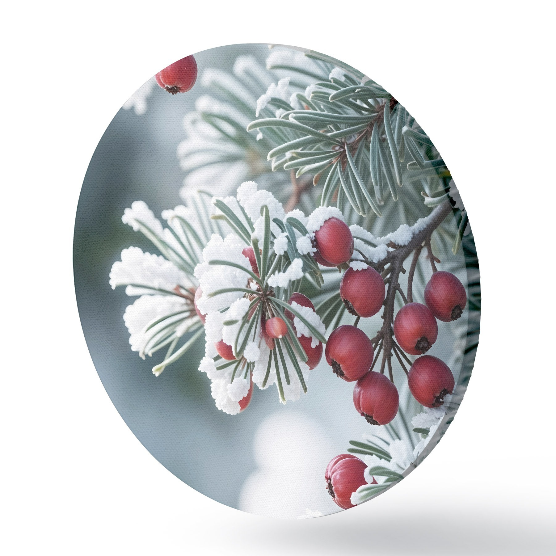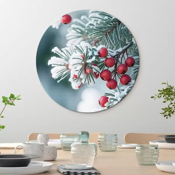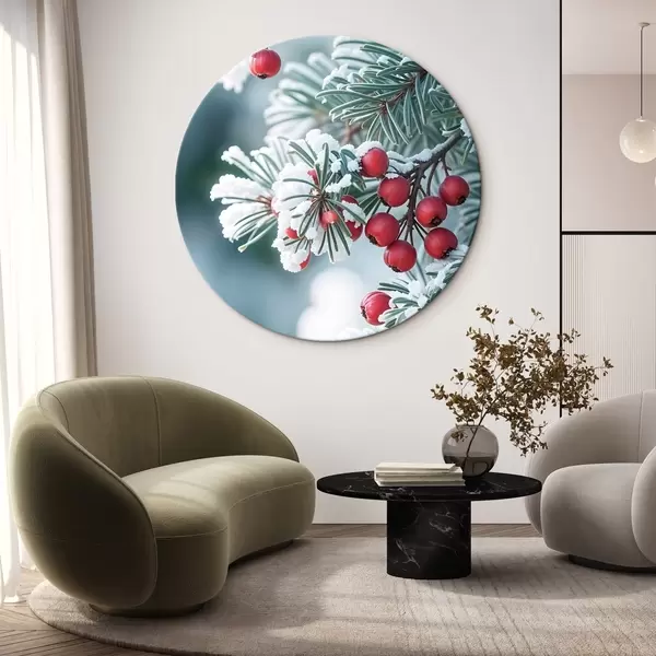 Cuadros redondos Rama de pino nevado con bayas rojas , escena invernal r42238