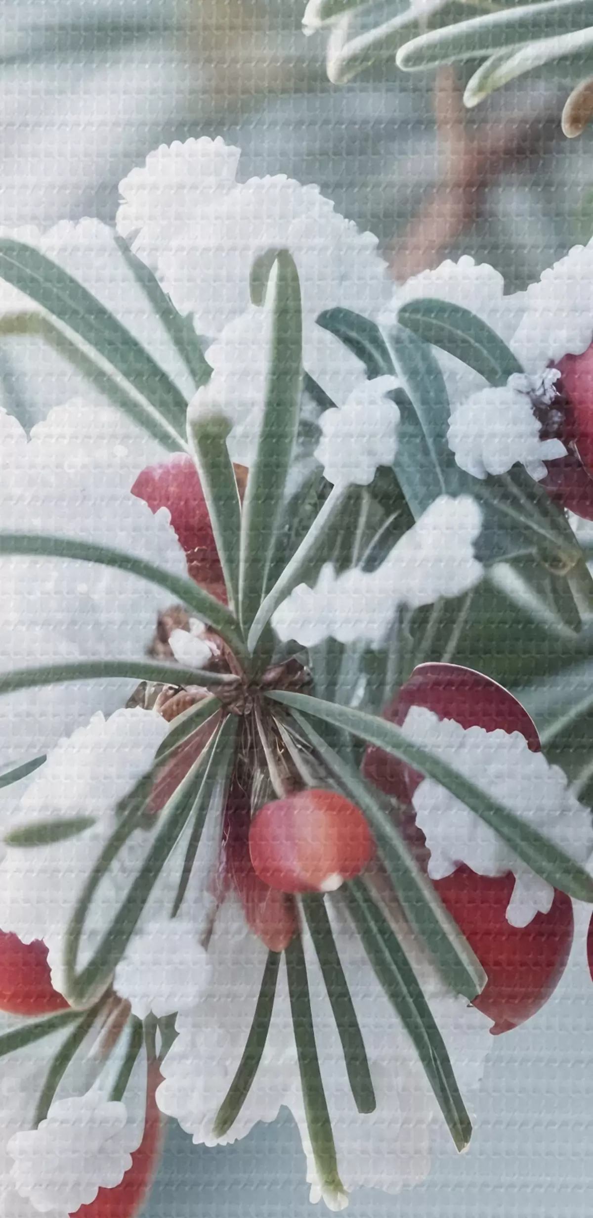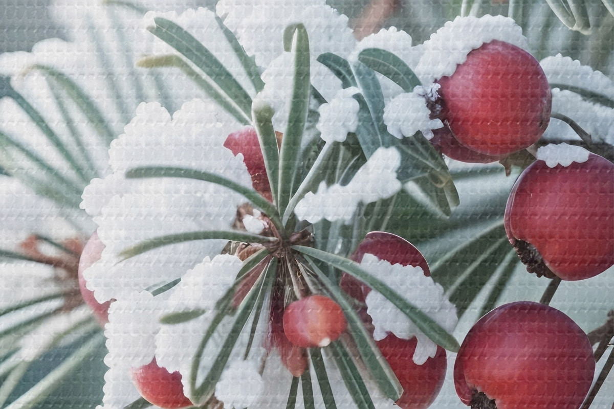 Foto Rama de pino nevado con bayas rojas , escena invernal Nr r42238