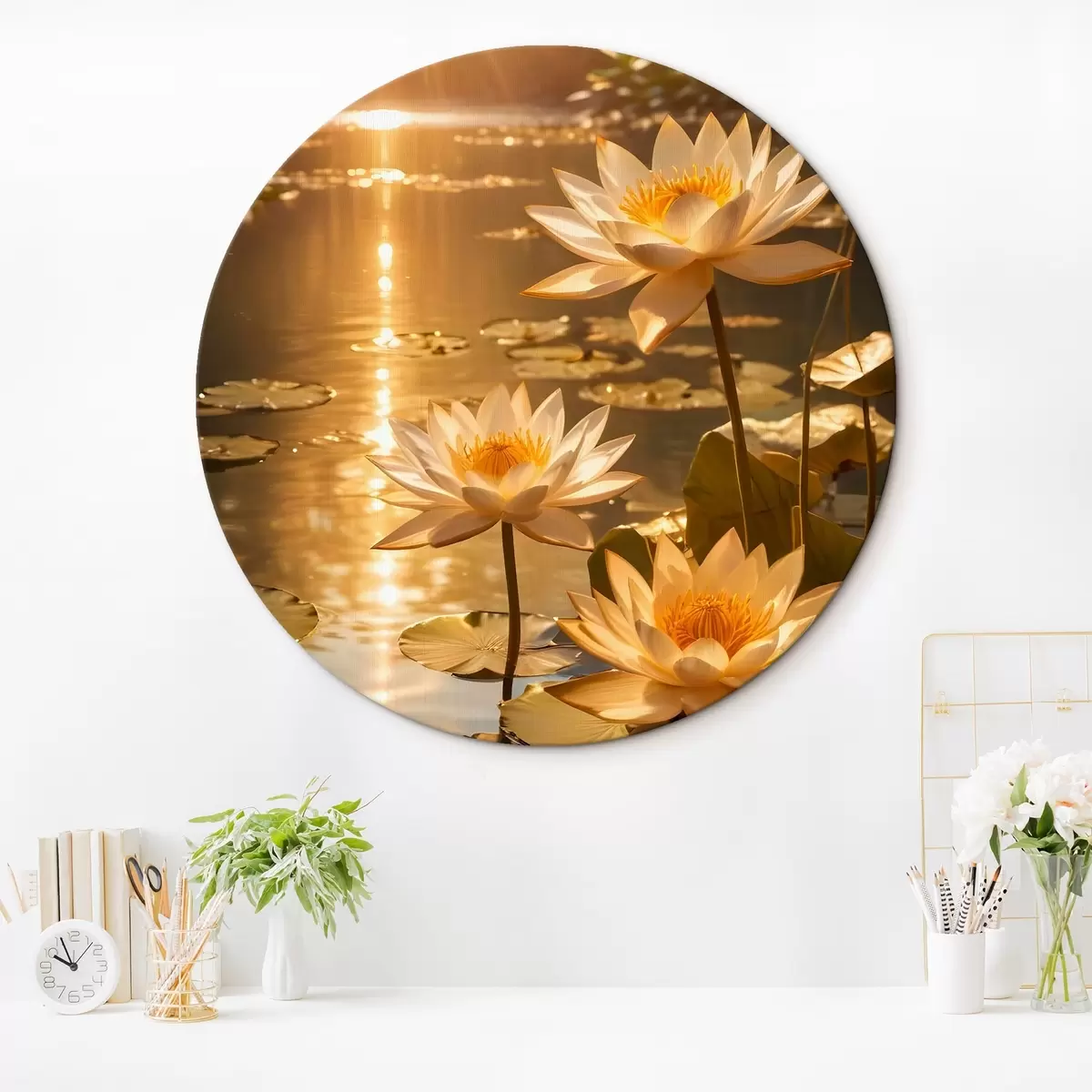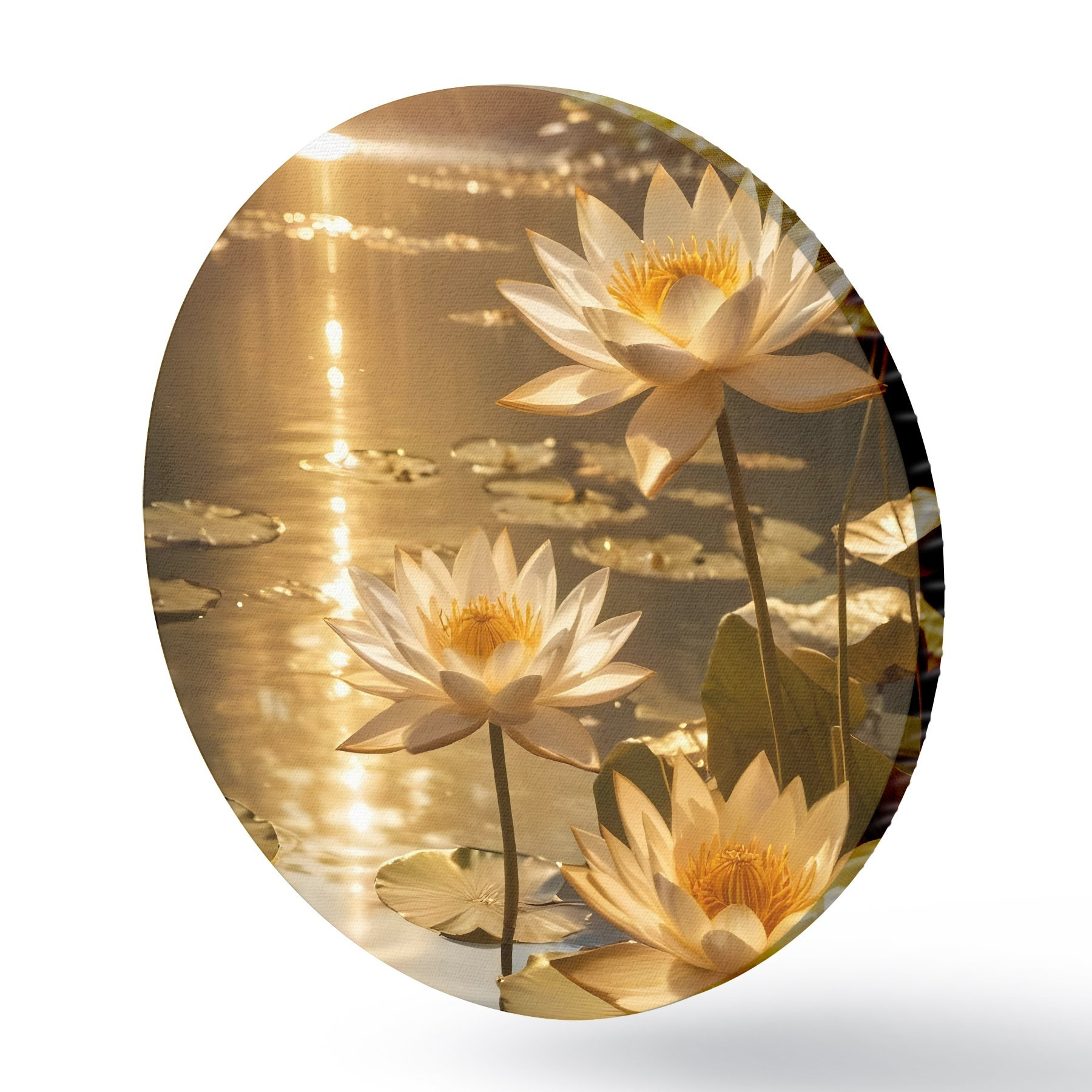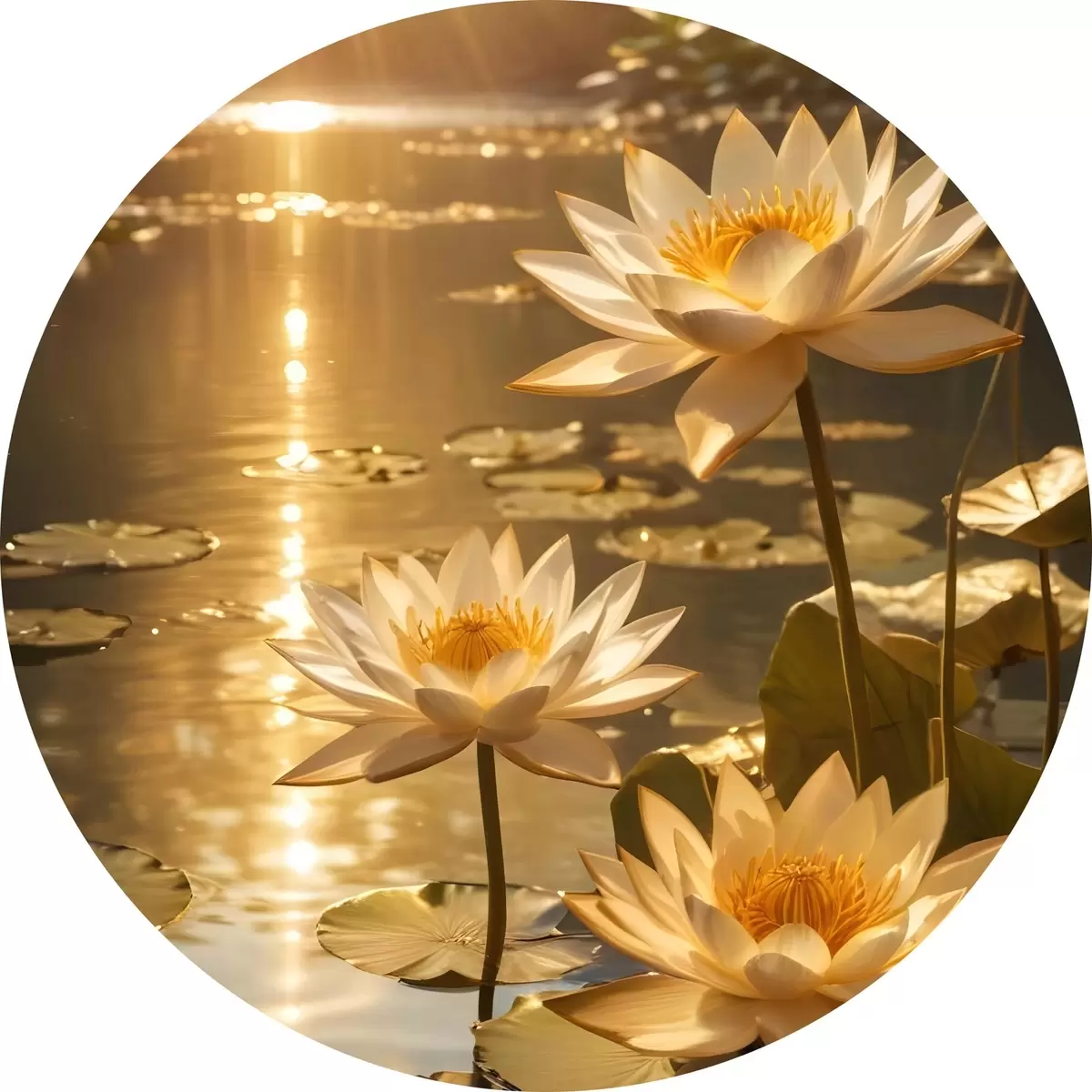 Cuadros redondos Flores de loto blancas flotando en un estanque en calma con el sol, creando un ambiente sereno y tranquilo r42239