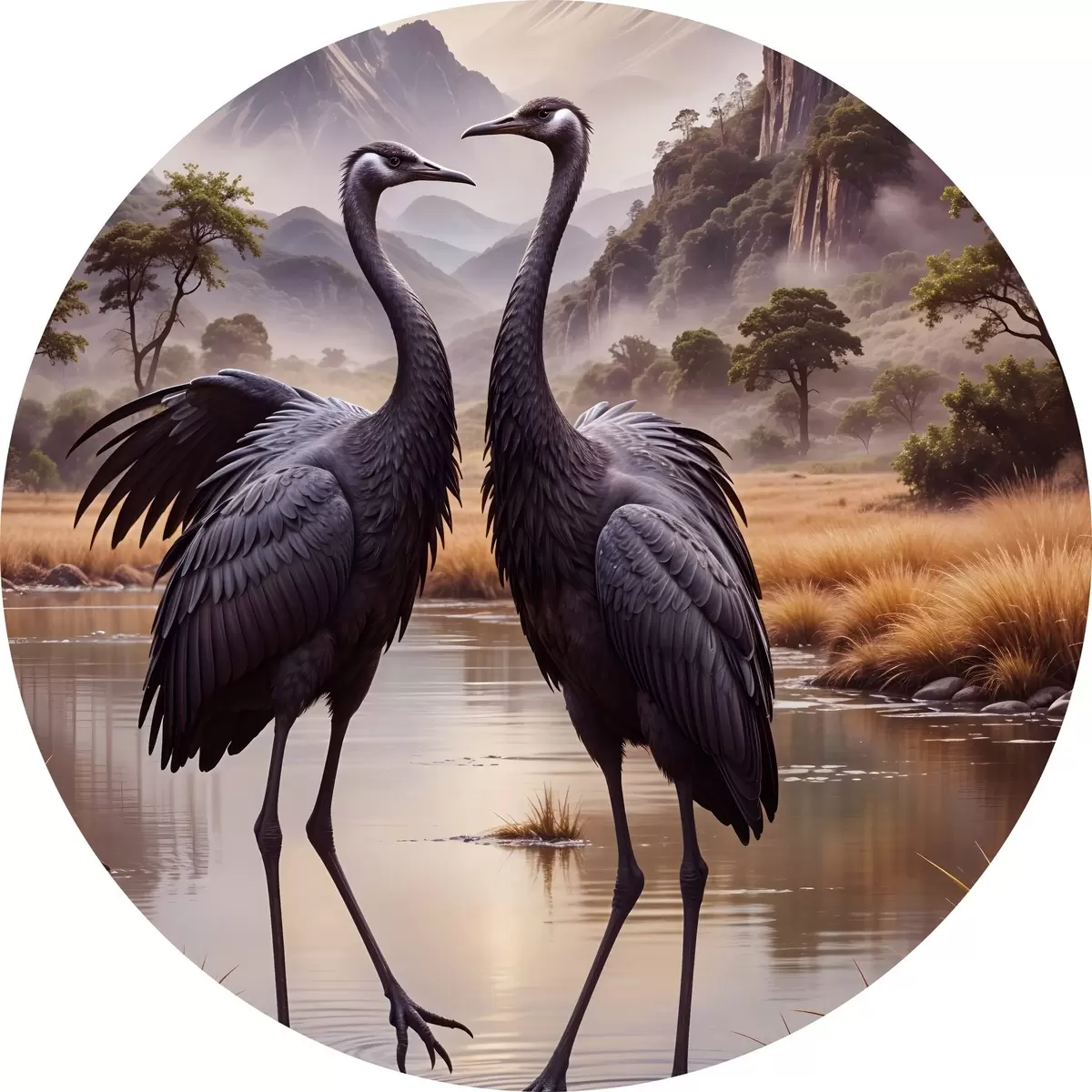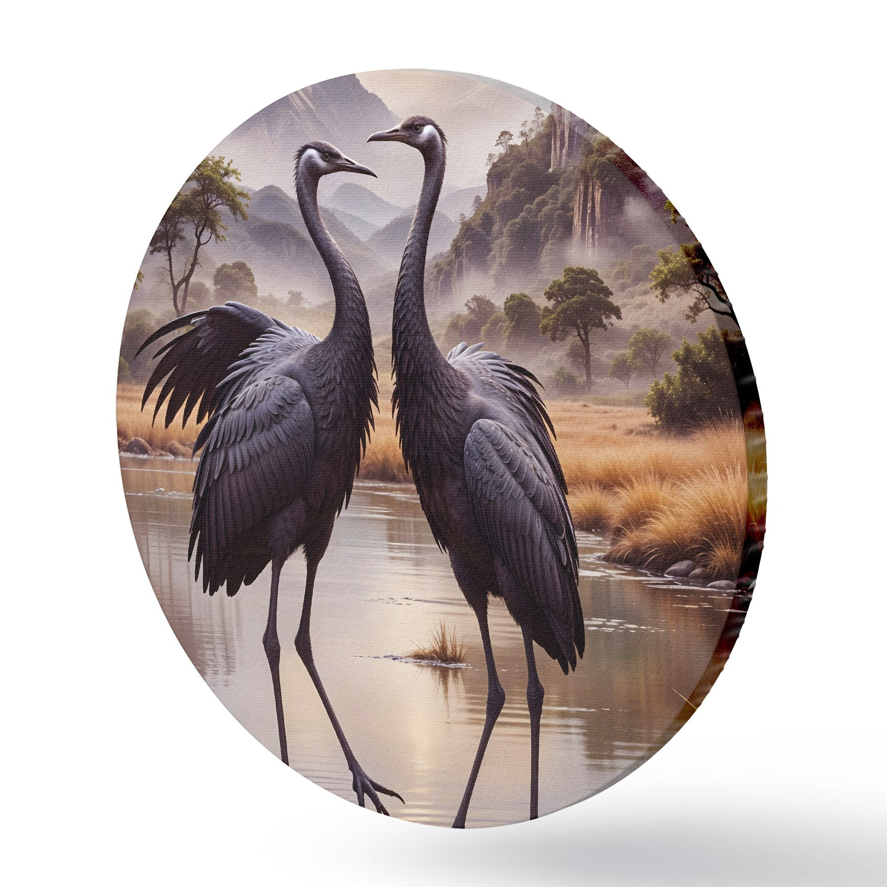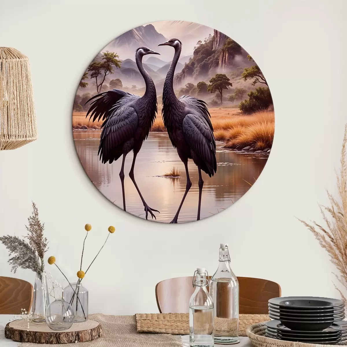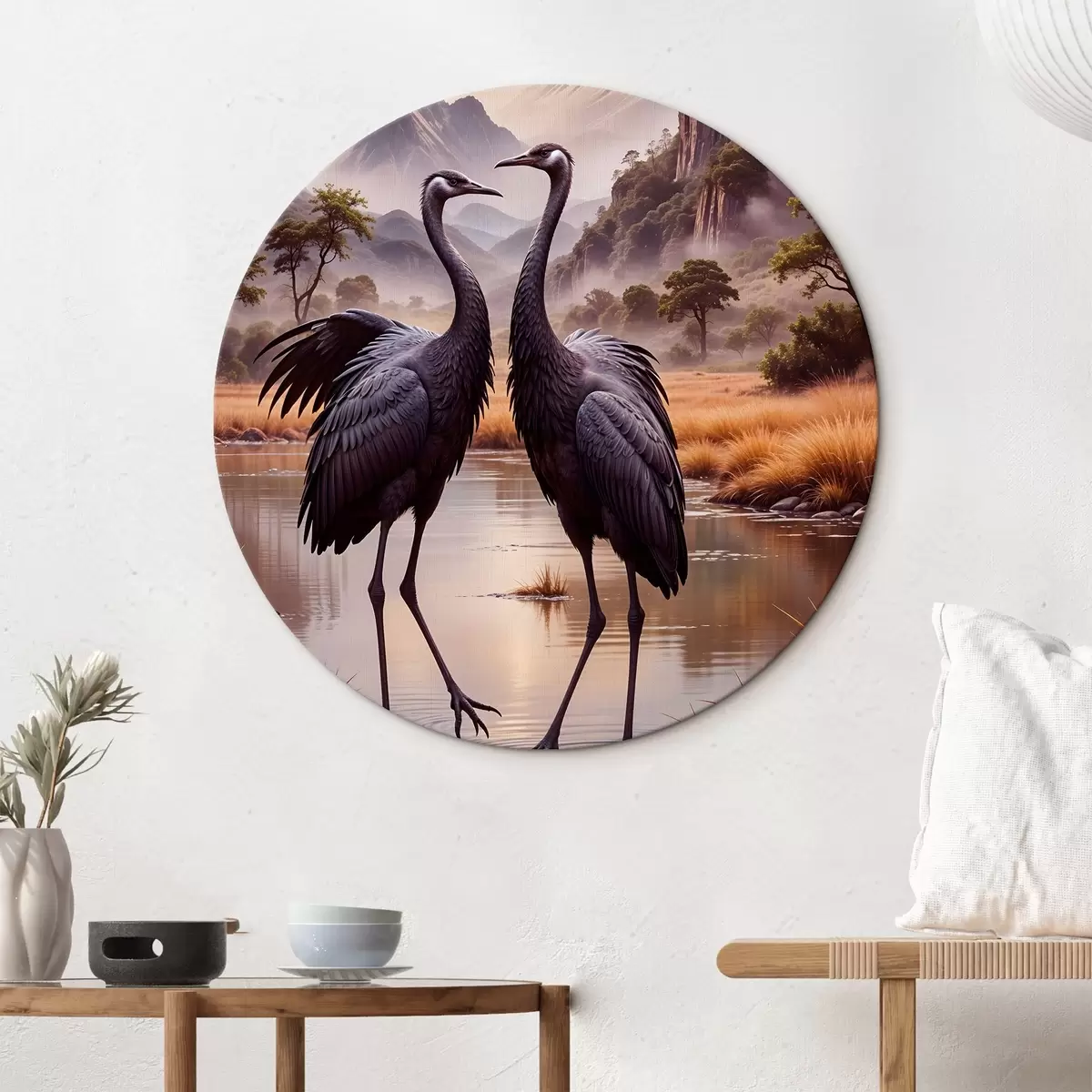 Cuadros redondos Dos grandes grullas negras de pie en un estanque poco profundo , con un paisaje montañoso de fondo r42240