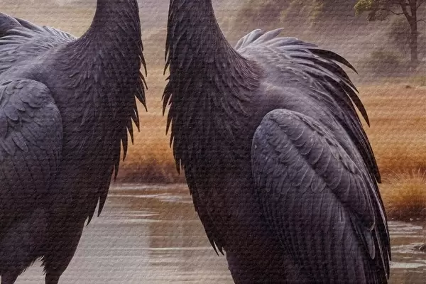 Foto Dos grandes grullas negras de pie en un estanque poco profundo , con un paisaje montañoso de fondo Nr r42240