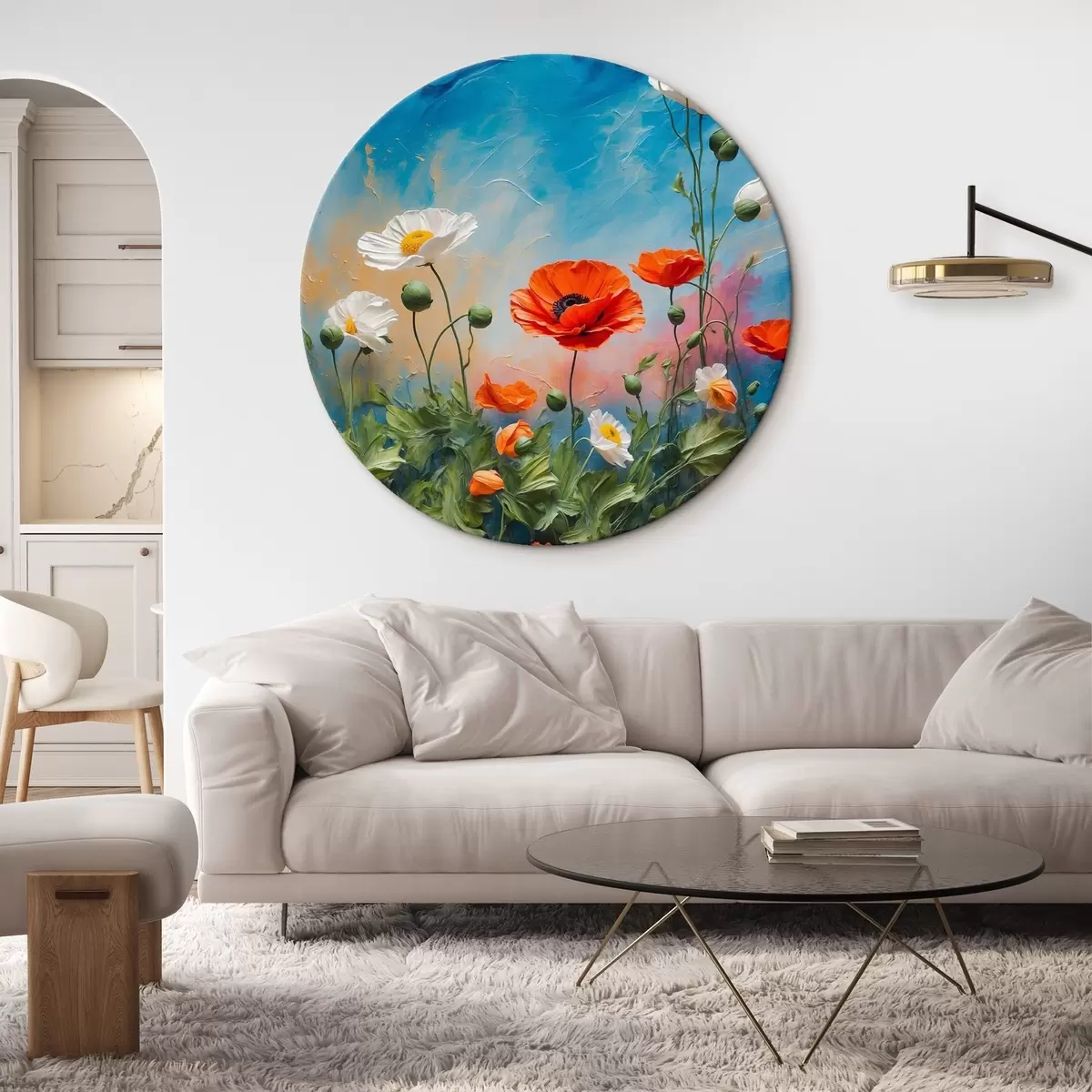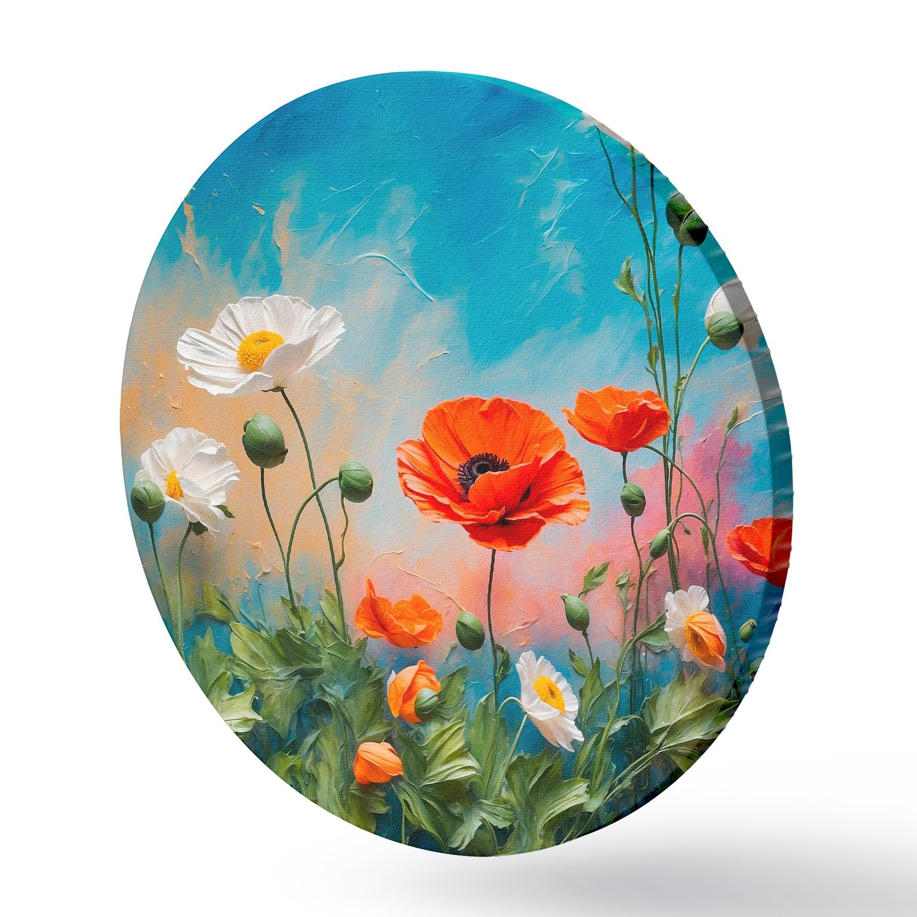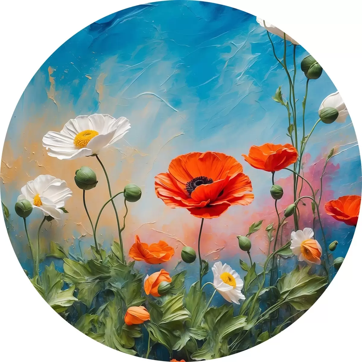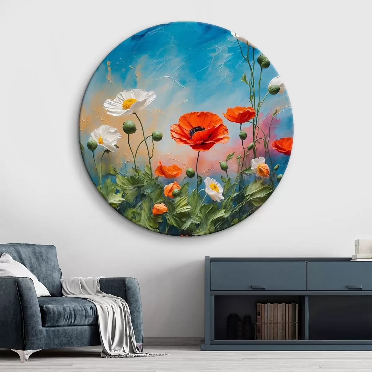 Cuadros redondos Margaritas y amapolas sobre fondo azul r42261