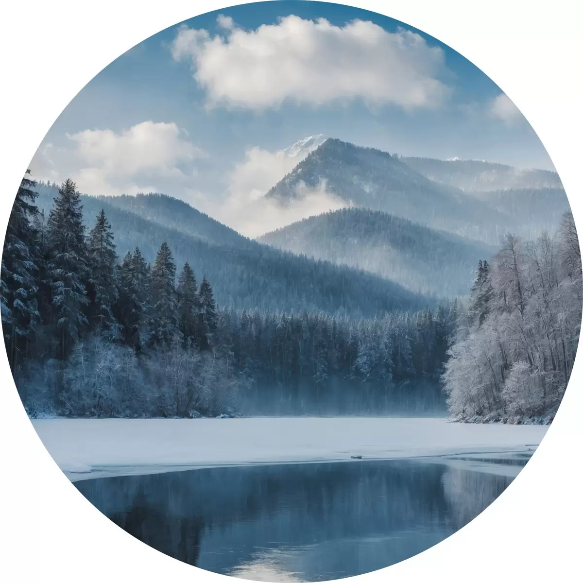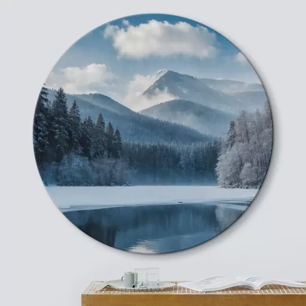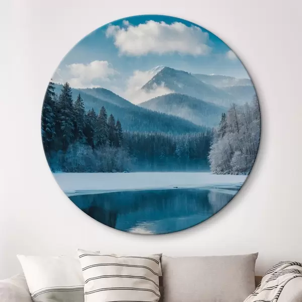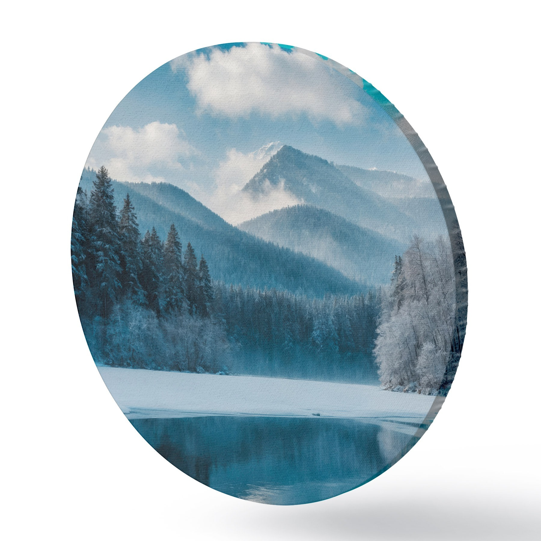 Cuadros redondos Vista del bosque invernal y las montañas r42278