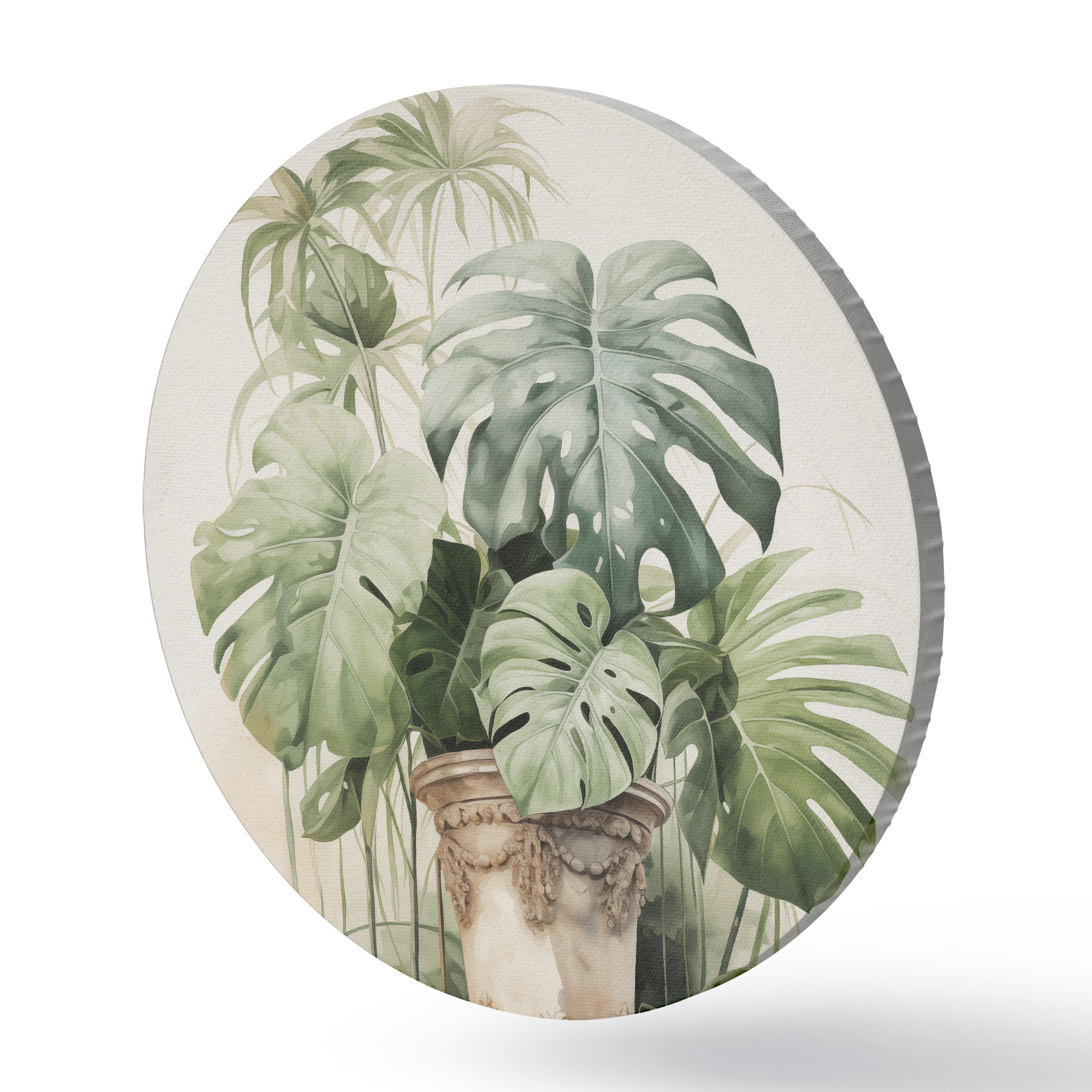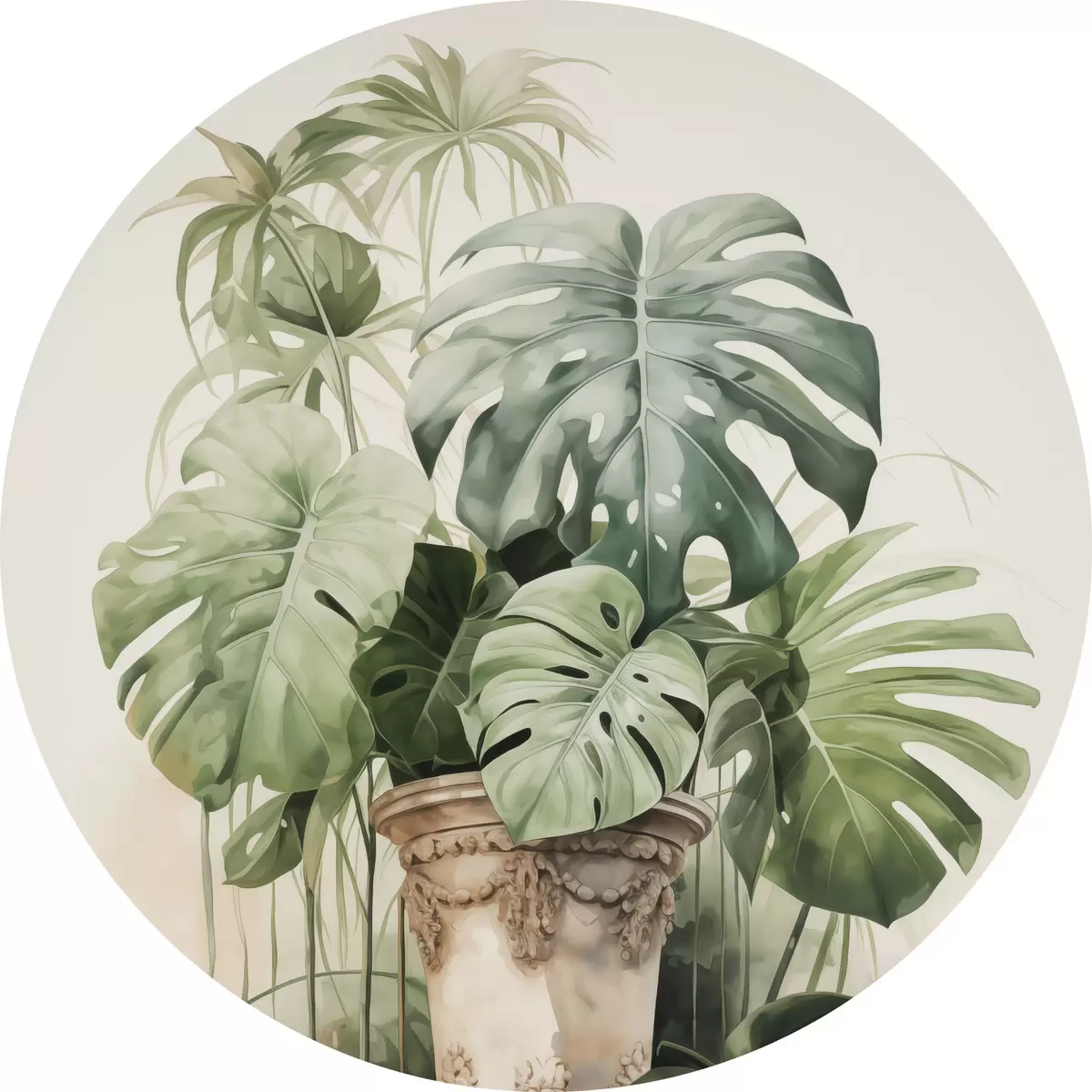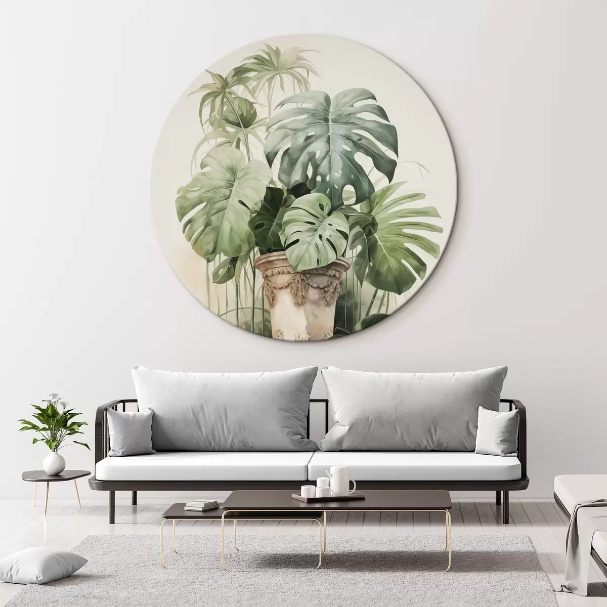 Cuadros redondos Hojas de monstera tropical sobre una columna imitación acuarela r42351