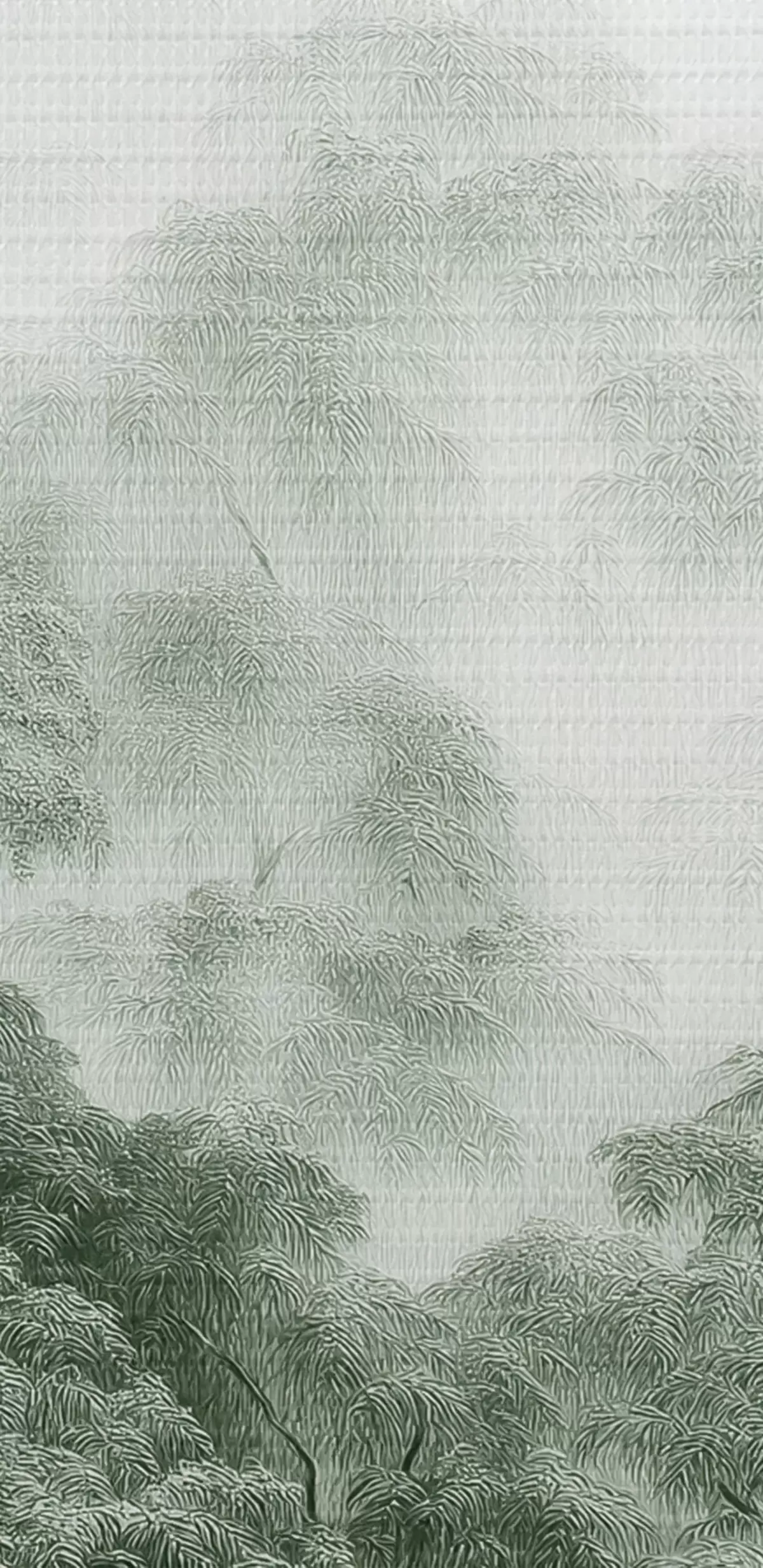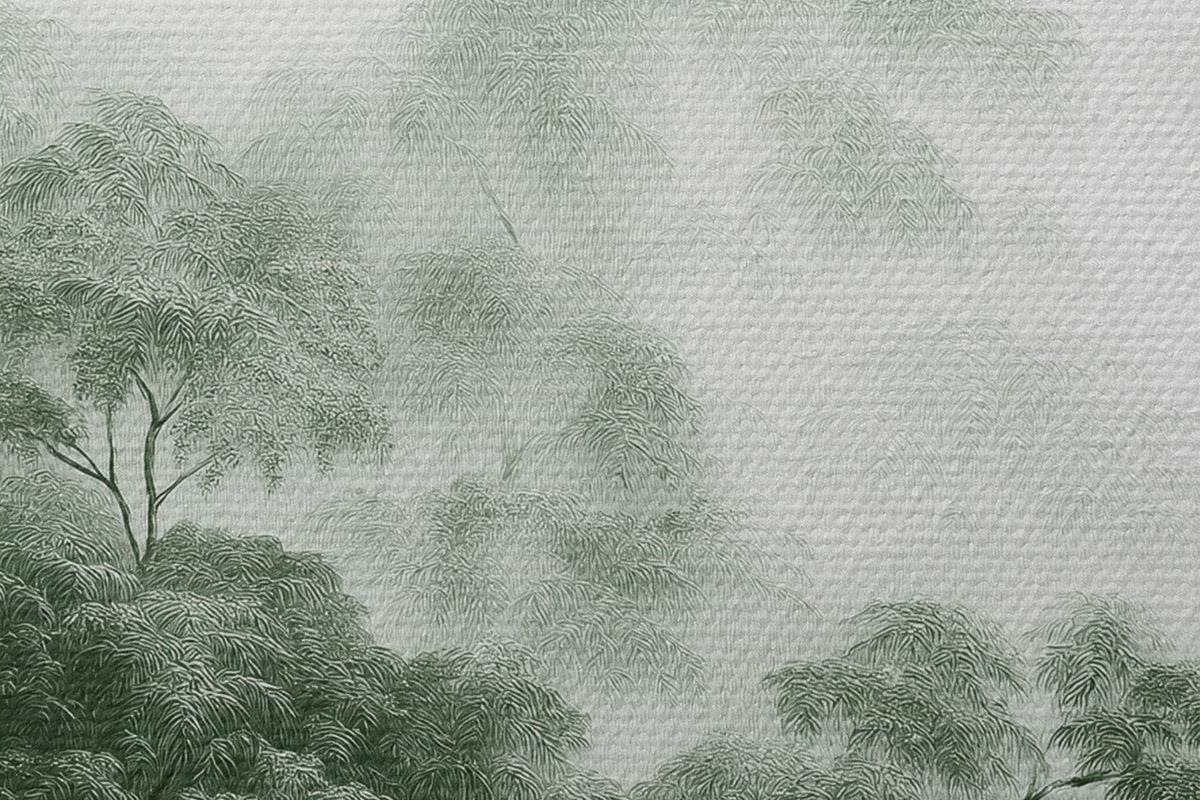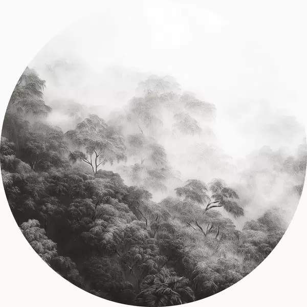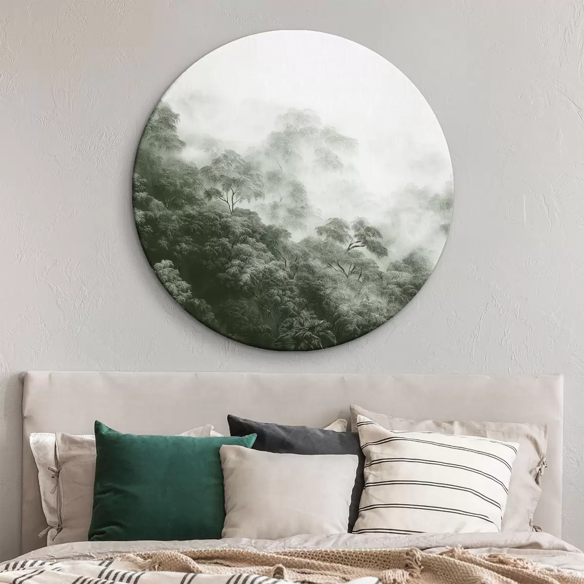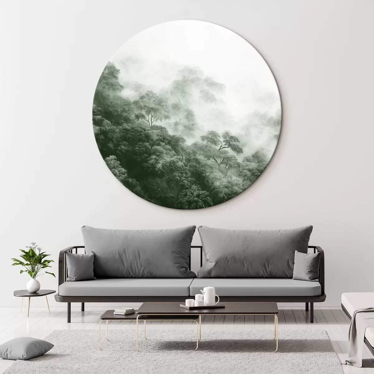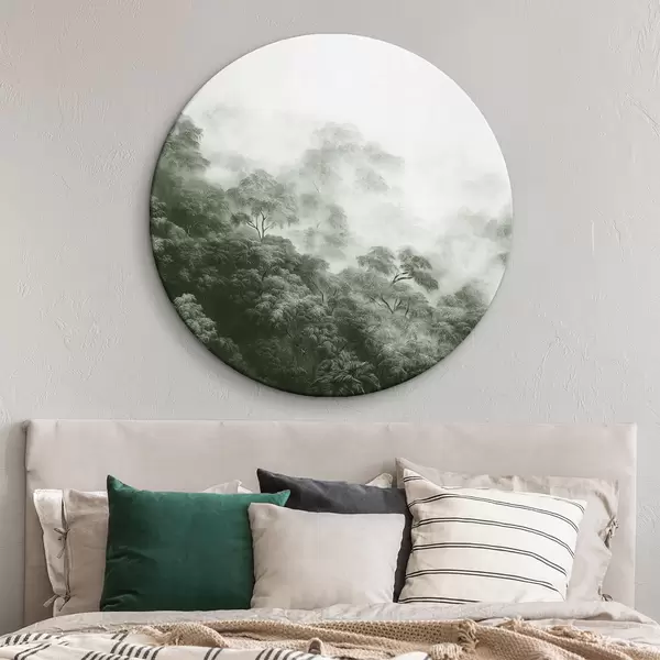 Cuadros redondos Bosque tropical en la niebla, palmeras, colores verdes r42371