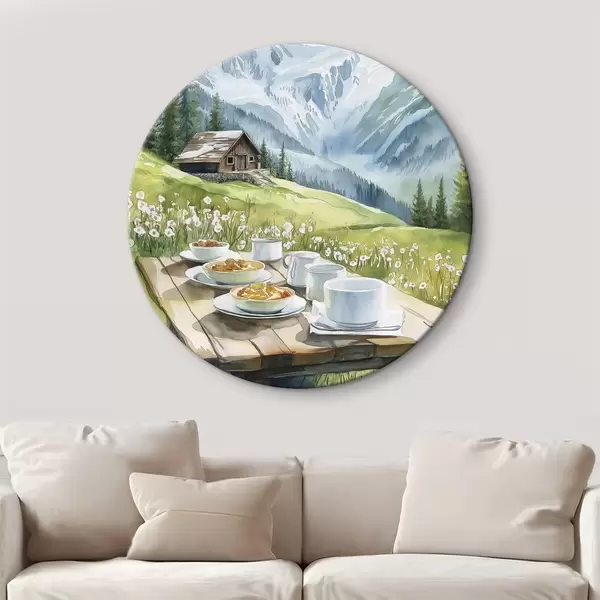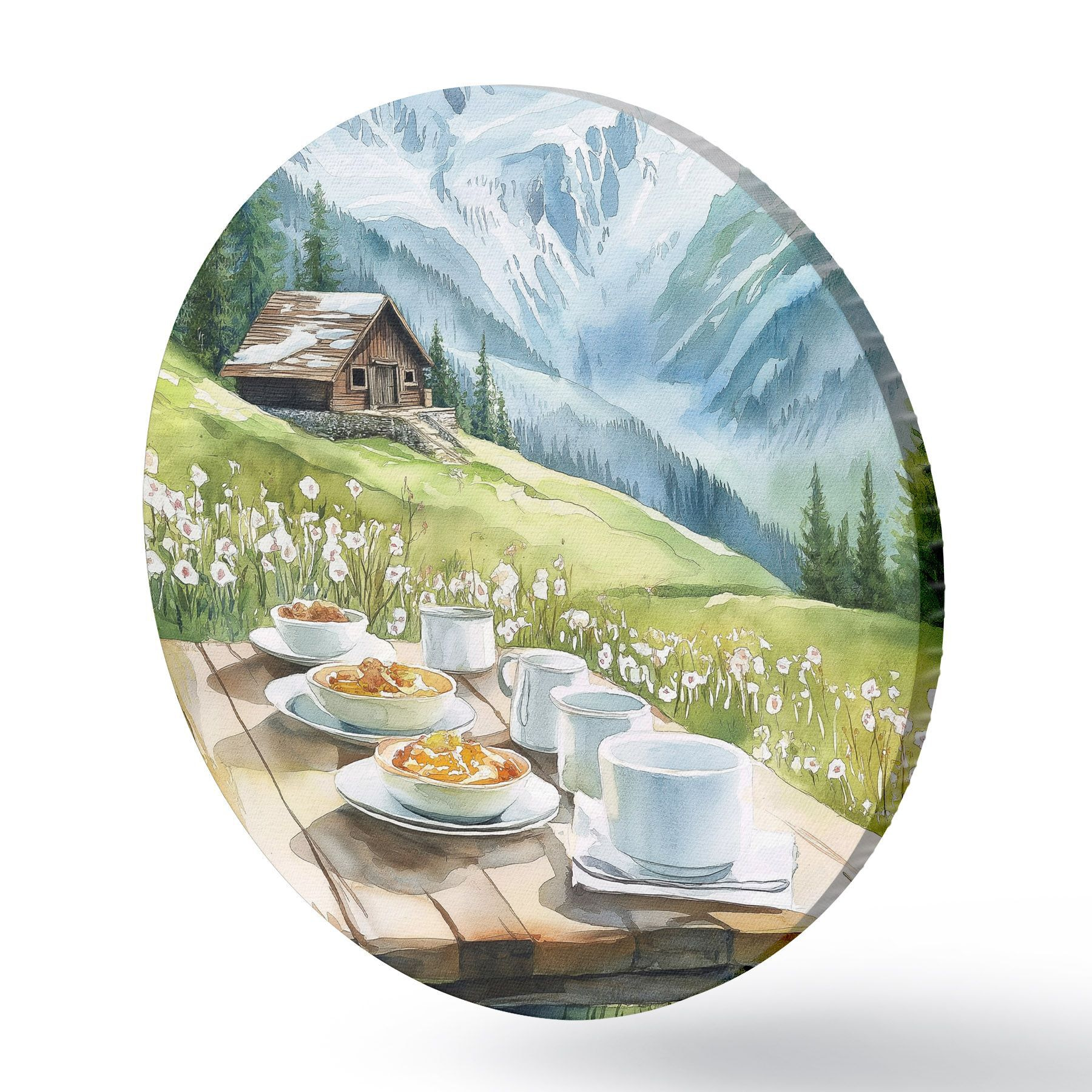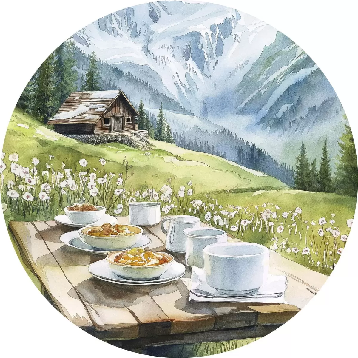 Cuadros redondos Desayuno en los Alpes, montañas, bosque, naturaleza, verano, estilo acuarela r42426