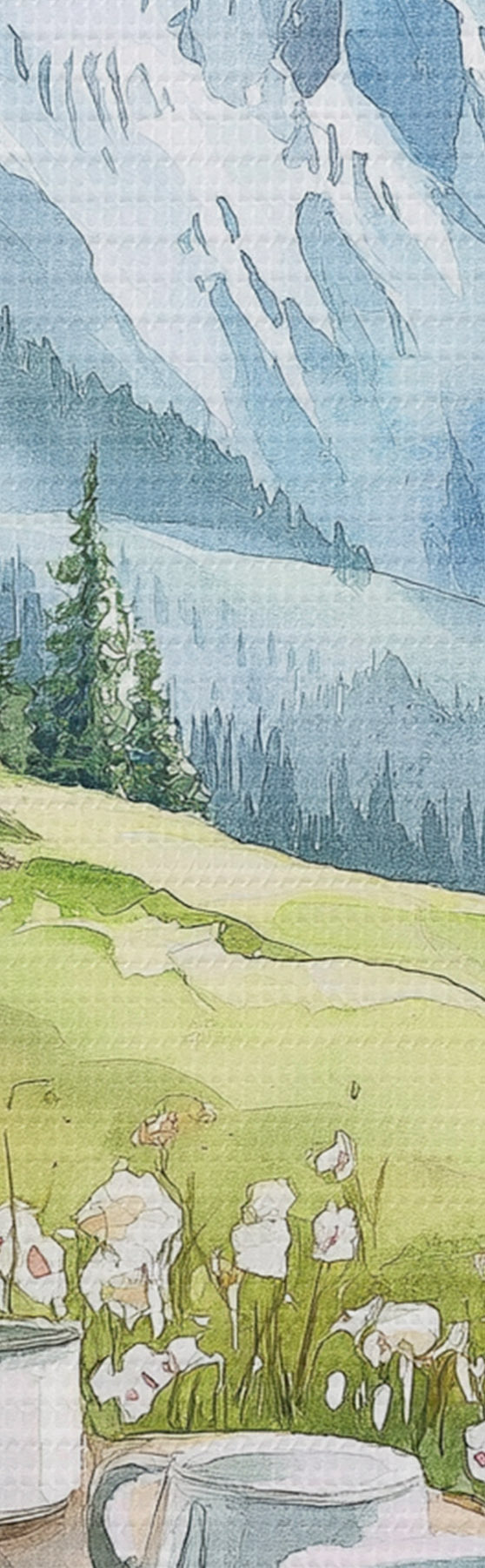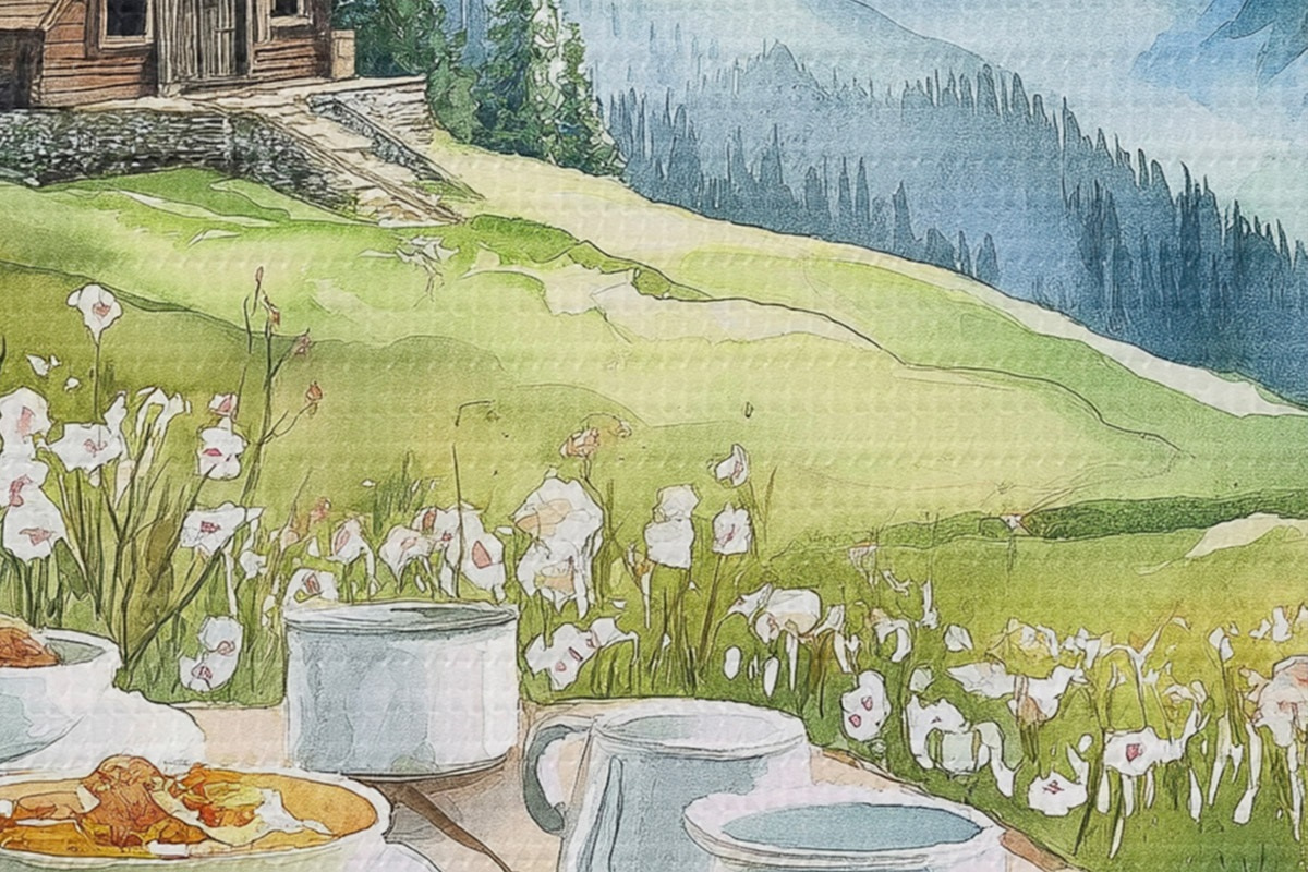 Foto Desayuno en los Alpes, montañas, bosque, naturaleza, verano, estilo acuarela Nr r42426