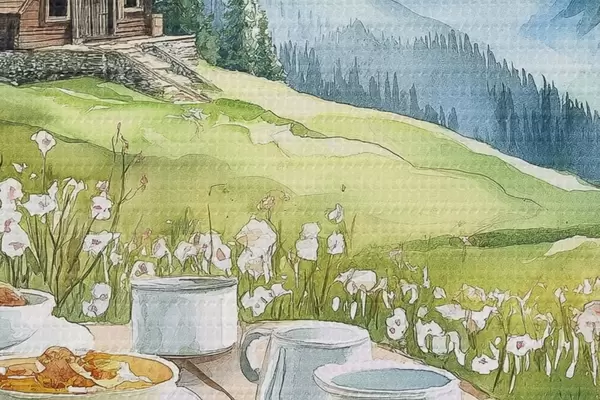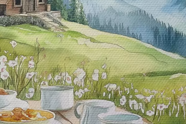 Foto Desayuno en los Alpes, montañas, bosque, naturaleza, verano, estilo acuarela Nr r42426