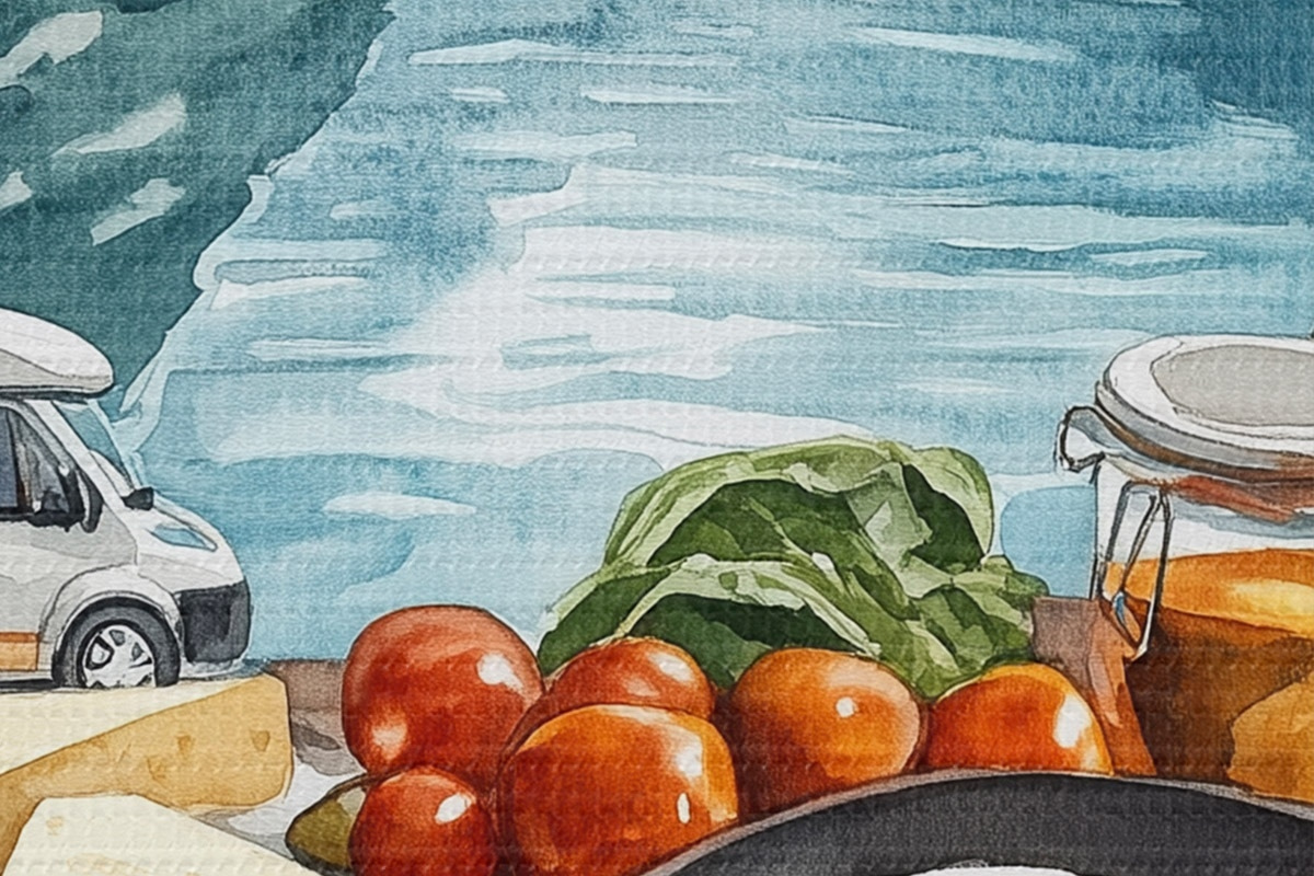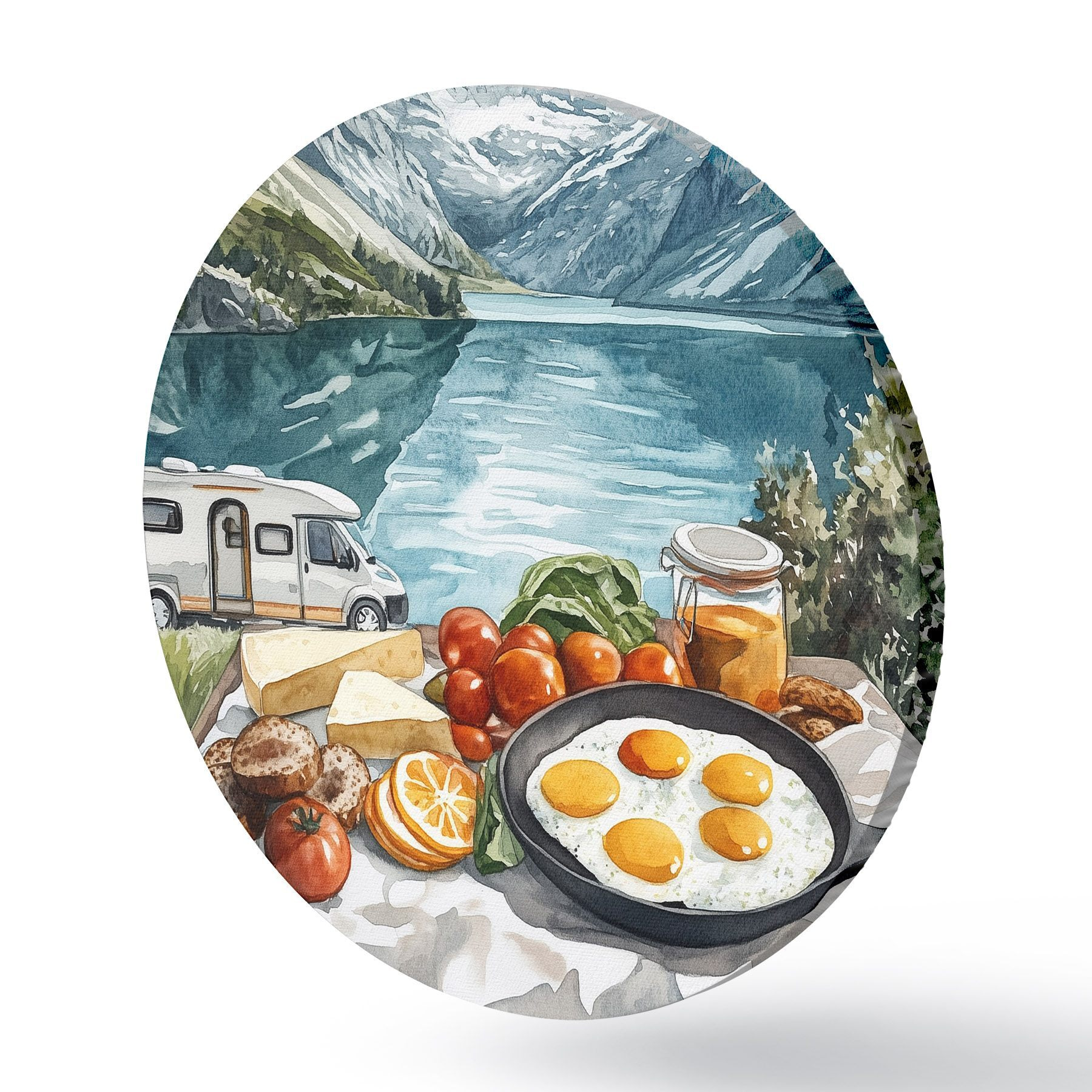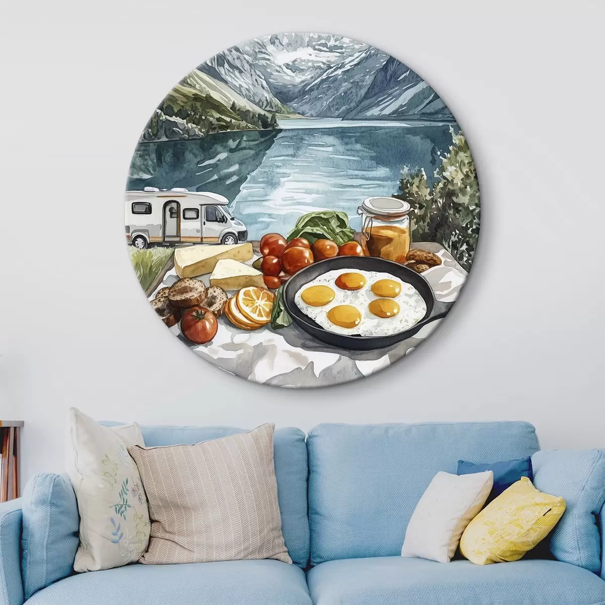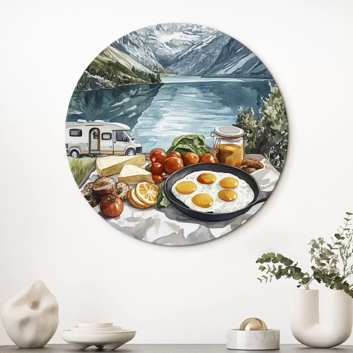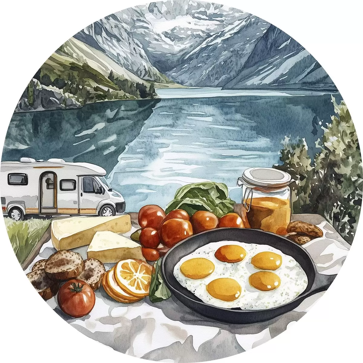 Cuadros redondos Viajar, paisajes naturales, estilo acuarela, Noruega, desayuno, furgoneta r42431