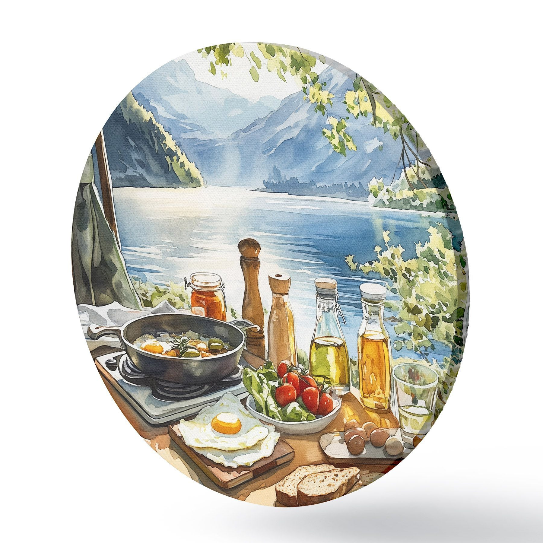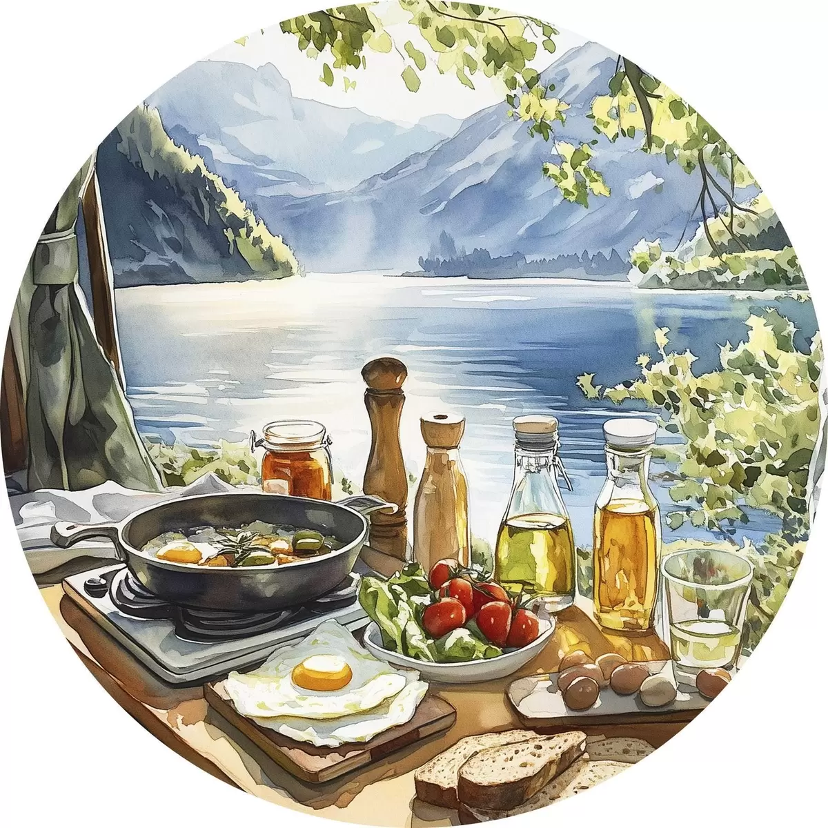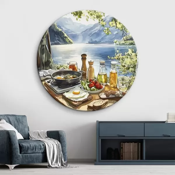 Cuadros redondos Hermosa mañana de verano, lago, estilo acuarela, desayuno, viajar r42433