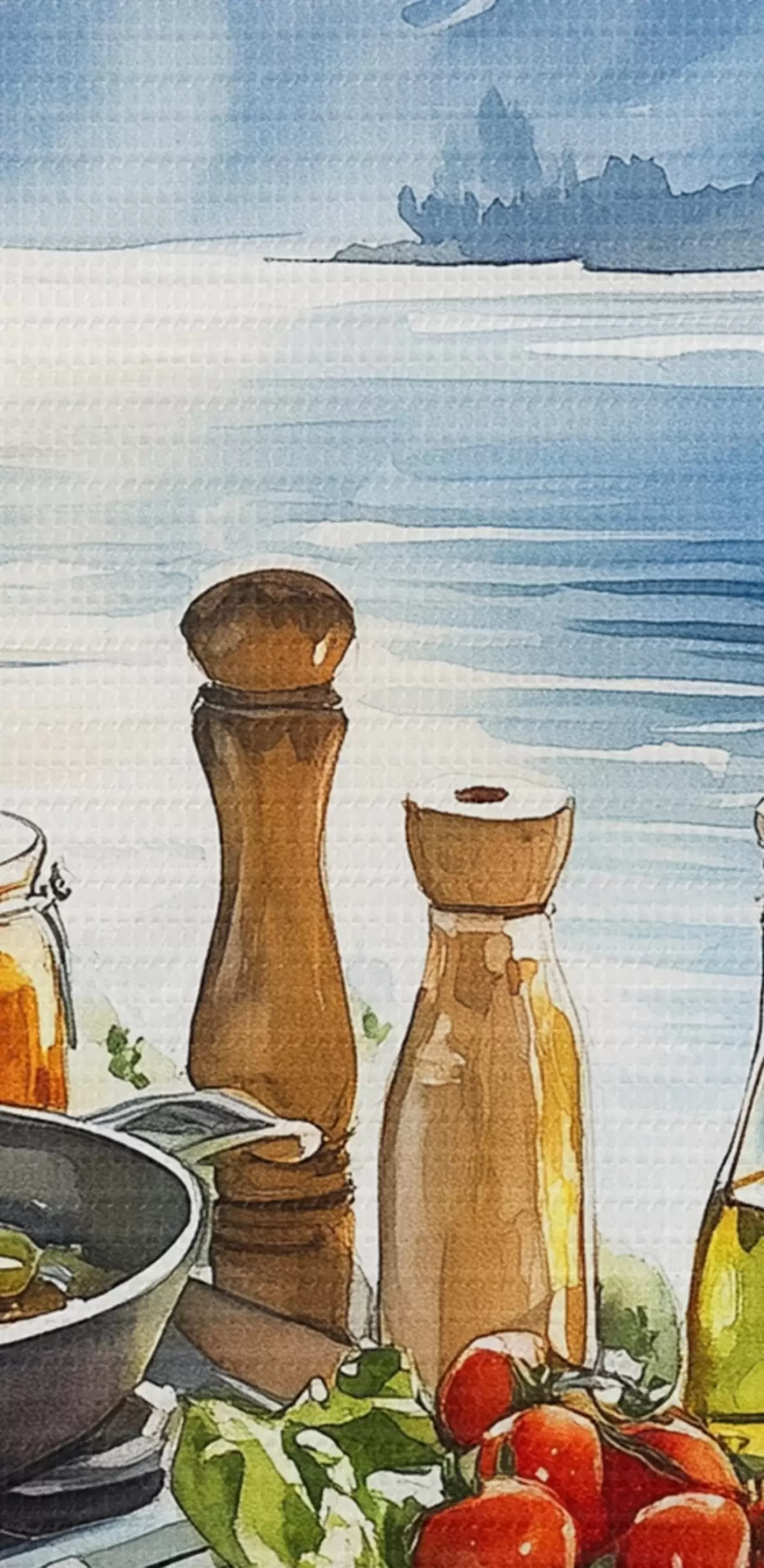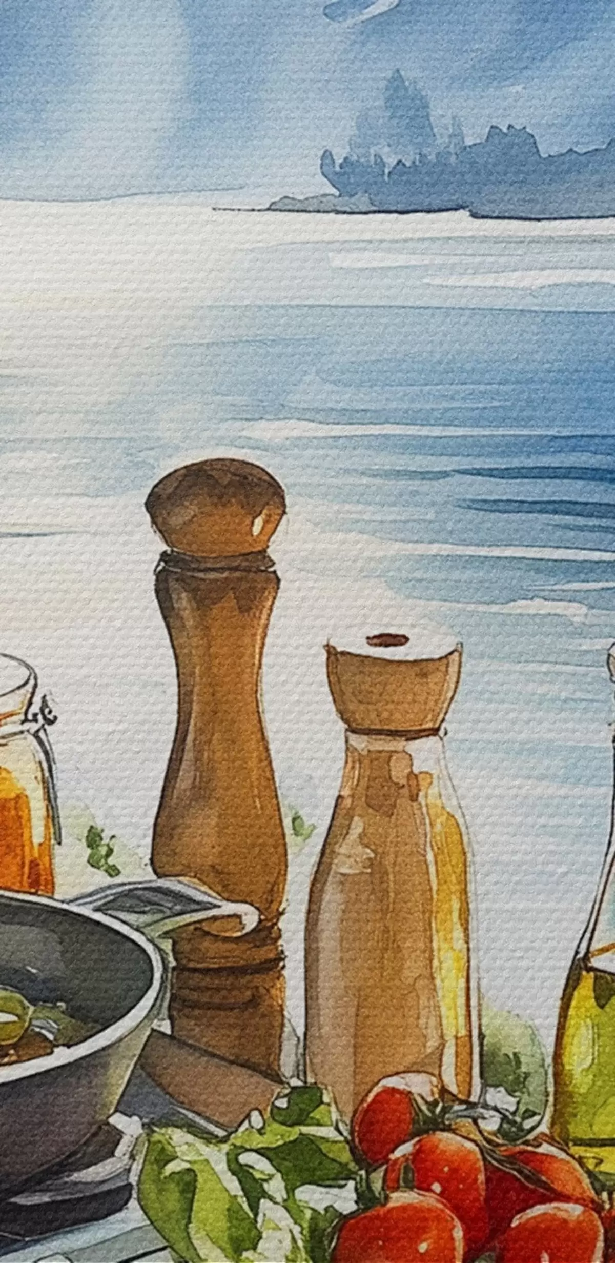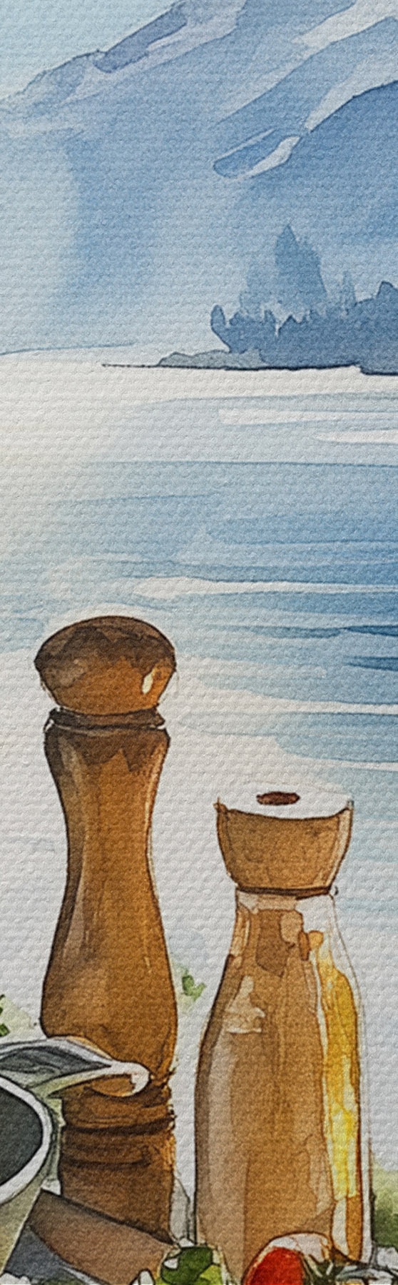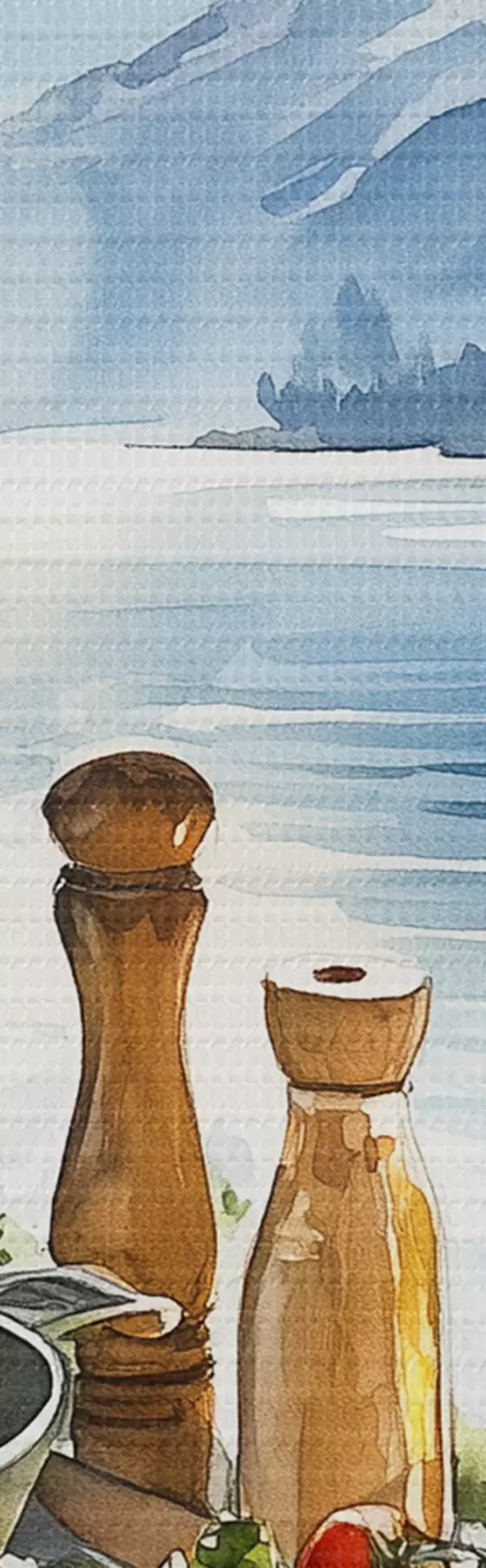 Foto Hermosa mañana de verano, lago, estilo acuarela, desayuno, viajar Nr r42433
