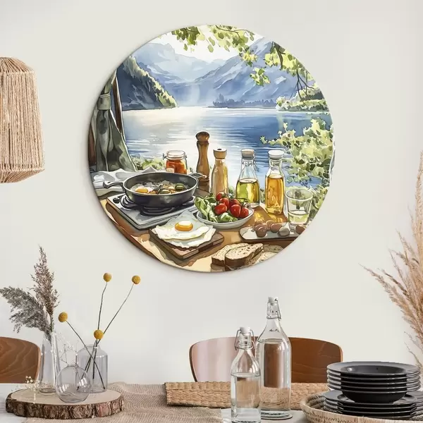Cuadros redondos Hermosa mañana de verano, lago, estilo acuarela, desayuno, viajar r42433