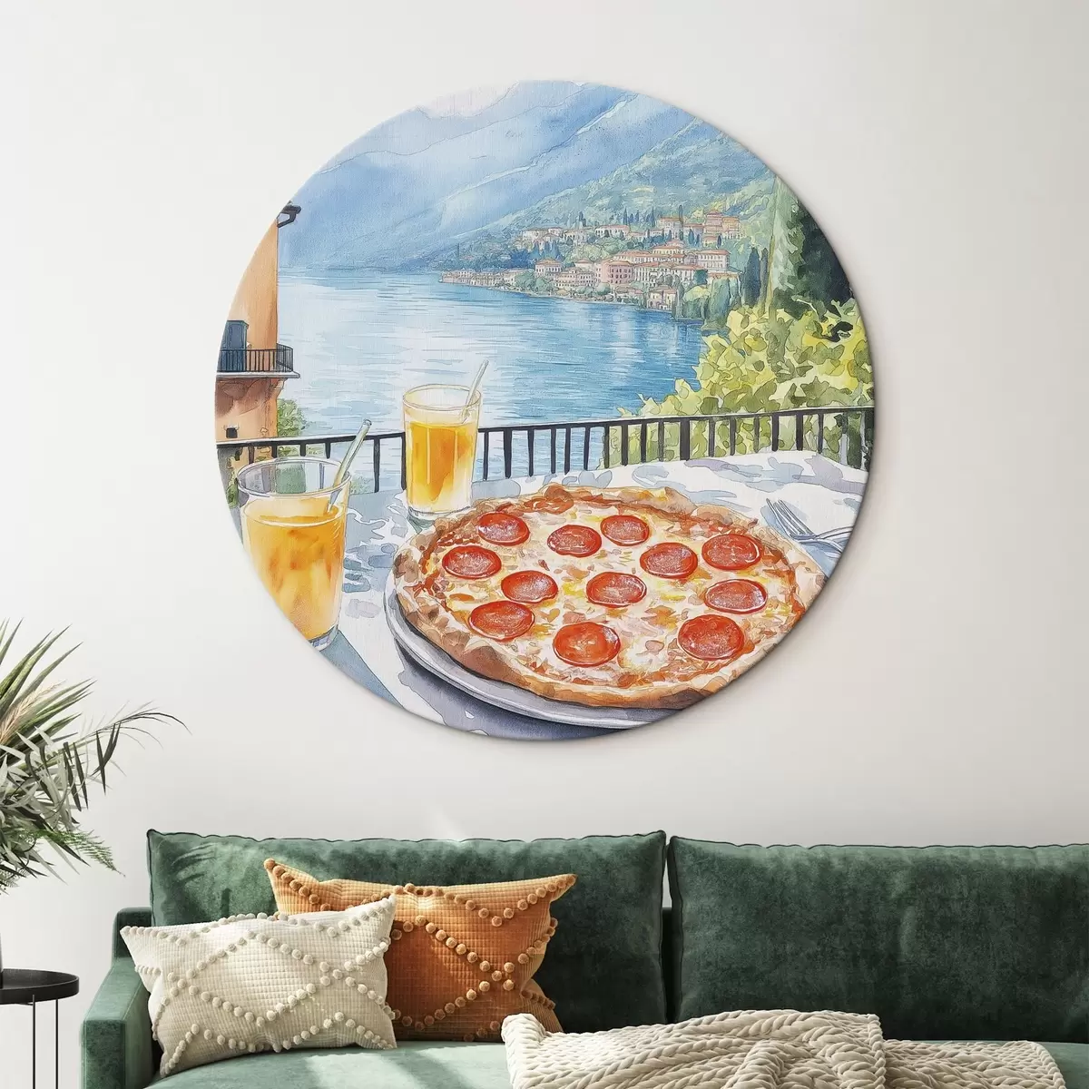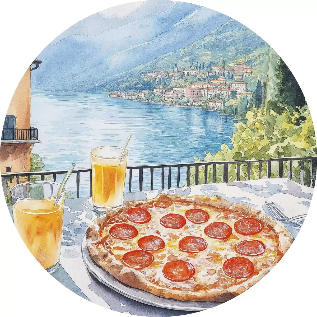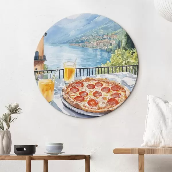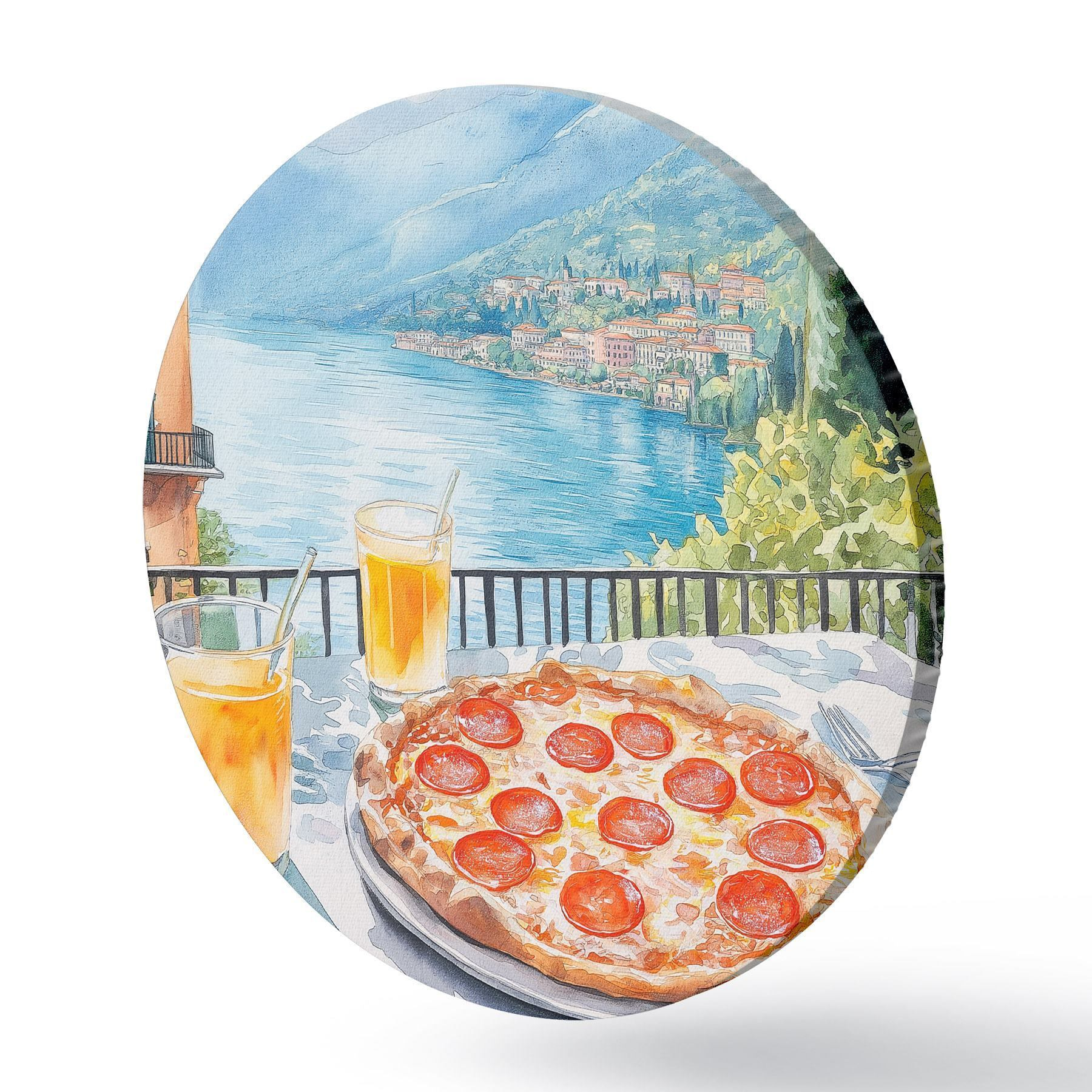 Cuadros redondos Brunch en Italia, estilo acuarela, pizza margarita, lago, naturaleza de verano r42436