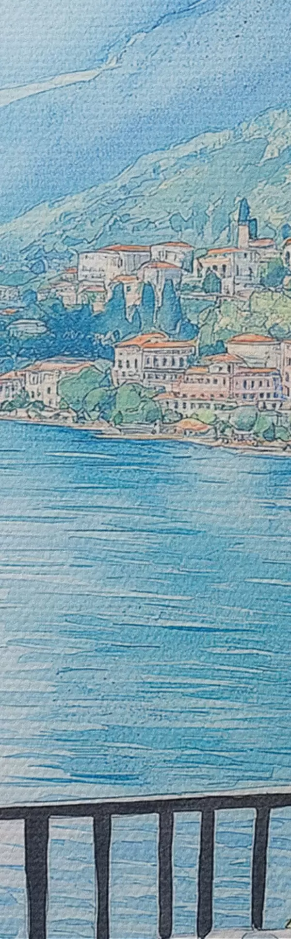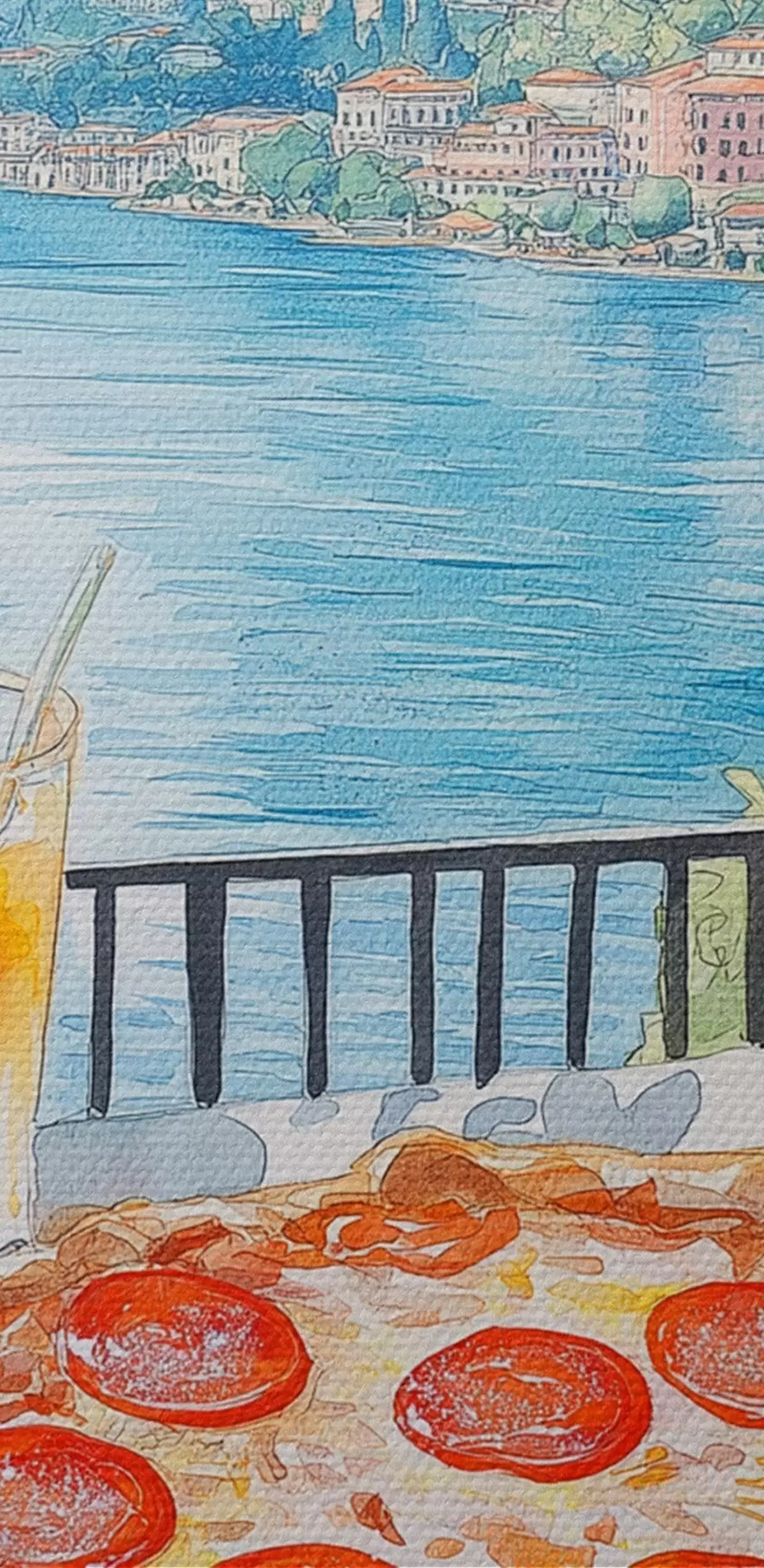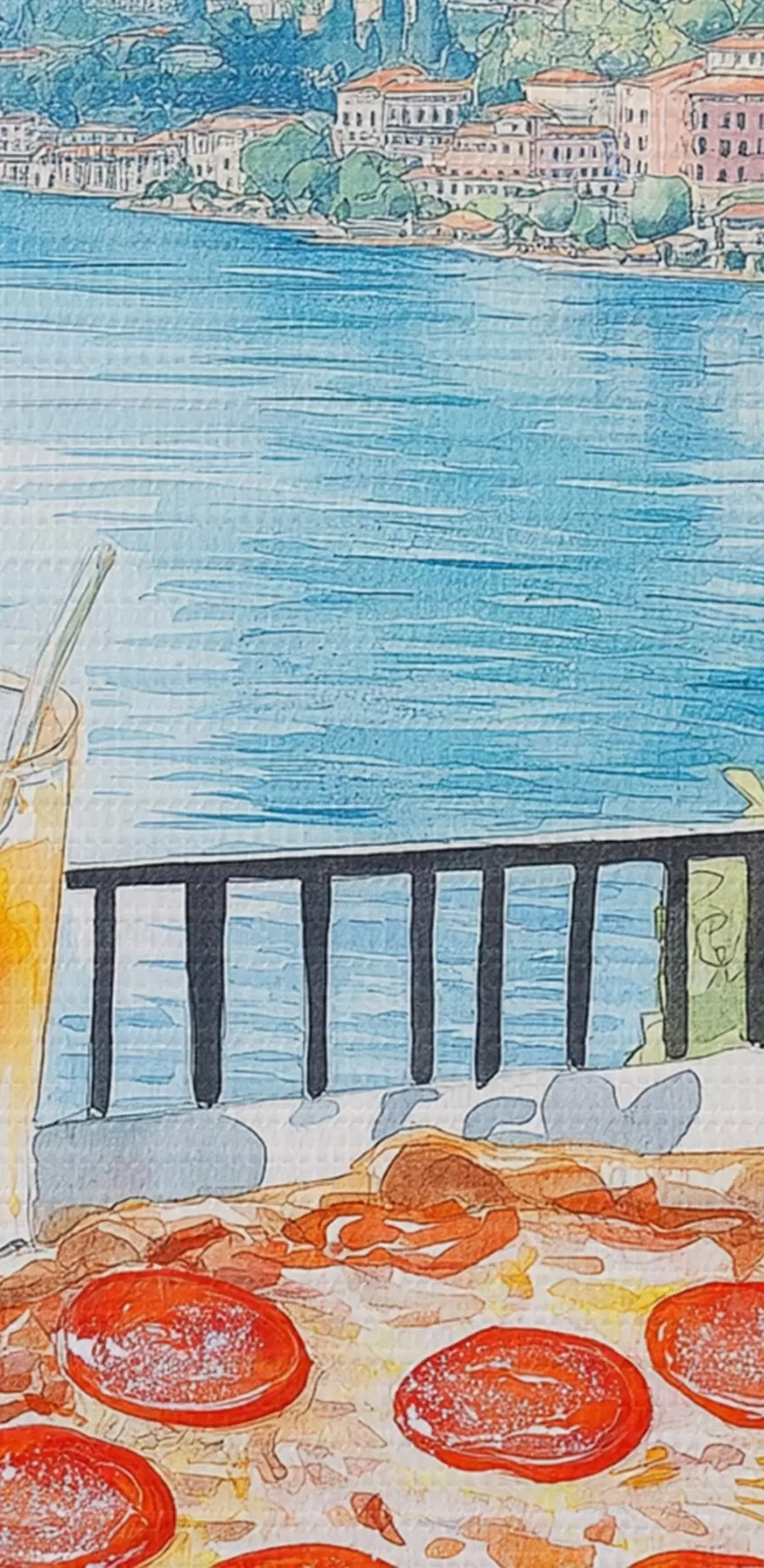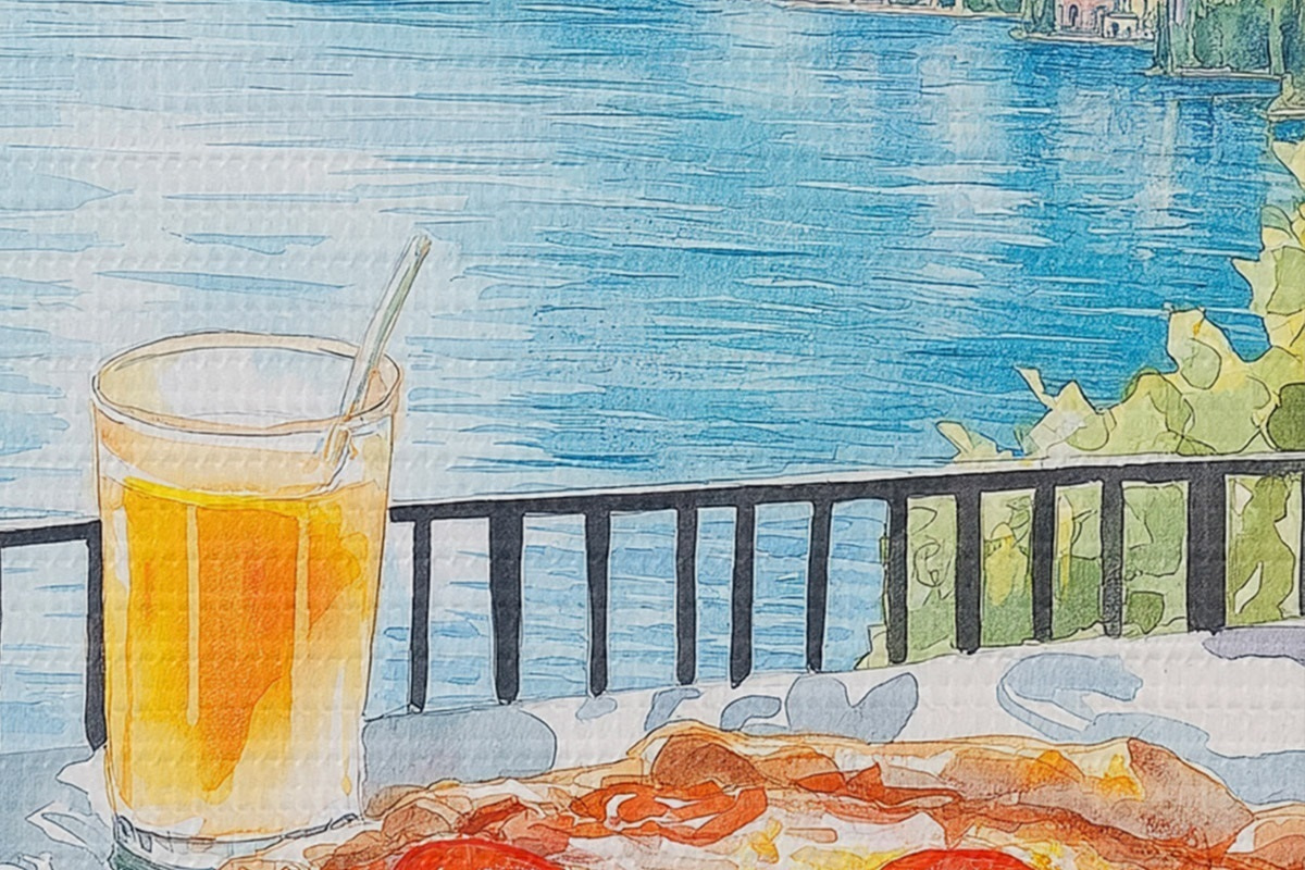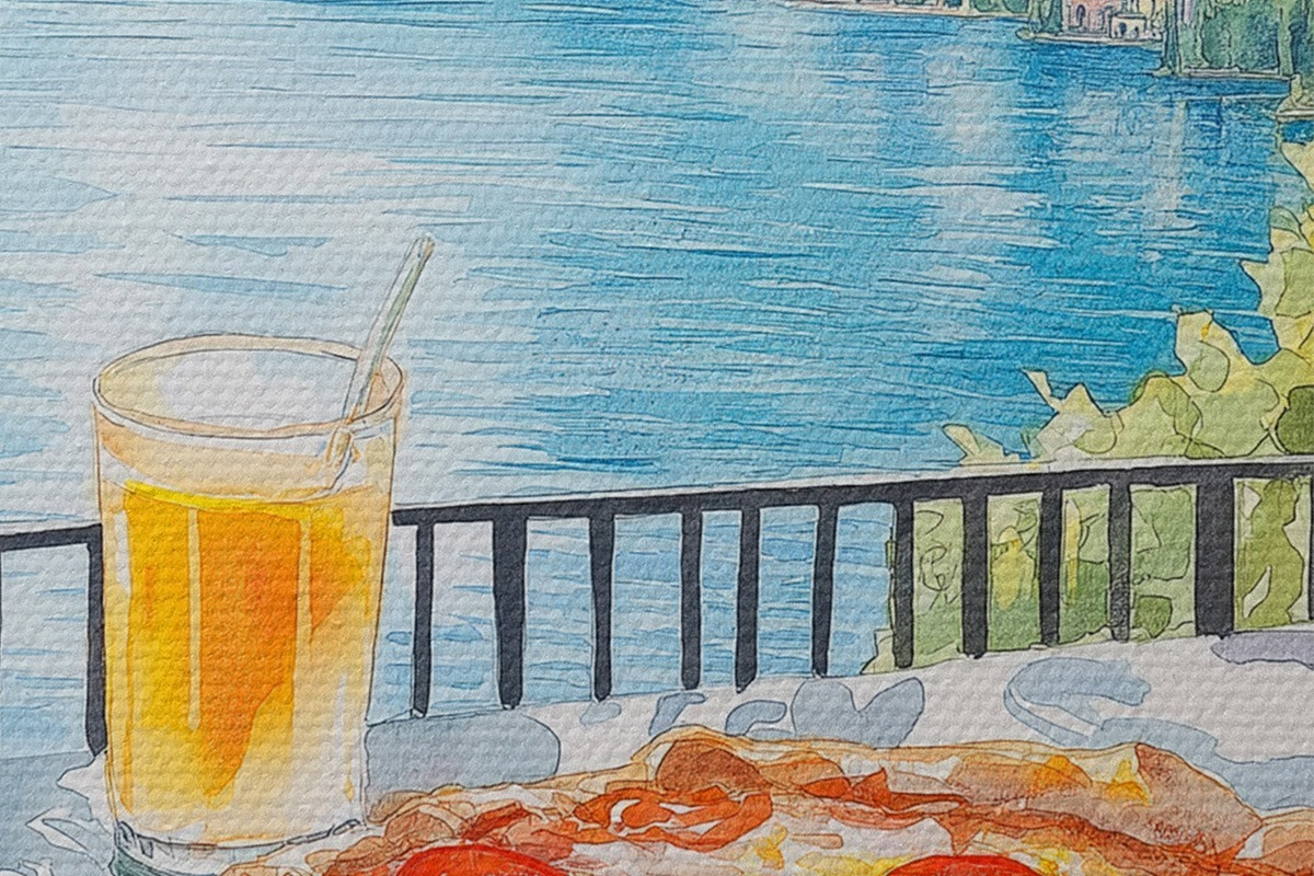 Foto Brunch en Italia, estilo acuarela, pizza margarita, lago, naturaleza de verano Nr r42436